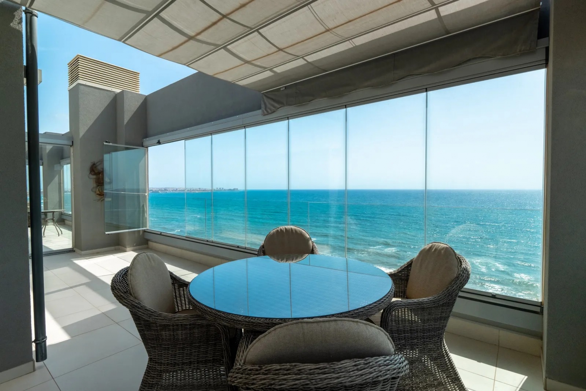 We are delighted to present this luxurious penthouse on the first line of the sea in Punta Prima! This stunning penthouse is located on the ninth floor and offers three bedrooms, two bathrooms and magnificent panoramic views of the Mediterranean Sea! With sea views from every room, the horizon extends into the entire home, where light flows freely through the large panoramic windows. The open plan layout connects the kitchen, living room and dining area into a harmonious whole – tailor-made for both relaxation and family dinners. The generous terrace, with both glazed and open areas, extends the living room and creates an ideal place for social events at sunset.