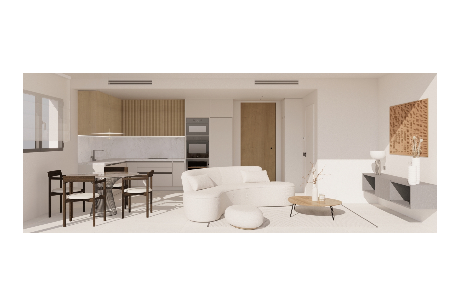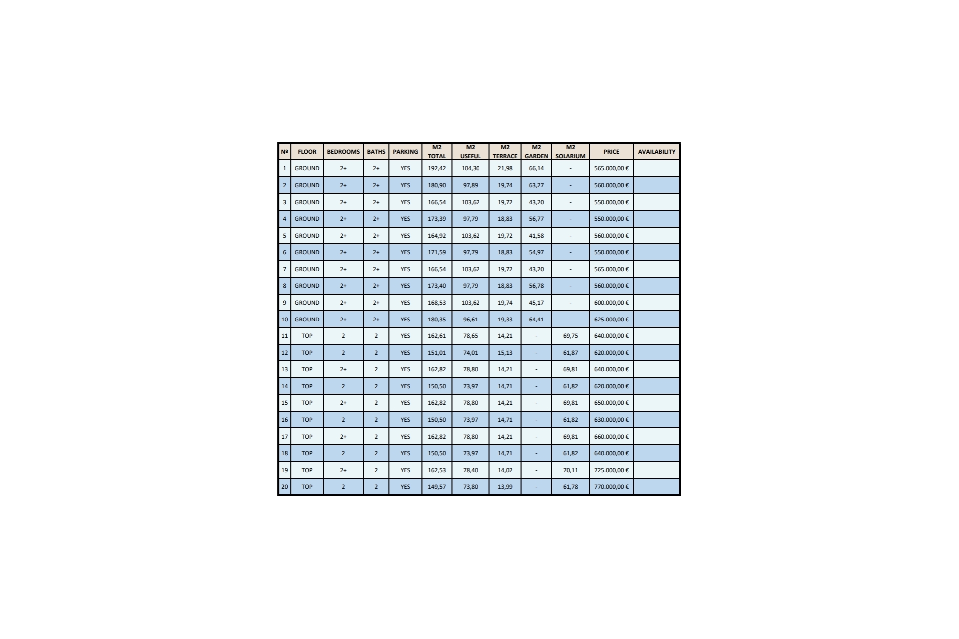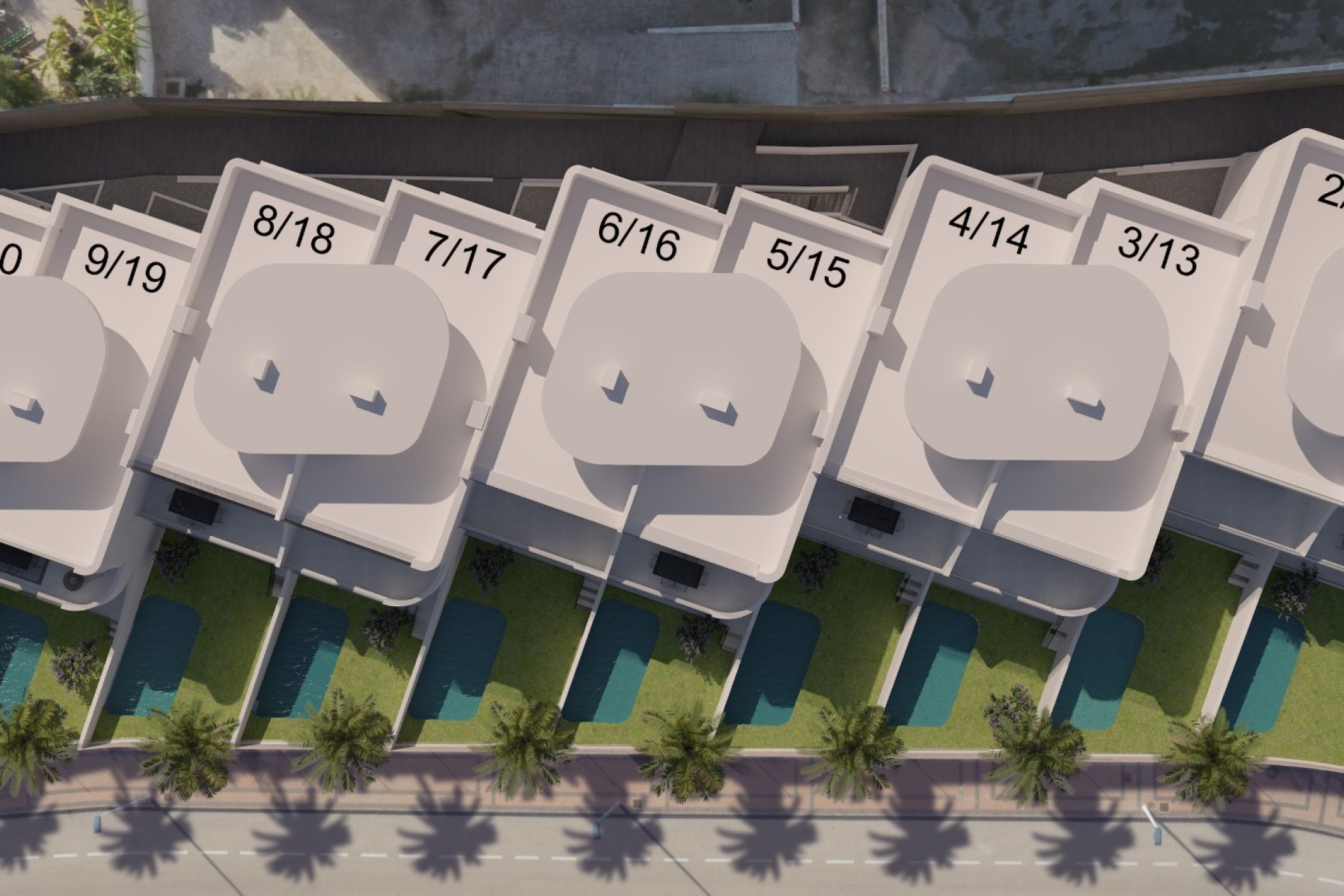 Este proyecto consta de bungalows, apartamentos en planta baja o primer piso, los apartamentos inferiores cuentan con jardín y terraza, y los superiores cuentan con terraza y solárium privado.