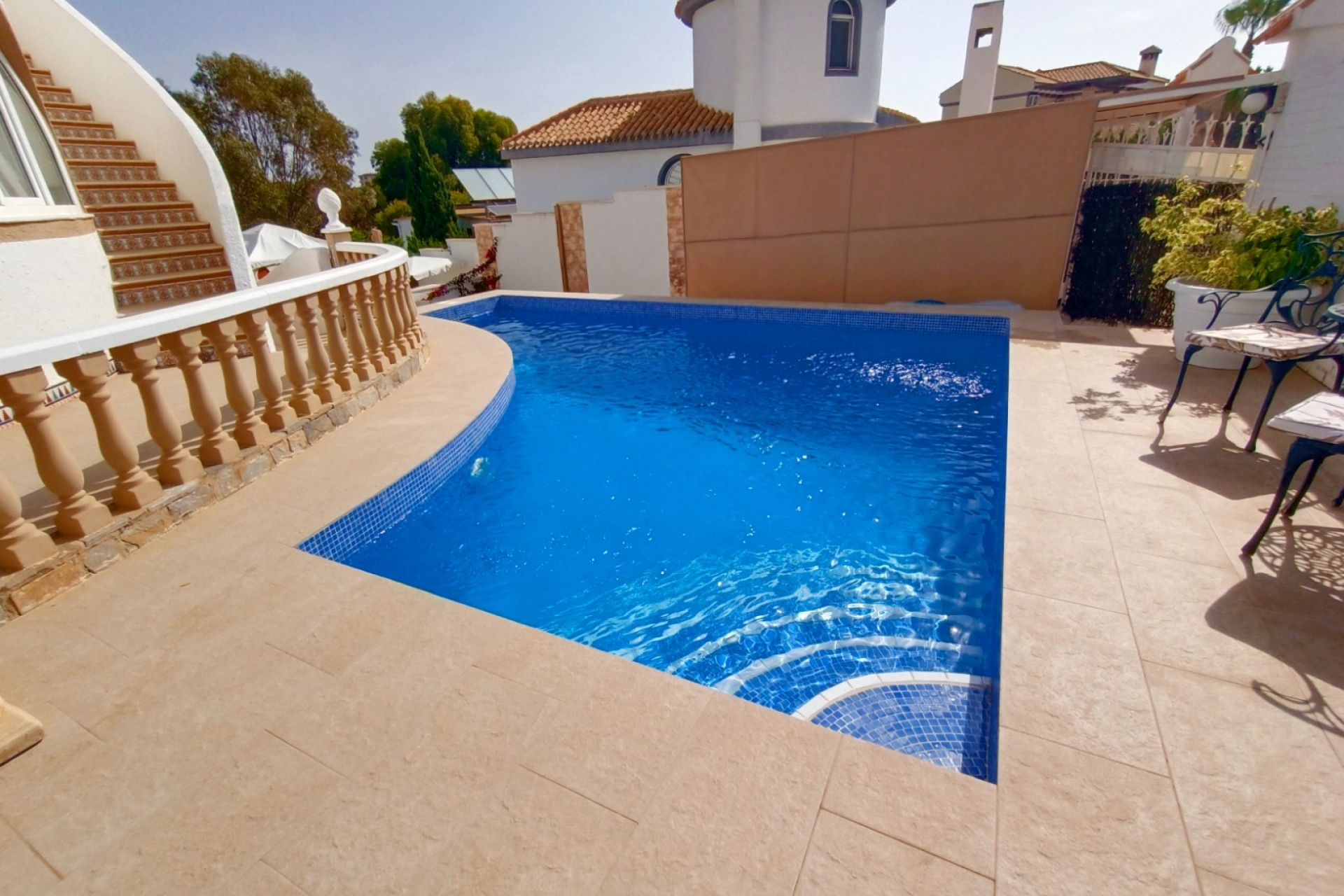 Le invitamos a visitar esta villa independiente en Playa de la Zenia, Orihuela Costa. Lista para entrar a vivir, a tan solo 650 metros de la playa. Cuenta con cuatro amplios dormitorios, tres baños, cocina americana, salón con chimenea y vistas a la piscina, piscina privada, porche cubierto con vistas a la piscina, aparcamiento para tres coches, lavadero, cuarto de lavado, una amplia terraza, aire acondicionado y ventanas de PVC con doble acristalamiento. La villa, de estilo español, se encuentra en excelentes condiciones, tanto estéticas como técnicas, y cuenta con todos los servicios necesarios en las inmediaciones. Su ubicación es uno de los destinos vacacionales más codiciados, lo que la convierte en una inversión muy atractiva.