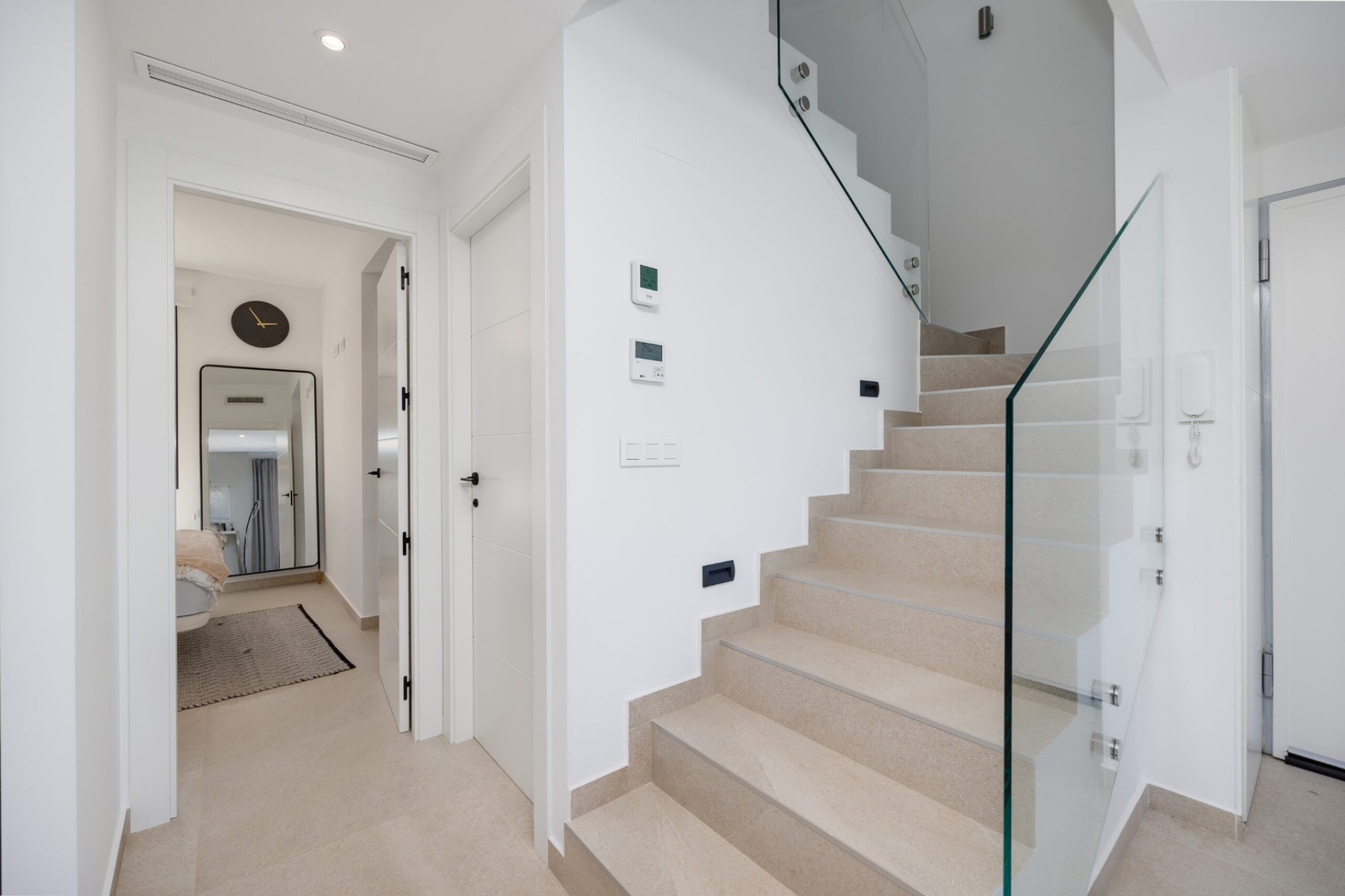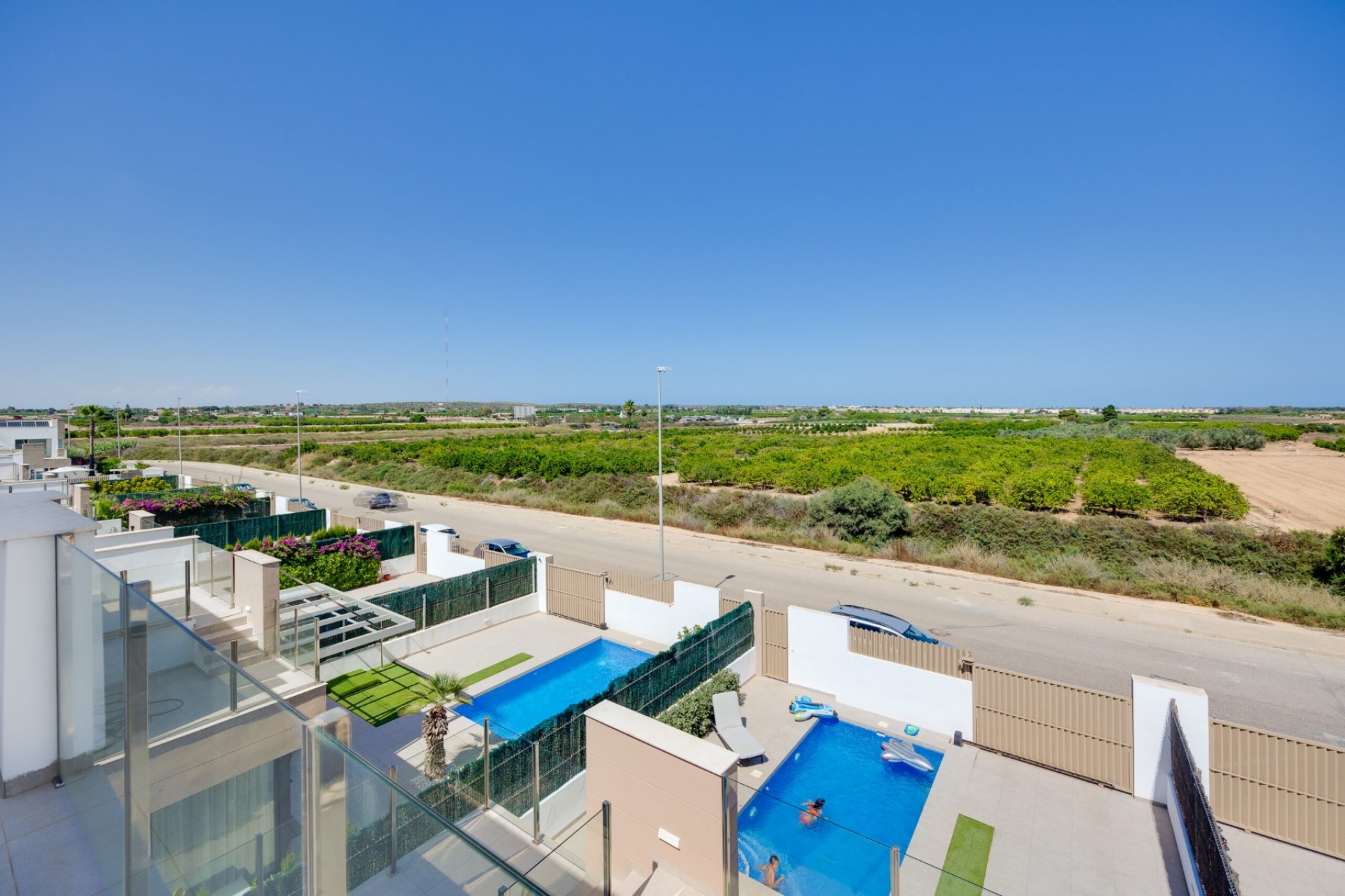 Impresionante villa moderna ubicada en Guardamar del Segura, que ofrece 178 m² de elegante espacio habitable. La propiedad cuenta con 3 amplios dormitorios, 3 baños, tres terrazas y un solárium privado en la azotea, ideal para relajarse o disfrutar con invitados mientras se contemplan vistas abiertas a la naturaleza.