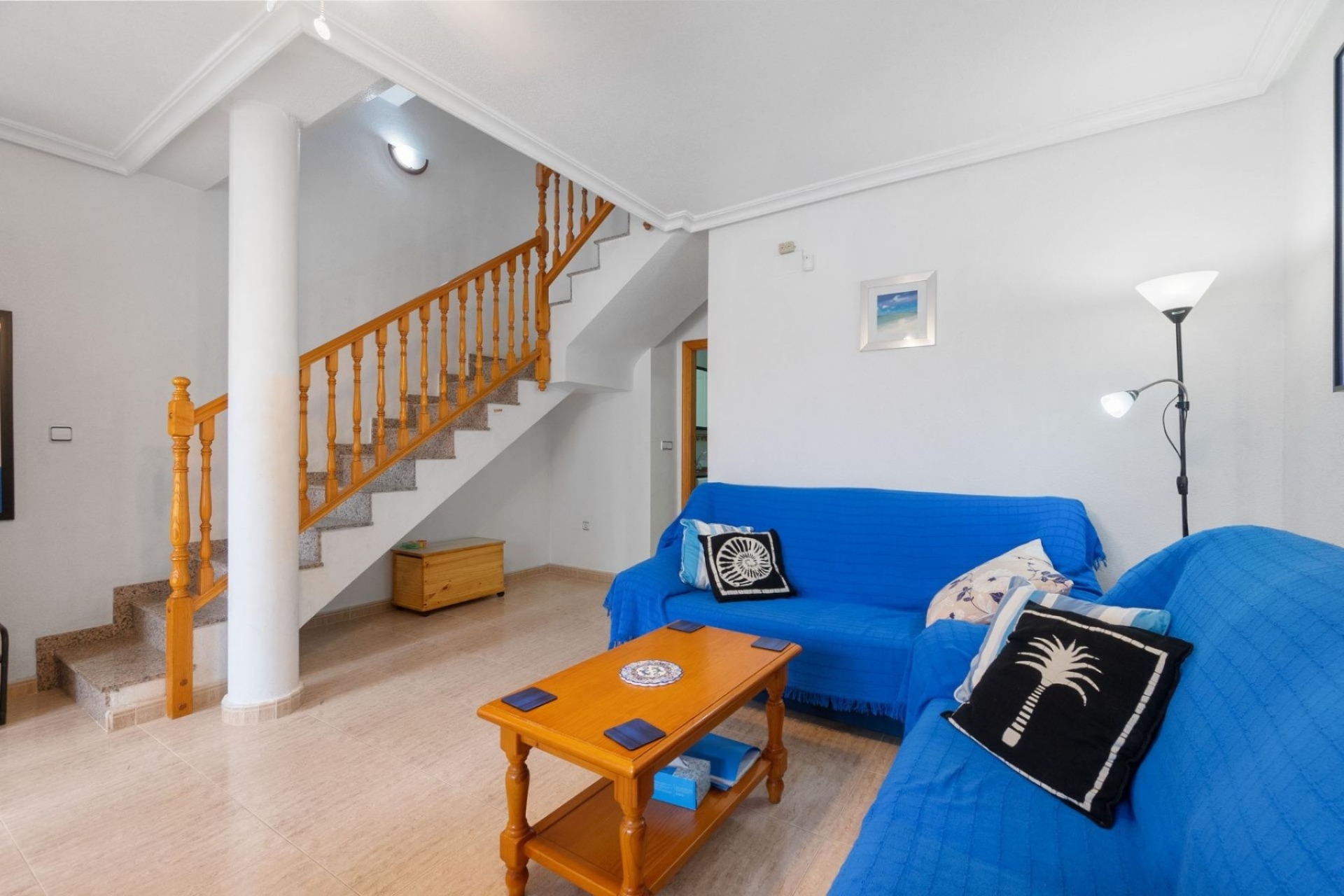 Duplex w Aguamarina, Cabo Roig, położony 300 m od promenady. Nieruchomość na trzech piętrach, o powierzchni 82 m2, składa się z 3 sypialni, dużego salonu, oddzielnej kuchni, dwóch łazienek, jednej z prysznicem i jednej z wanną, przedniego tarasu, ogrodu z miejscem do parkowania samochodu i solarium z widokiem na morze. Od strony północnej. Nieruchomość jest sprzedawana umeblowana. Z kuchni mamy wyjście na patio o powierzchni około 8m2. To tylko kilka minut spacerem od supermarketów, banków, aptek i licznych barów, restauracji i linii autobusowych.