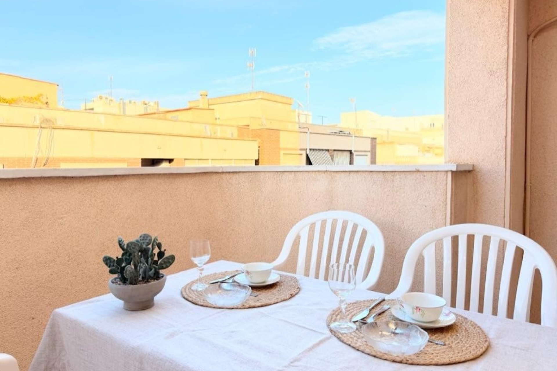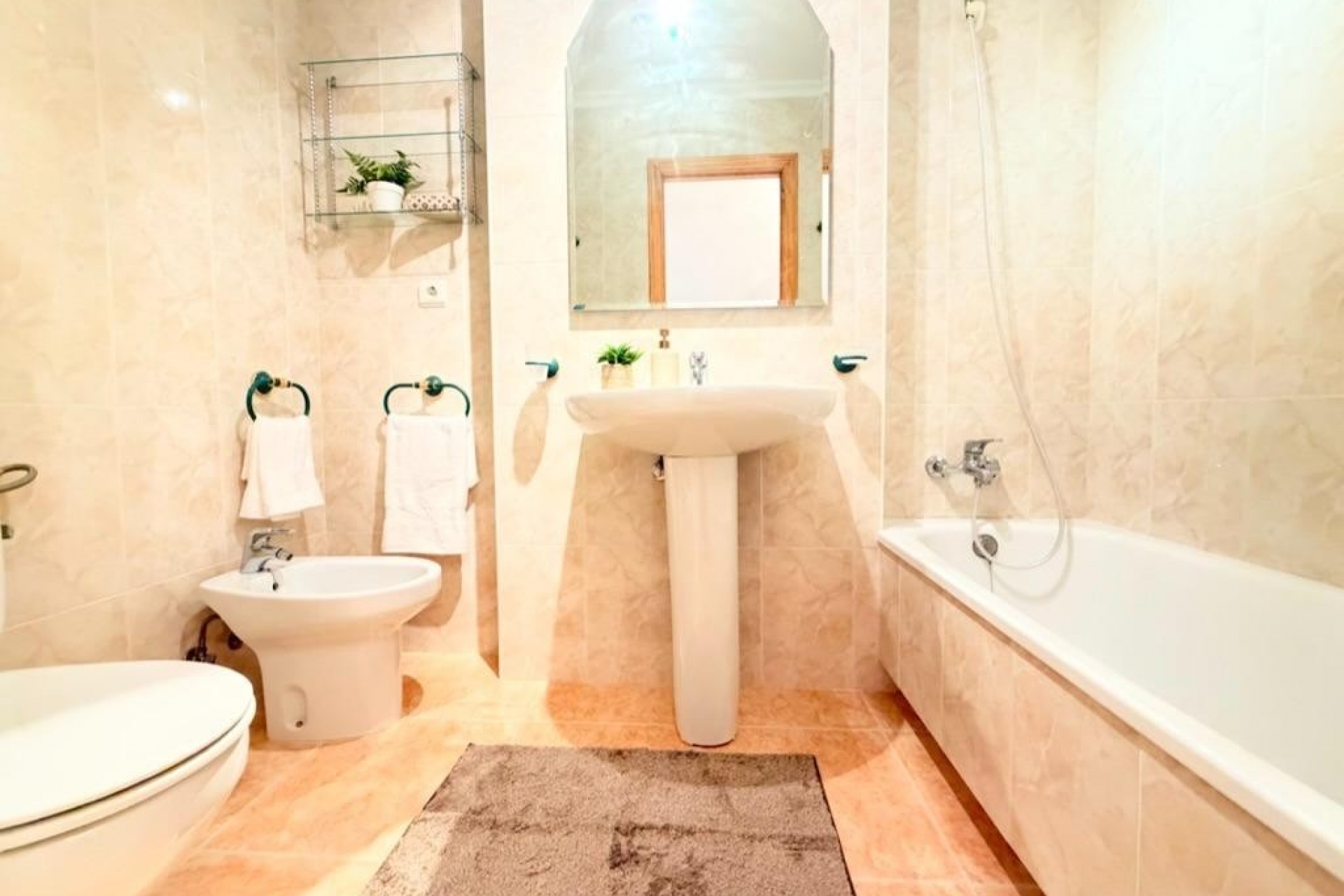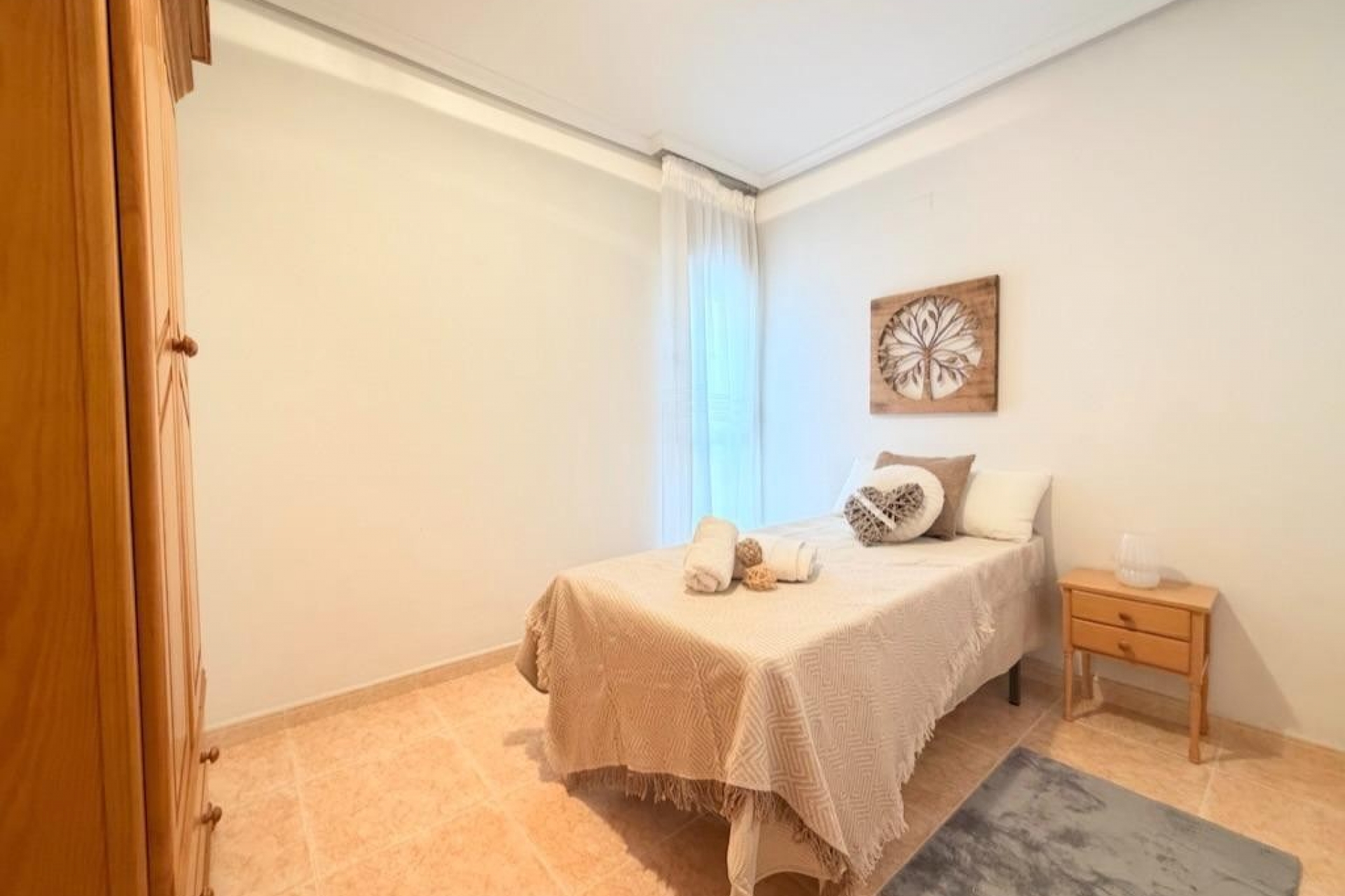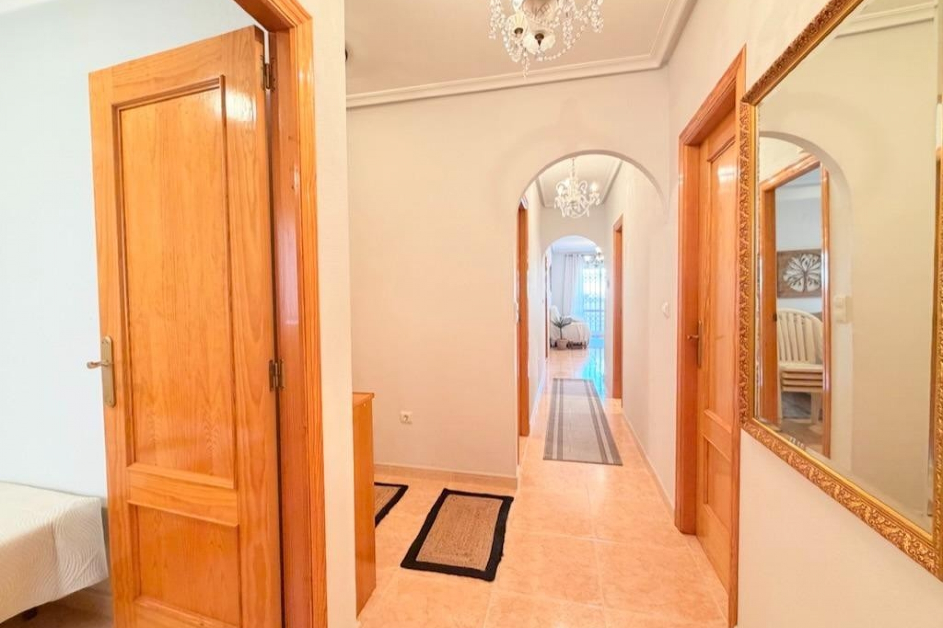Mieszkanie oferuje trzy sypialnie położone od strony wewnętrznej budynku, co zapewnia ciszę i spokój, a także dwie kompletne łazienki wykończone w nowoczesnym stylu. Oddzielna, w pełni wyposażona kuchnia jest funkcjonalna i wygodna w użytkowaniu. Przestronny salon z jadalnią zachwyca ilością naturalnego światła i posiada bezpośrednie wyjście na słoneczny taras – idealne miejsce do relaksu i korzystania z klimatu śródziemnomorskiego przez cały rok.