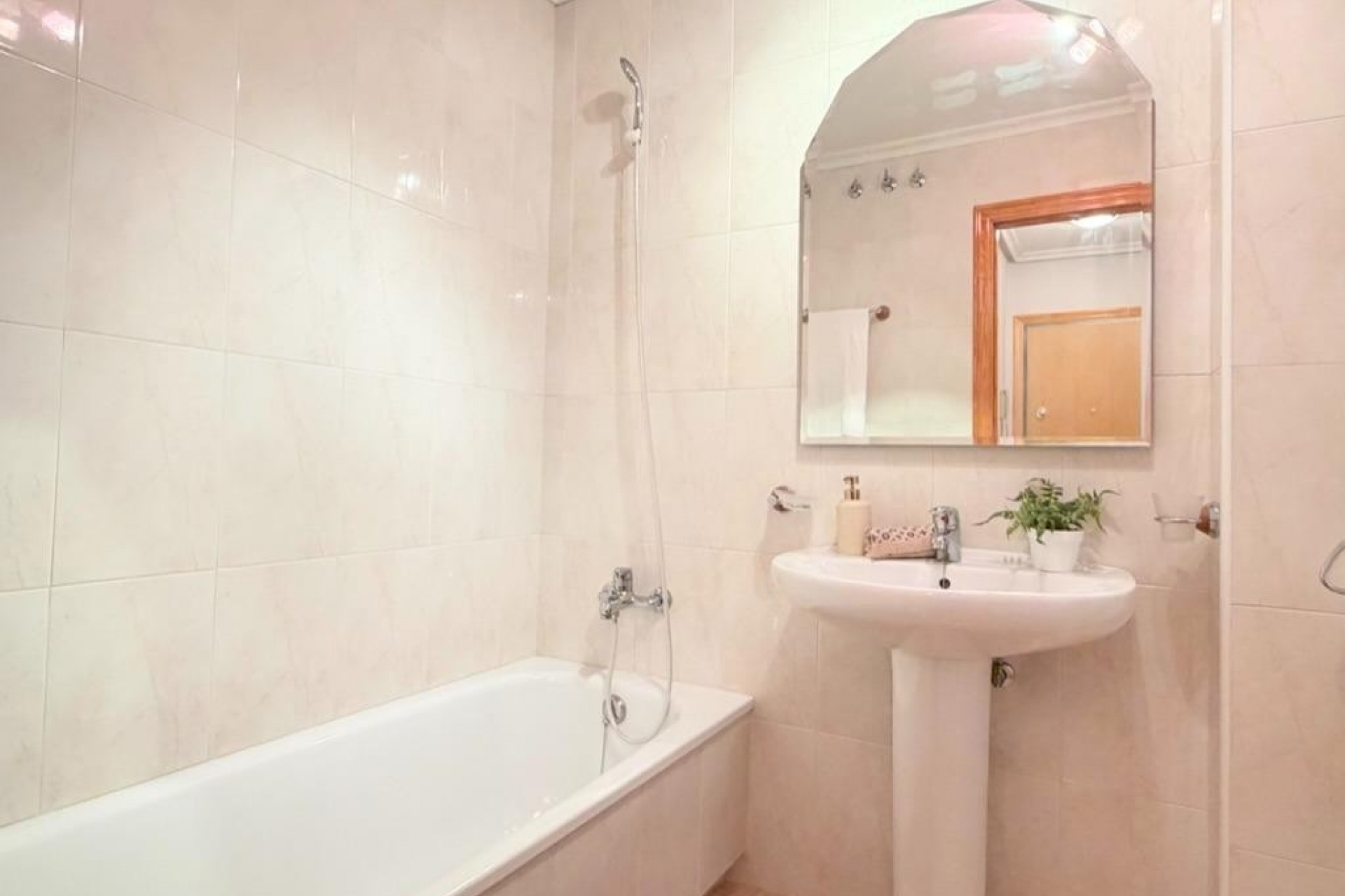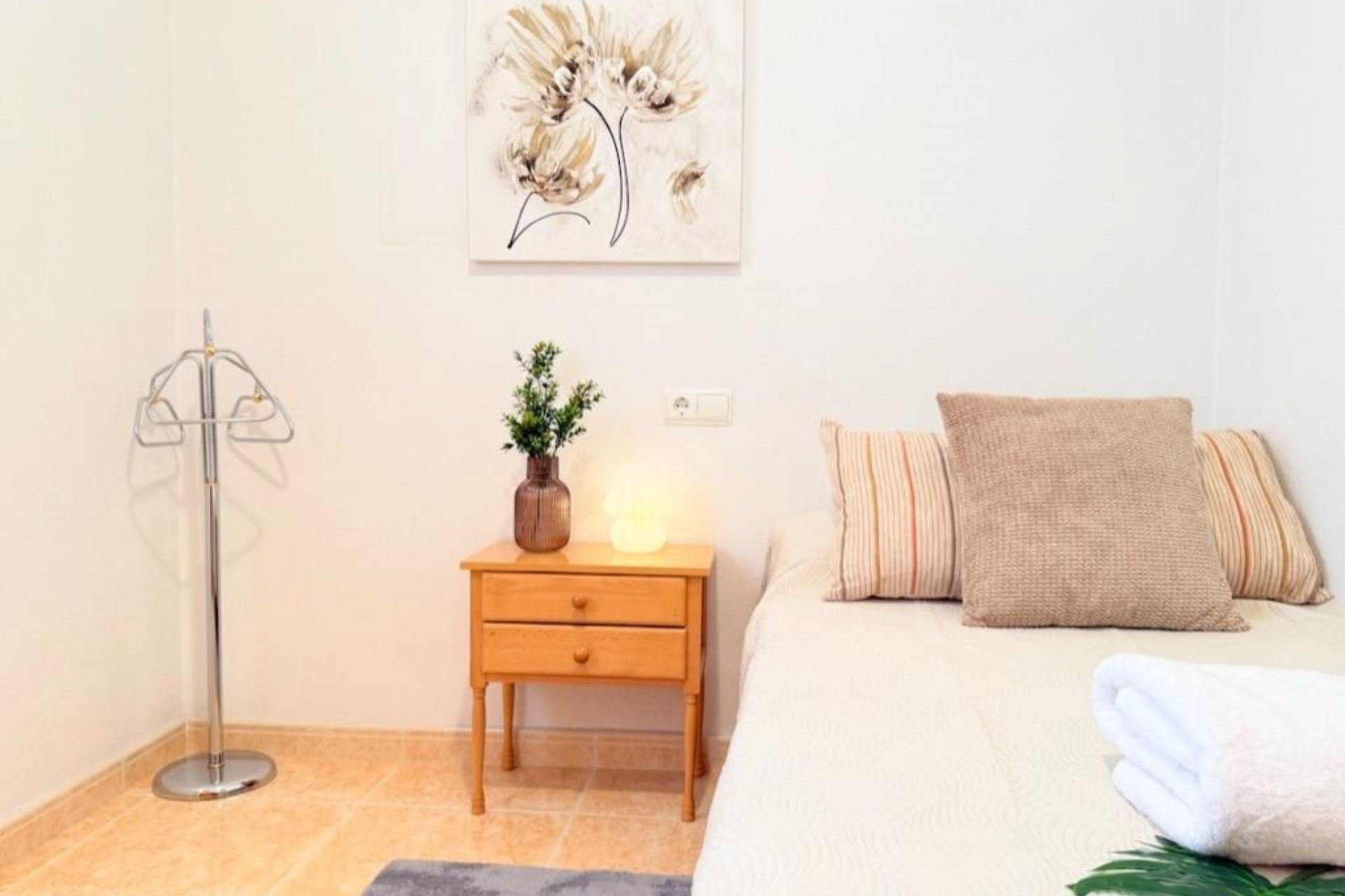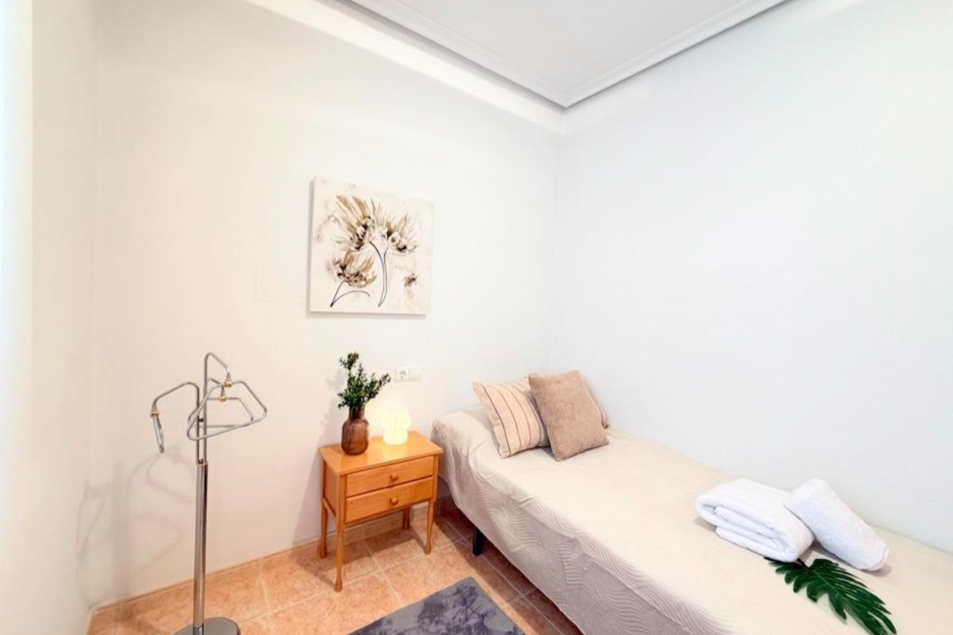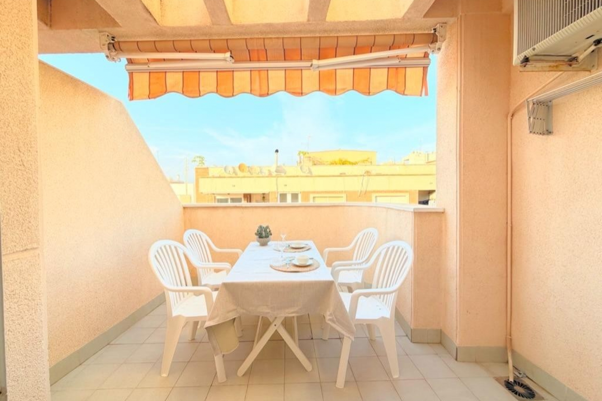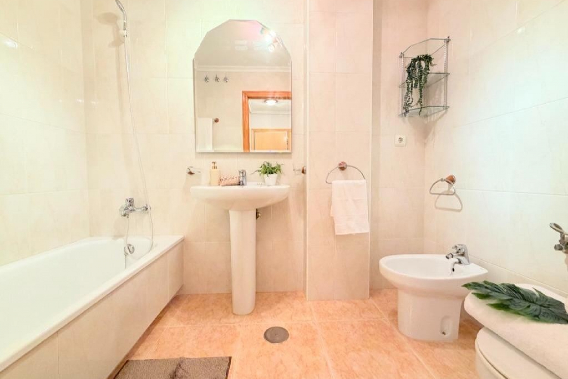 Mieszkanie oferuje trzy sypialnie położone od strony wewnętrznej budynku, co zapewnia ciszę i spokój, a także dwie kompletne łazienki wykończone w nowoczesnym stylu. Oddzielna, w pełni wyposażona kuchnia jest funkcjonalna i wygodna w użytkowaniu. Przestronny salon z jadalnią zachwyca ilością naturalnego światła i posiada bezpośrednie wyjście na słoneczny taras – idealne miejsce do relaksu i korzystania z klimatu śródziemnomorskiego przez cały rok.