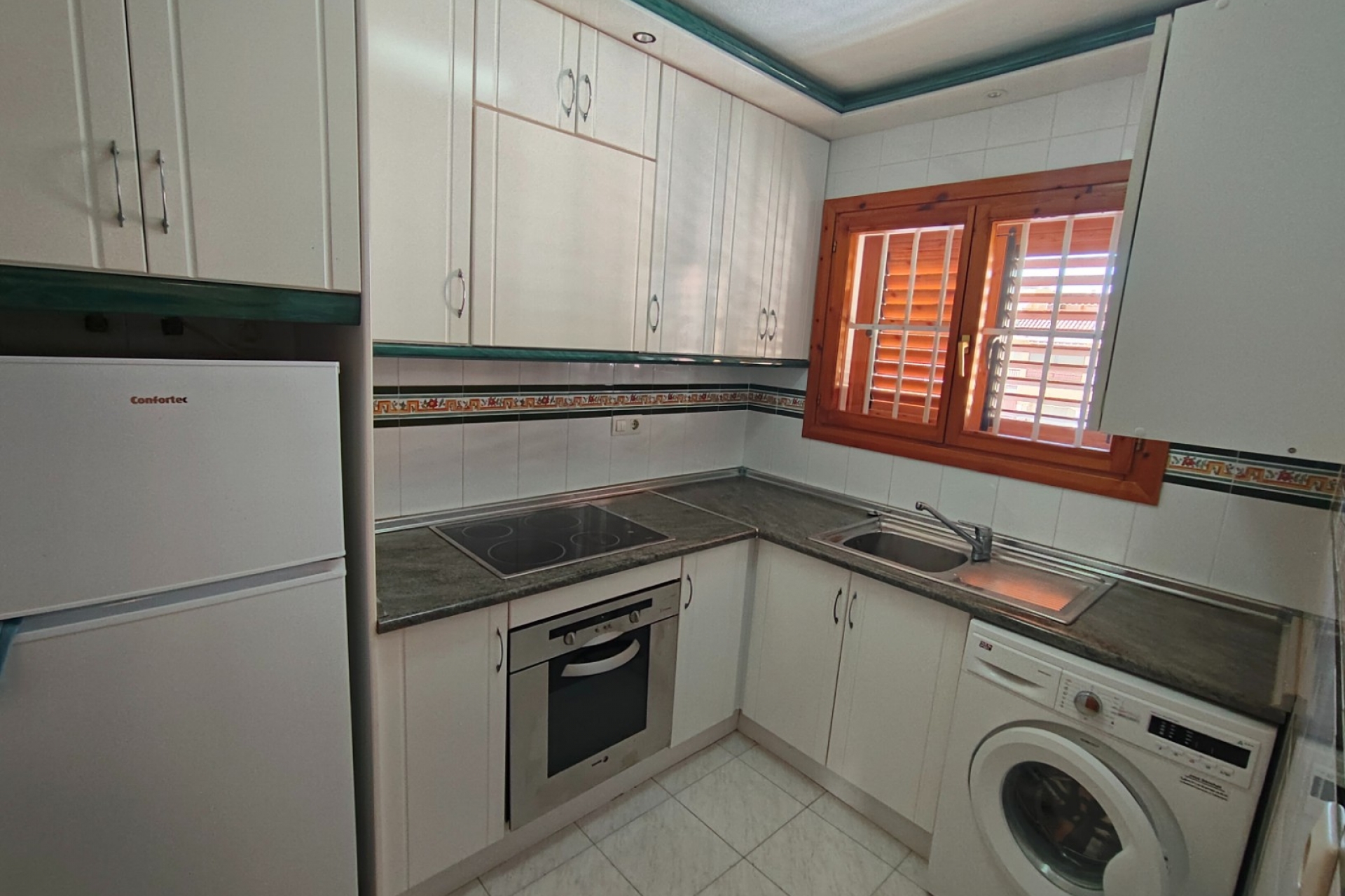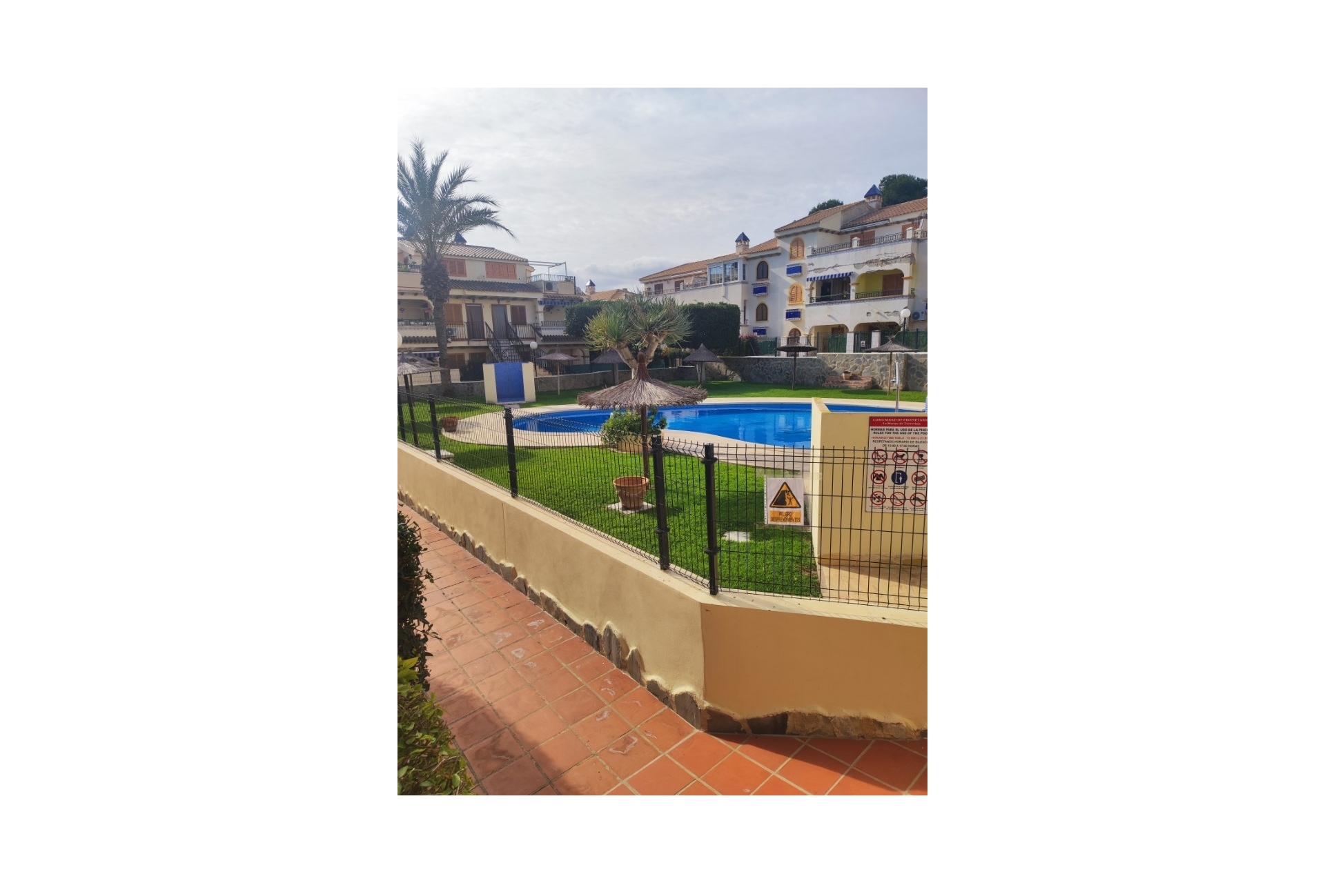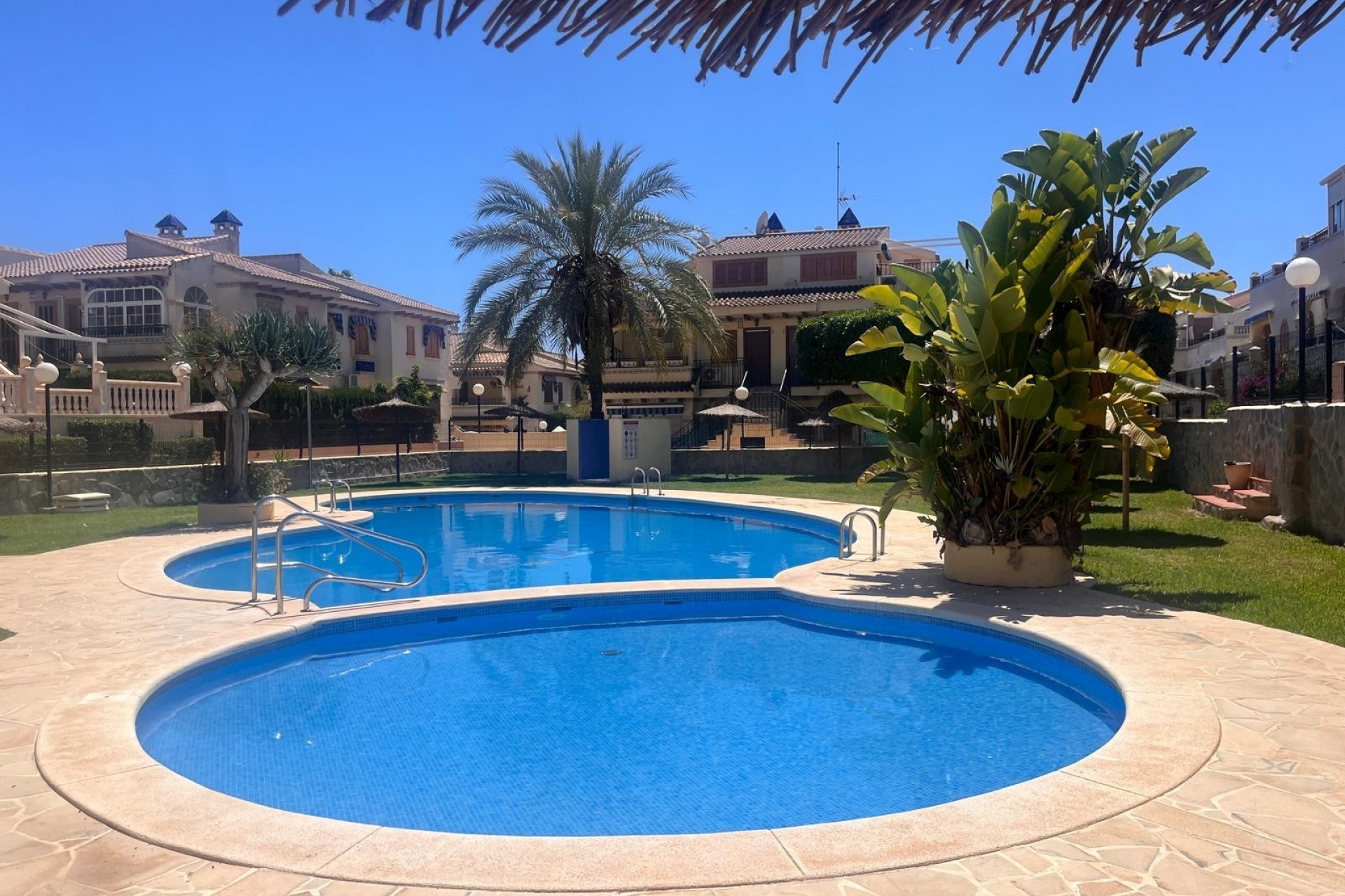 Wspólny basen położony jest w bujnej zieleni, z naturalną trawą, bujną roślinnością i strzechowymi parasolami. To miejsce, w którym relaks przychodzi naturalnie. Morze znajduje się w zasięgu krótkiego spaceru, podobnie jak centrum handlowe z supermarketami Mercadona i Aldi, a także kilkoma restauracjami i barami. Wszystko, czego potrzebujesz, jest w zasięgu ręki, łącznie z transportem publicznym.