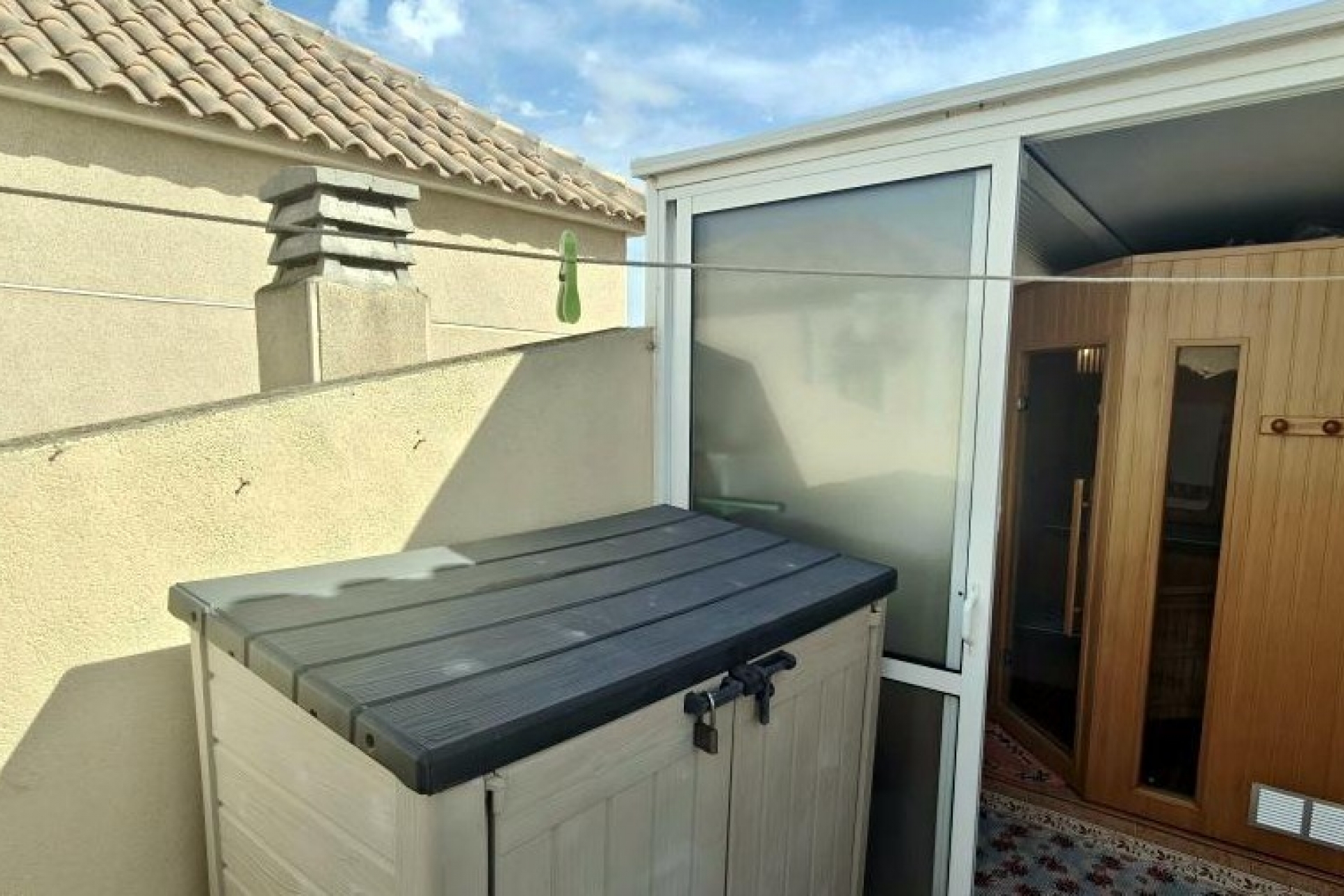 Na piętrze mieści się sypialnia, łazienka oraz prywatny taras na dachu z wydzieloną częścią, w której znajduje się wysokiej jakości sauna fińska.