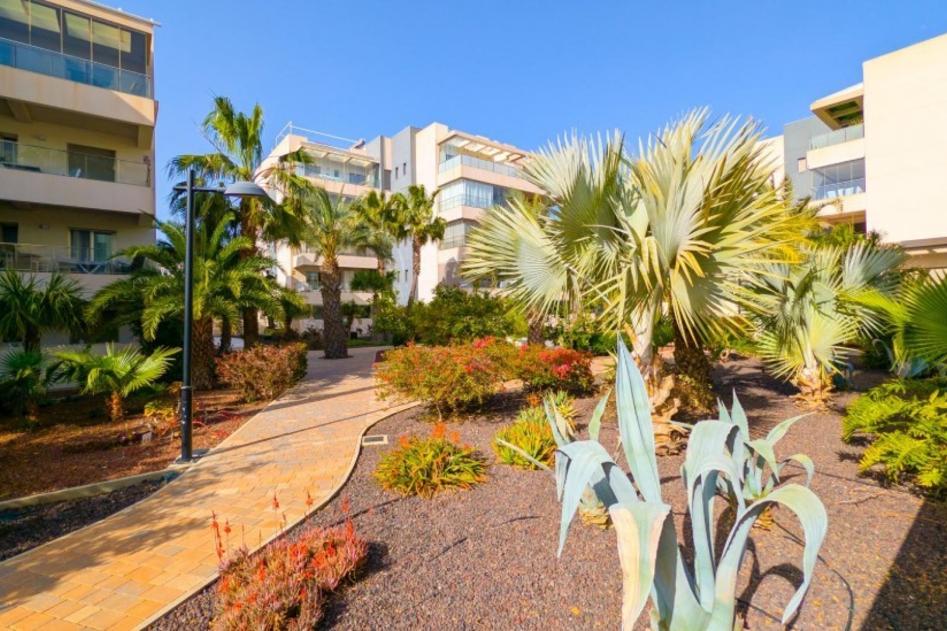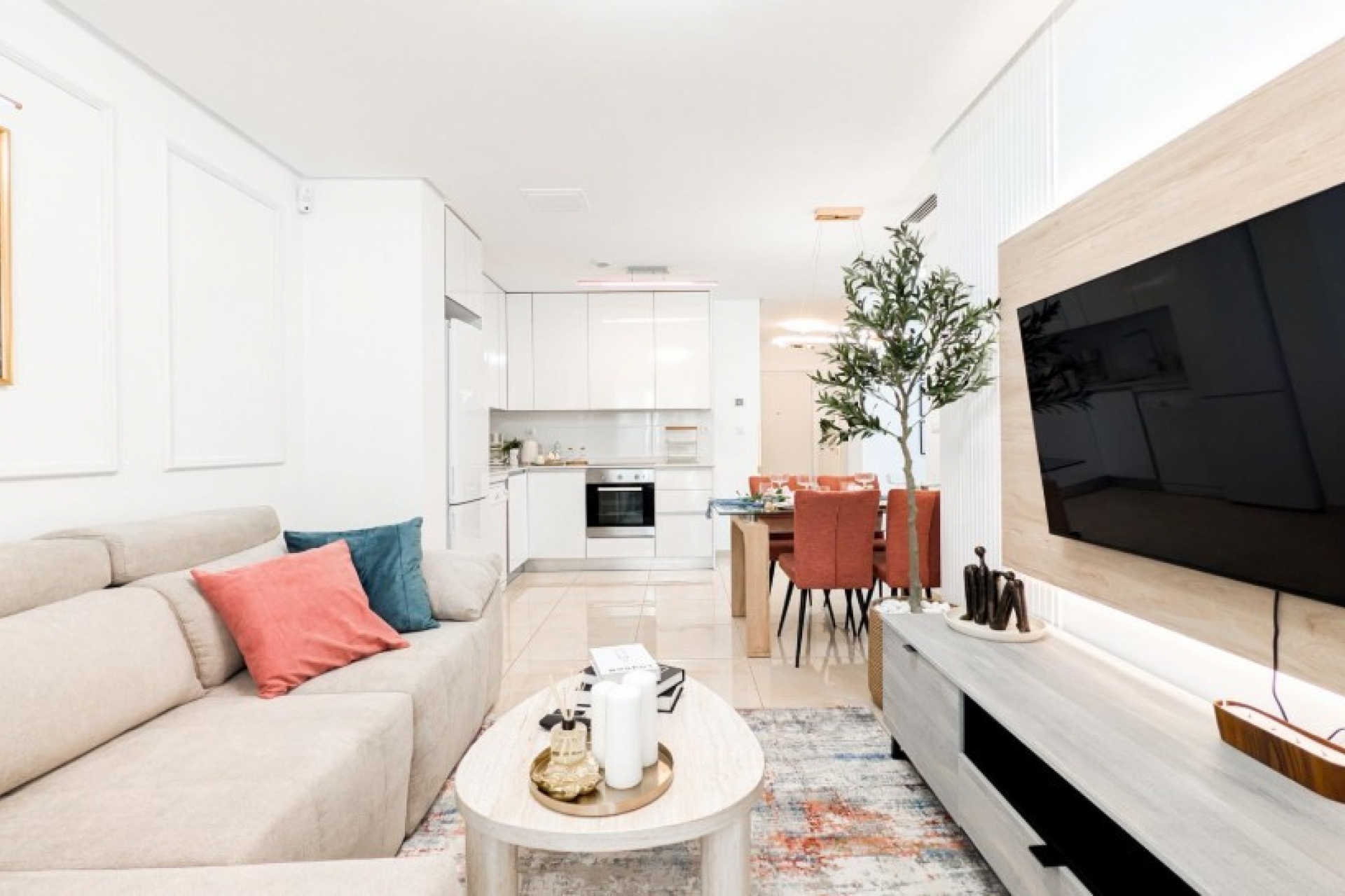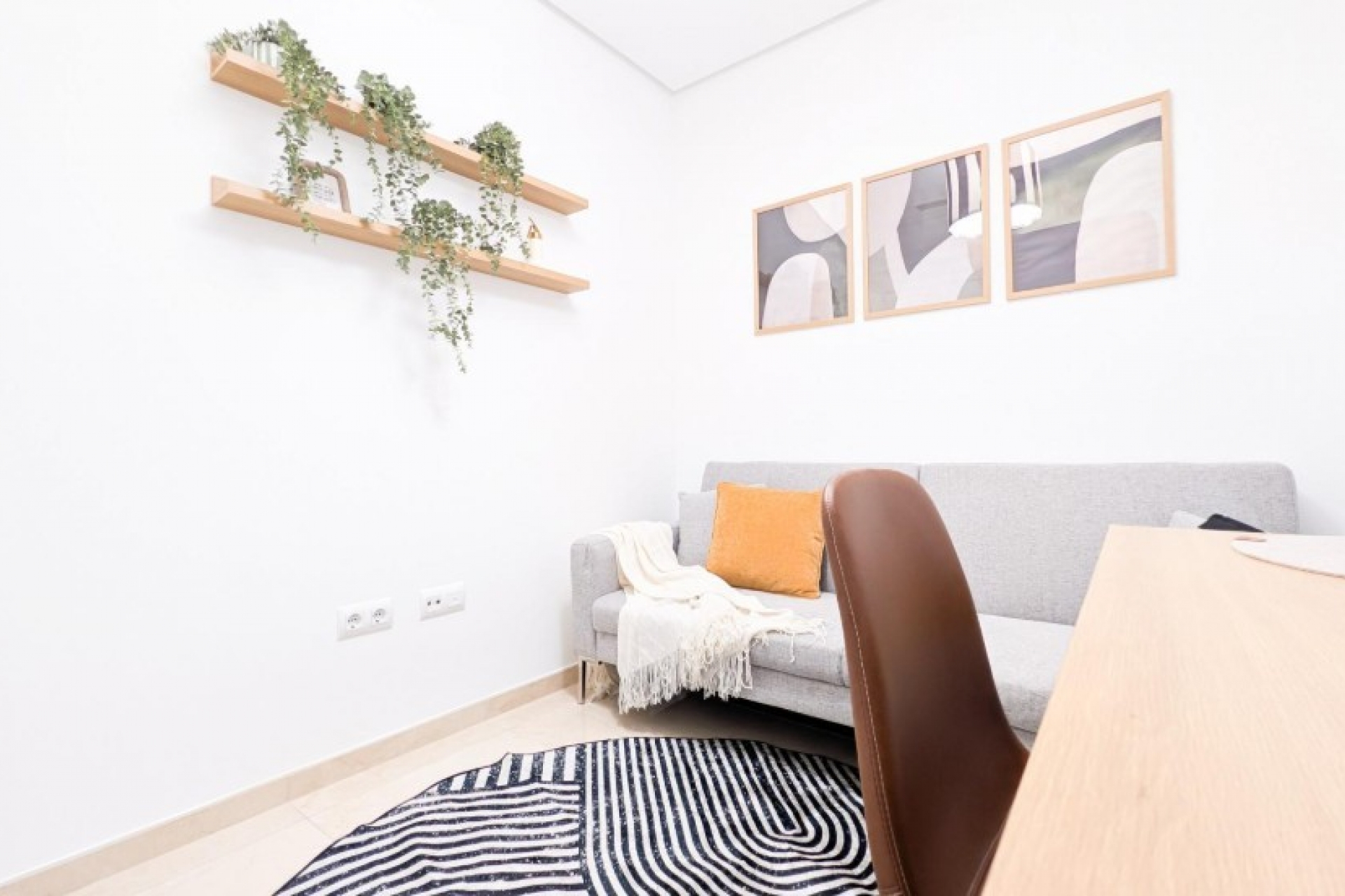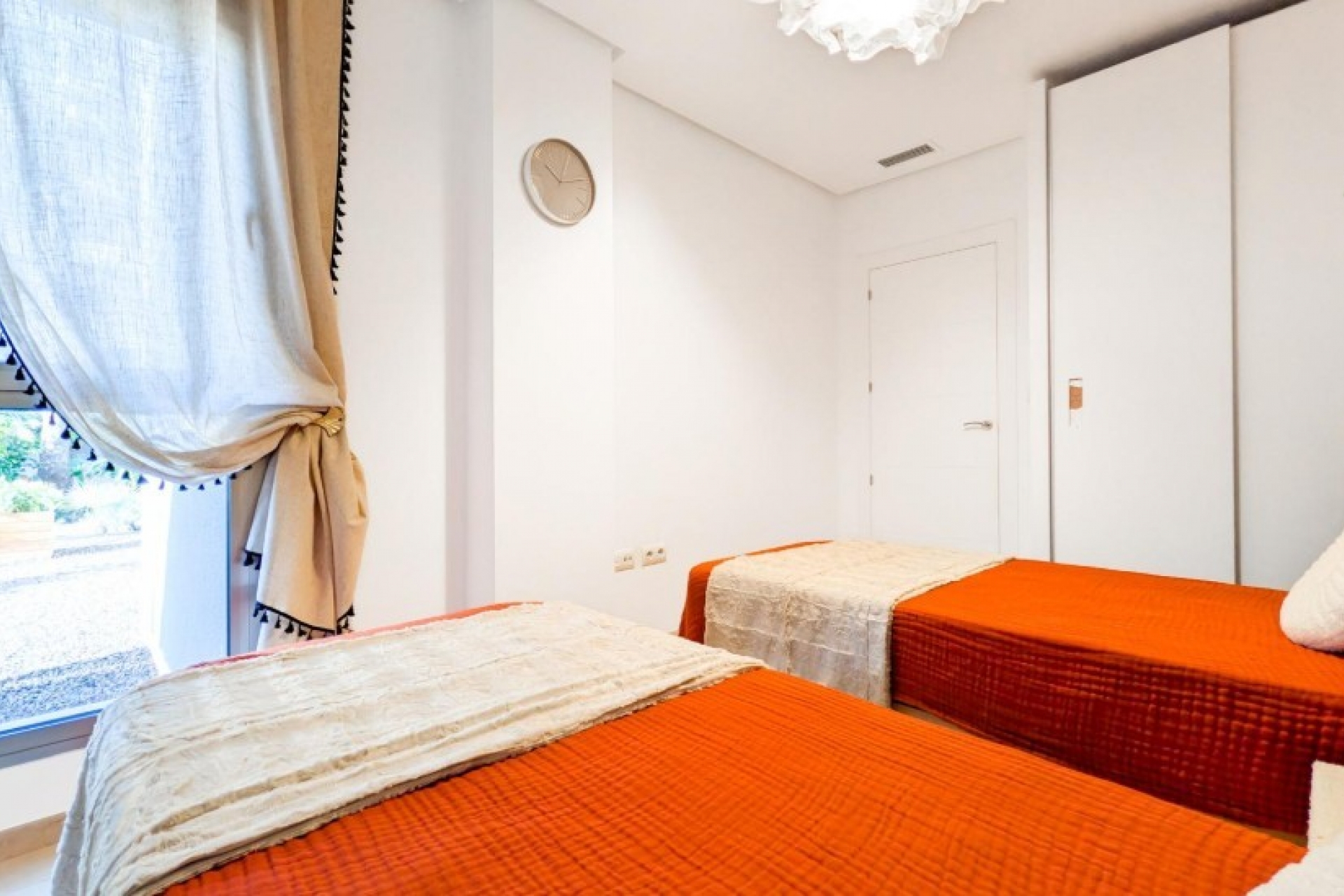 Posiada trzy sypialnie, dwie łazienki oraz kuchnię połączoną z salonem, z którego można wyjść na prywatny taras.
