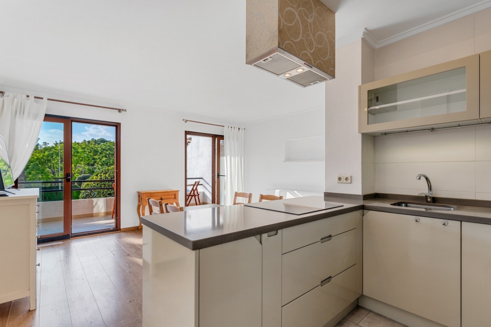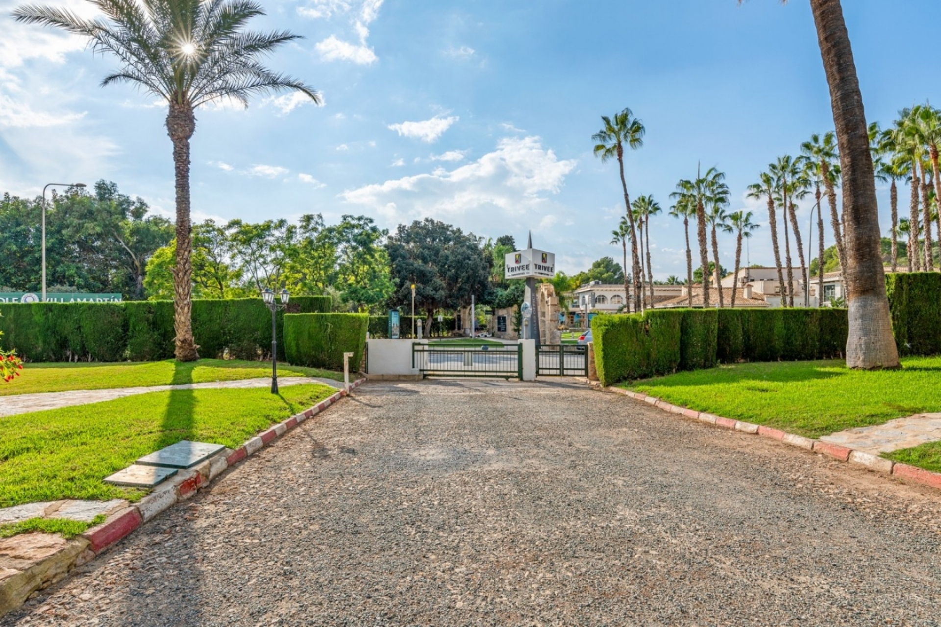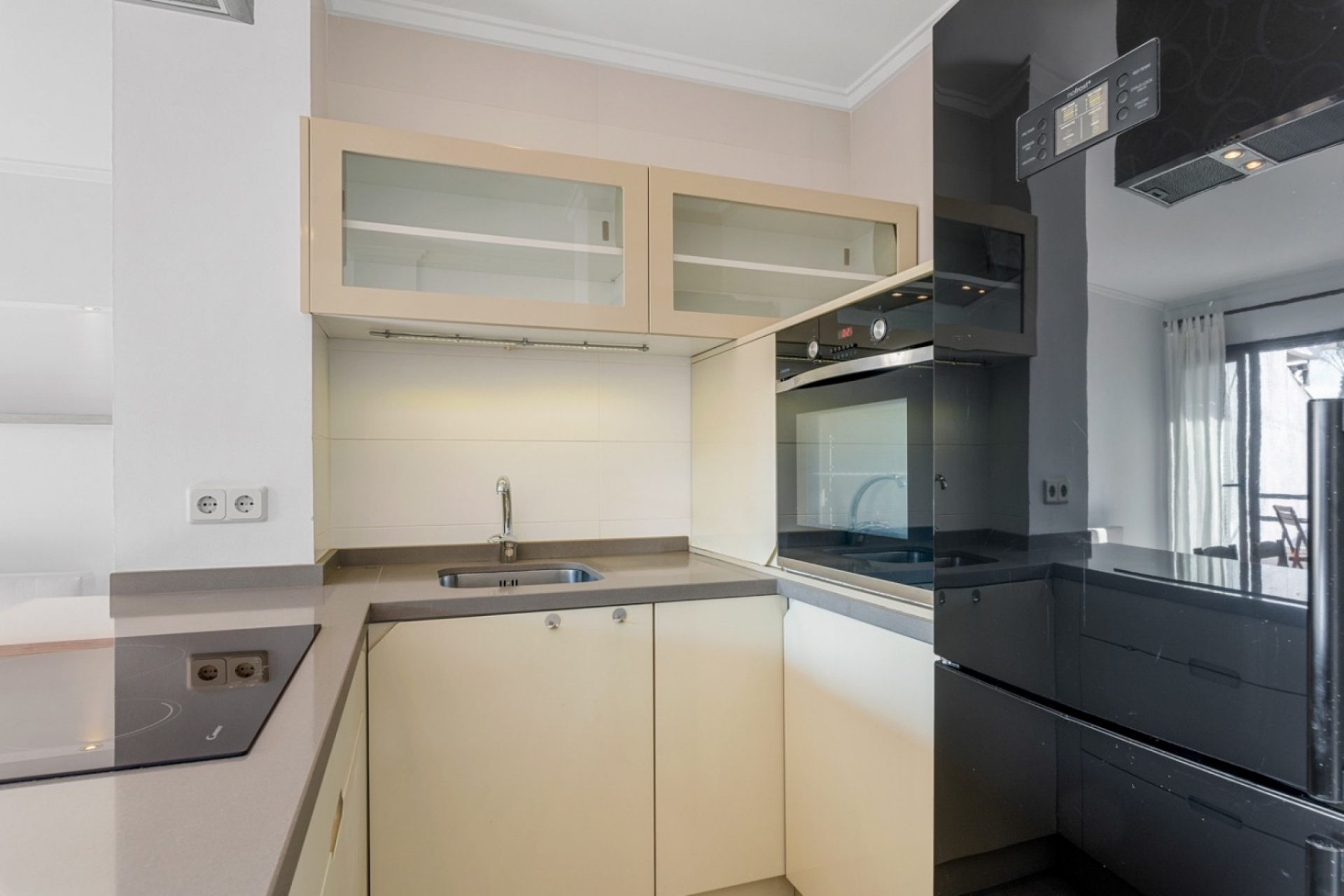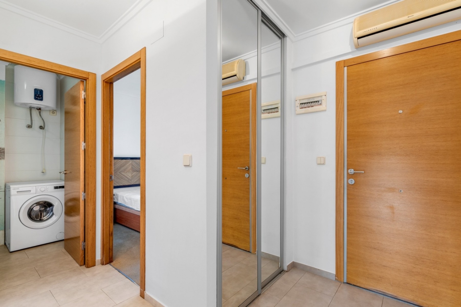 Apartment has one bedroom, one bathroom and an open plan living room and kitchen. The bedroom is exterior and has a built-in closet and ceiling fan. The hall also has a built-in closet next to the entrance. The living room has access to a 10.31 balcony with great views of the green communal gardens. The apartment, located on the second floor, has air conditioning. The kitchen and bathroom have been renovated. The residential is very close to the golf course of Villamartin and has communal parking under canopy and large landscaped areas.