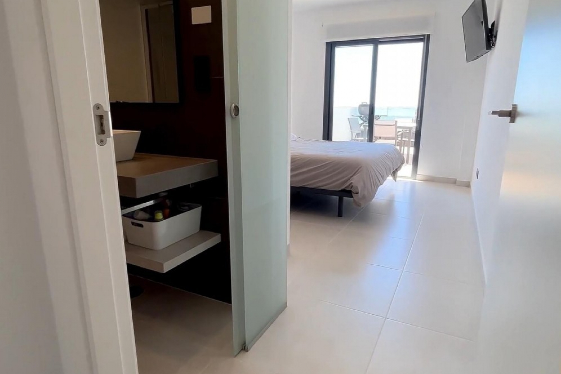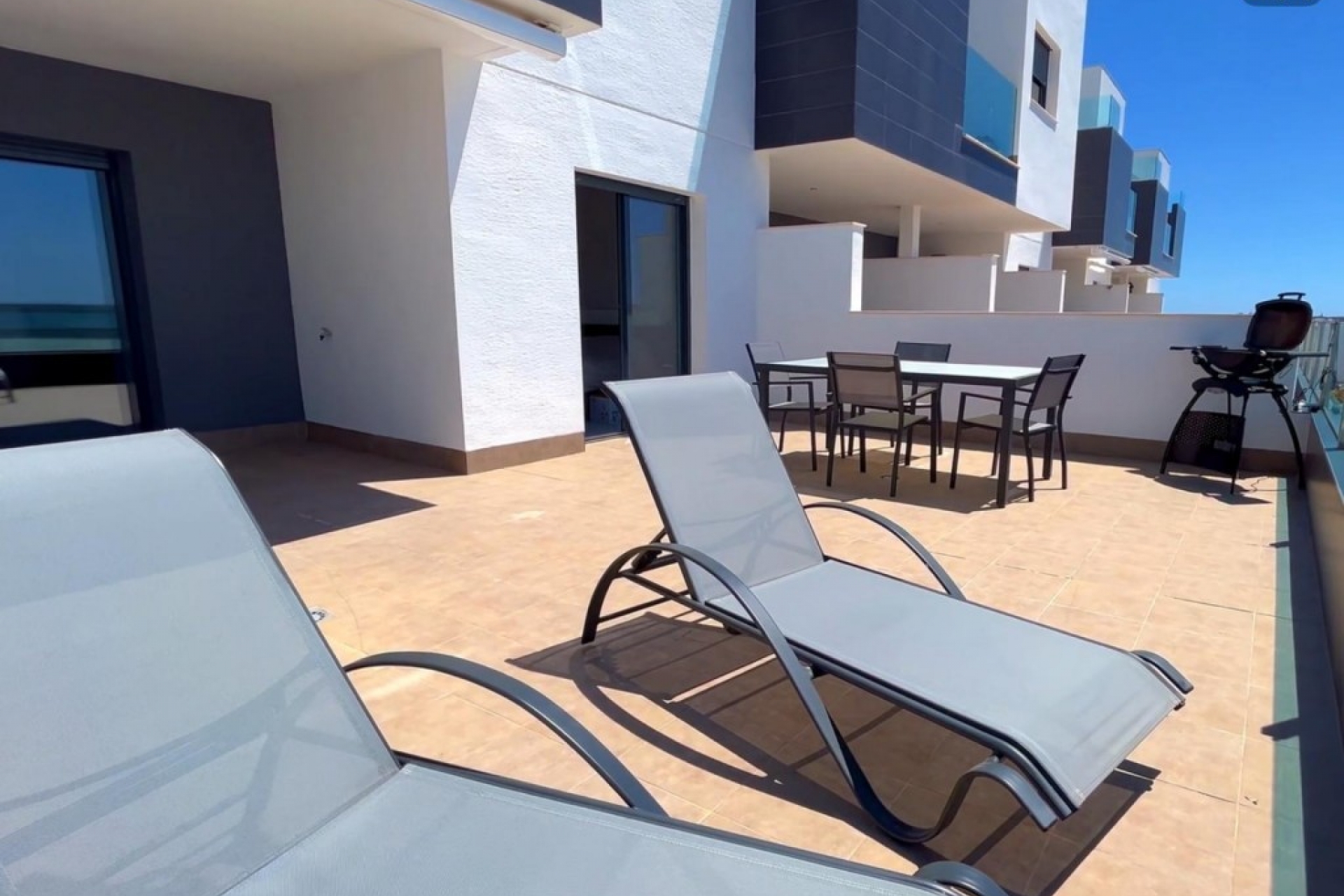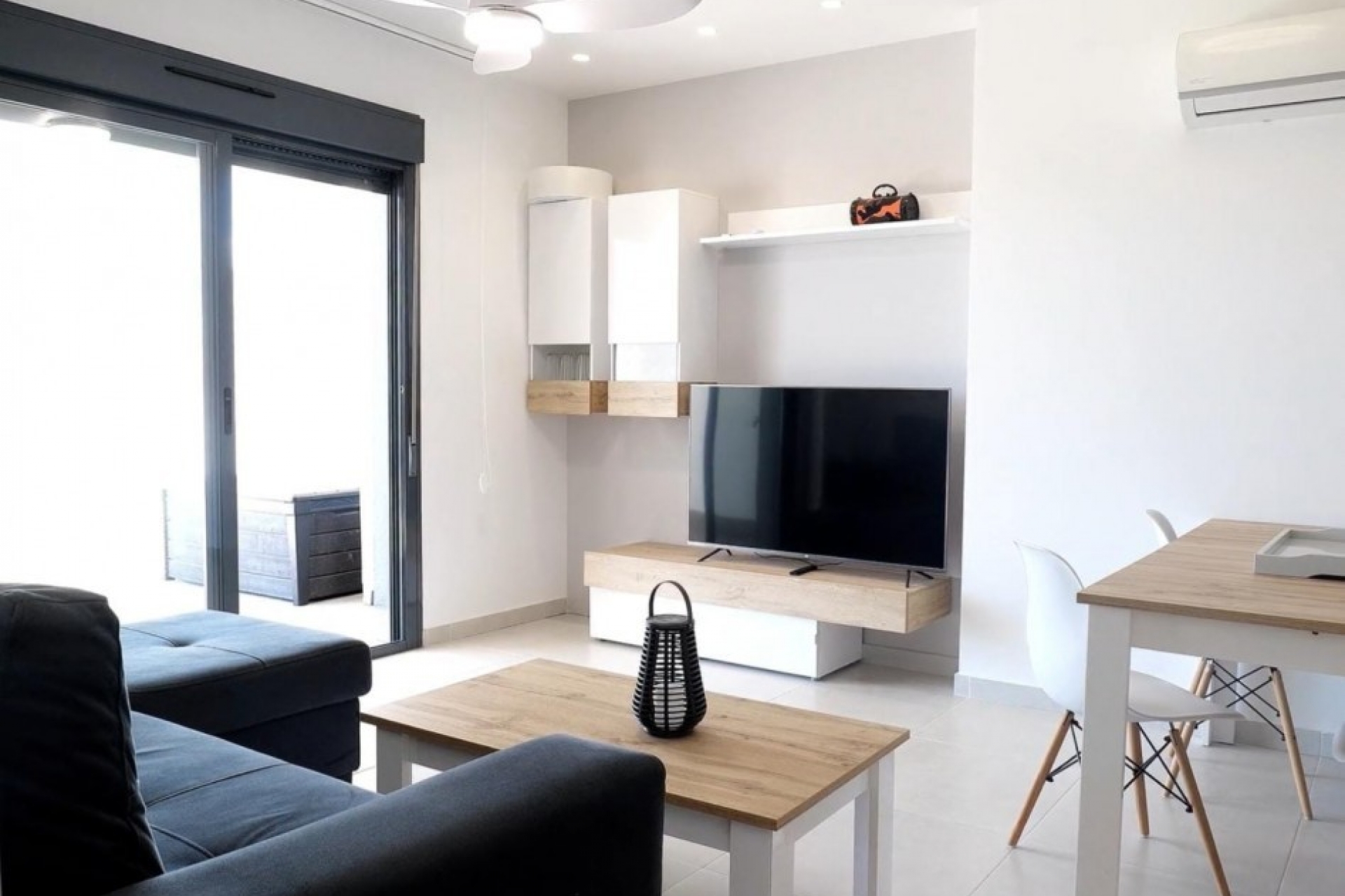 Upon entering the apartment you have a modern, open and fully equipped kitchen. The bright living-dining room is air-conditioned. Along the large sliding window you can go to the spacious terrace where you can relax and sunbathe. You have a full-size double bedroom with fitted wardrobes and air conditioning. There is a bathroom with walk-in shower. The flat is well maintained and in very good condition.