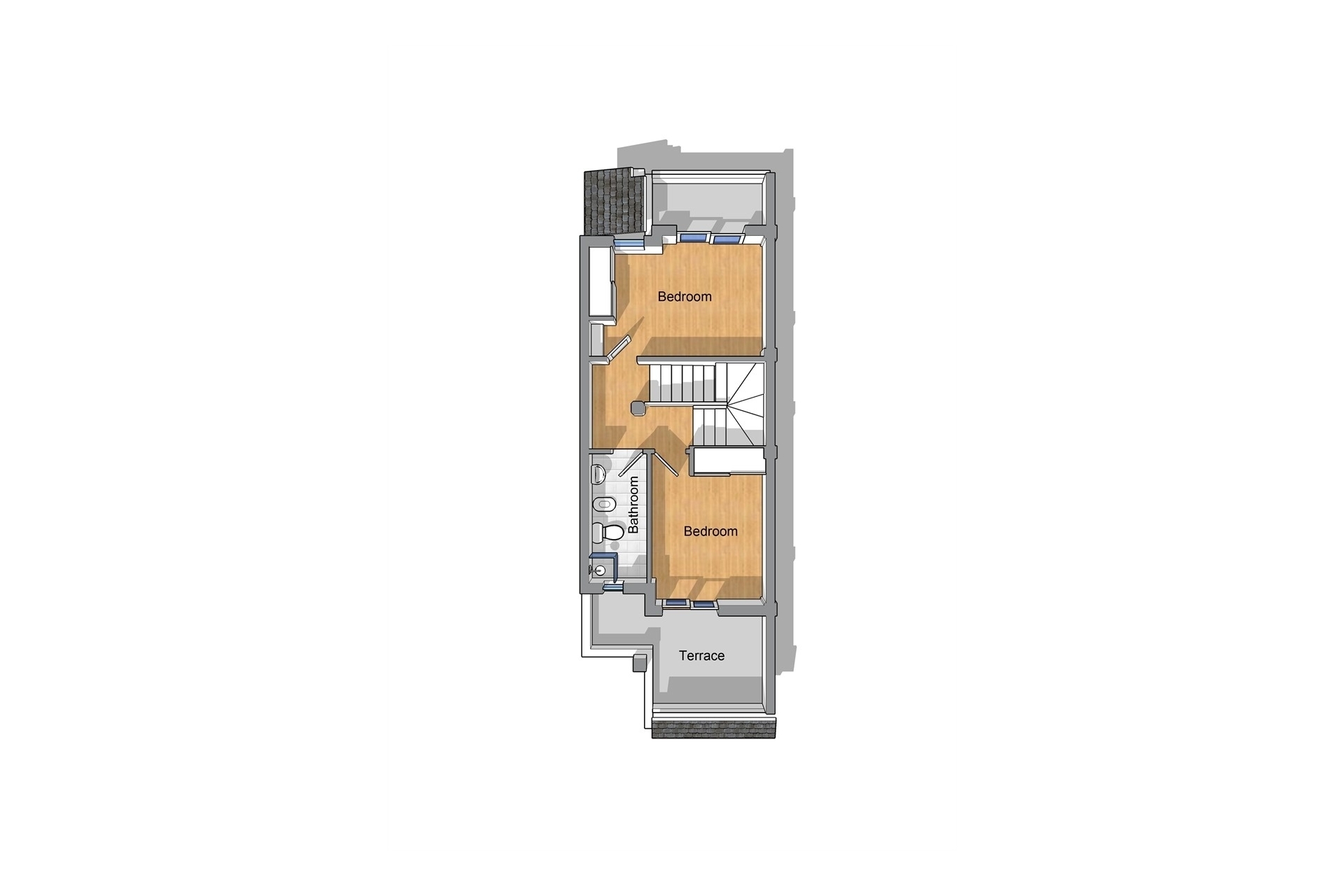 On the second floor there are two bedrooms with access to the terrace and a bathroom. On the roof there is a sun terrace.