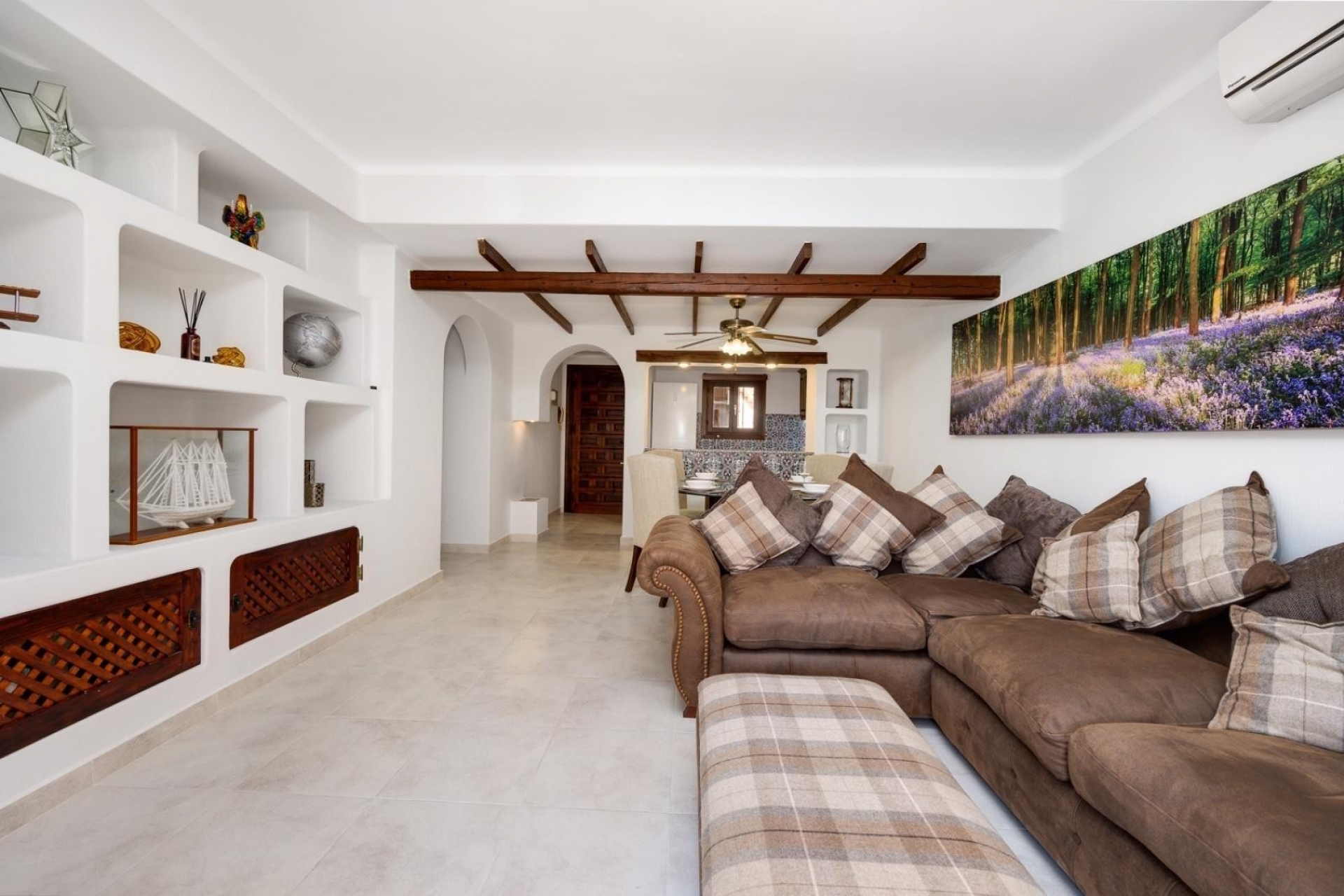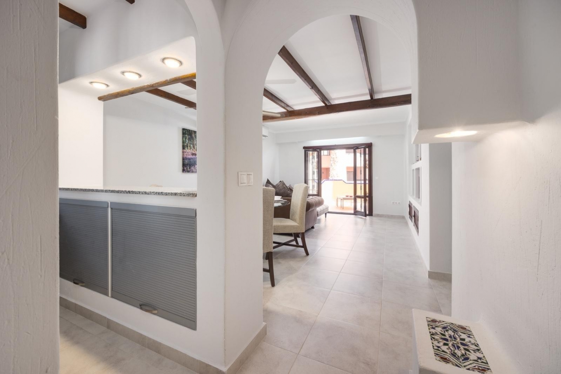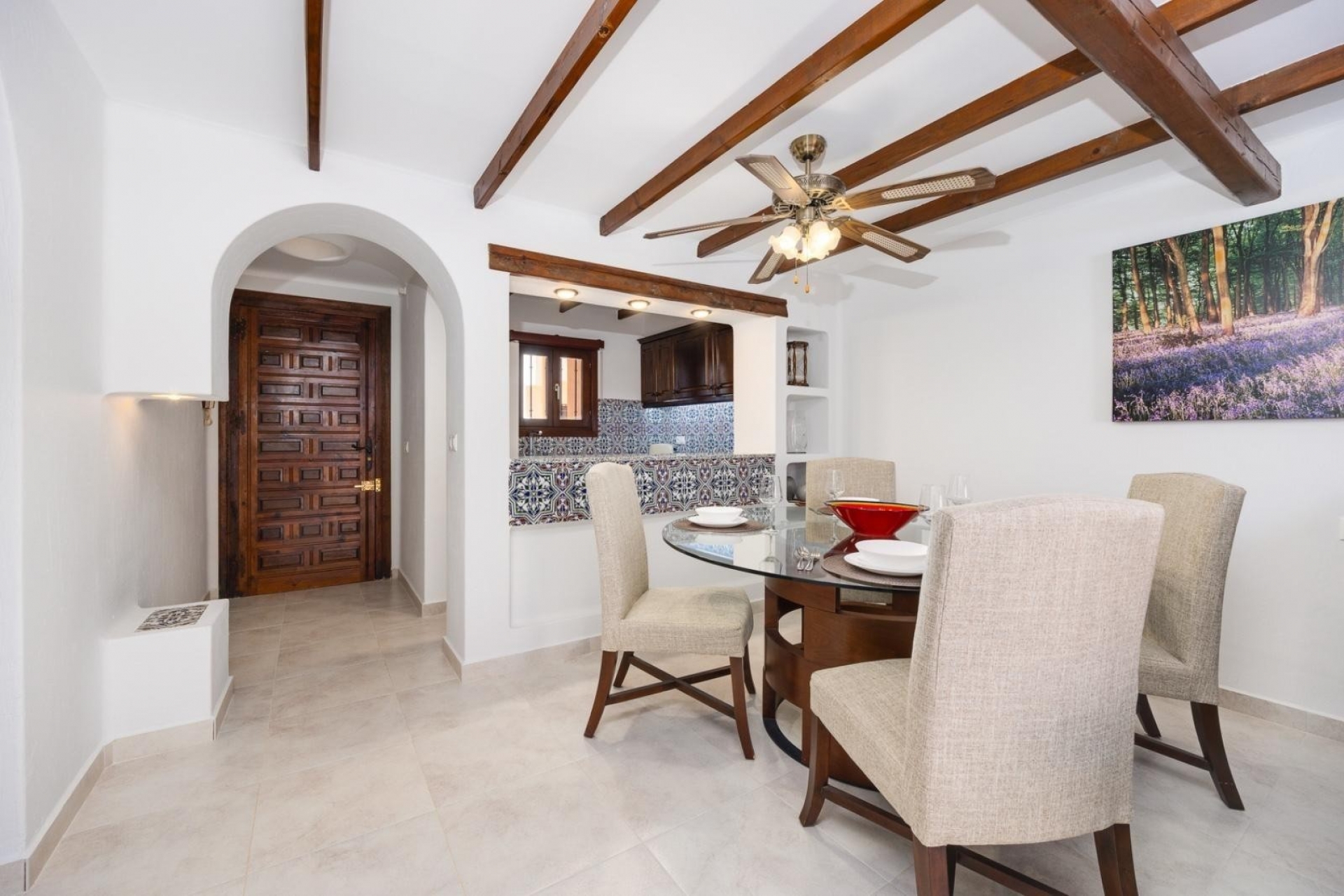The combination of wooden beams on the ceiling and Spanish elements creates an interesting whole.