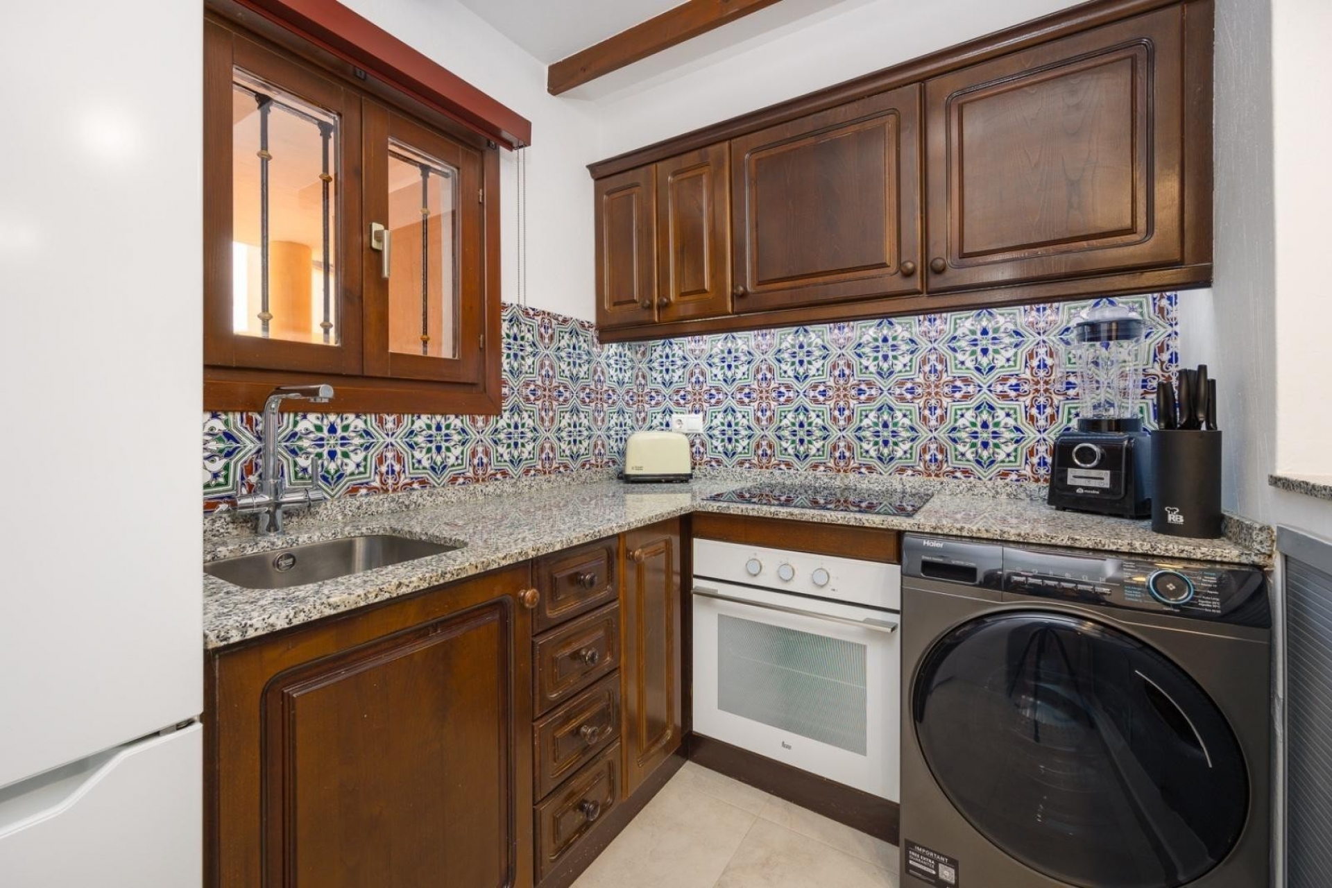 The wooden kitchen beautifully complements the teal-colored tiles and is fully equipped.