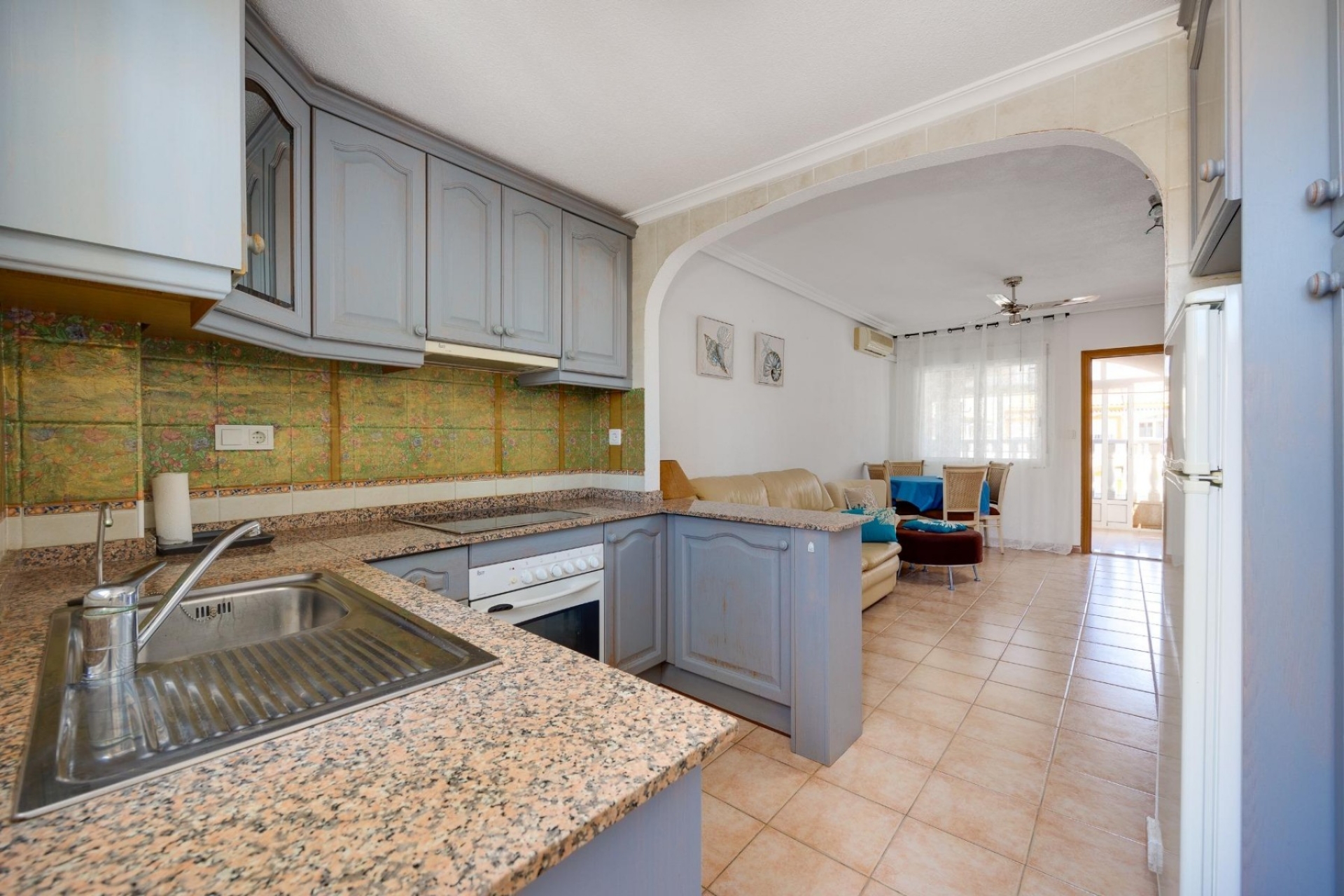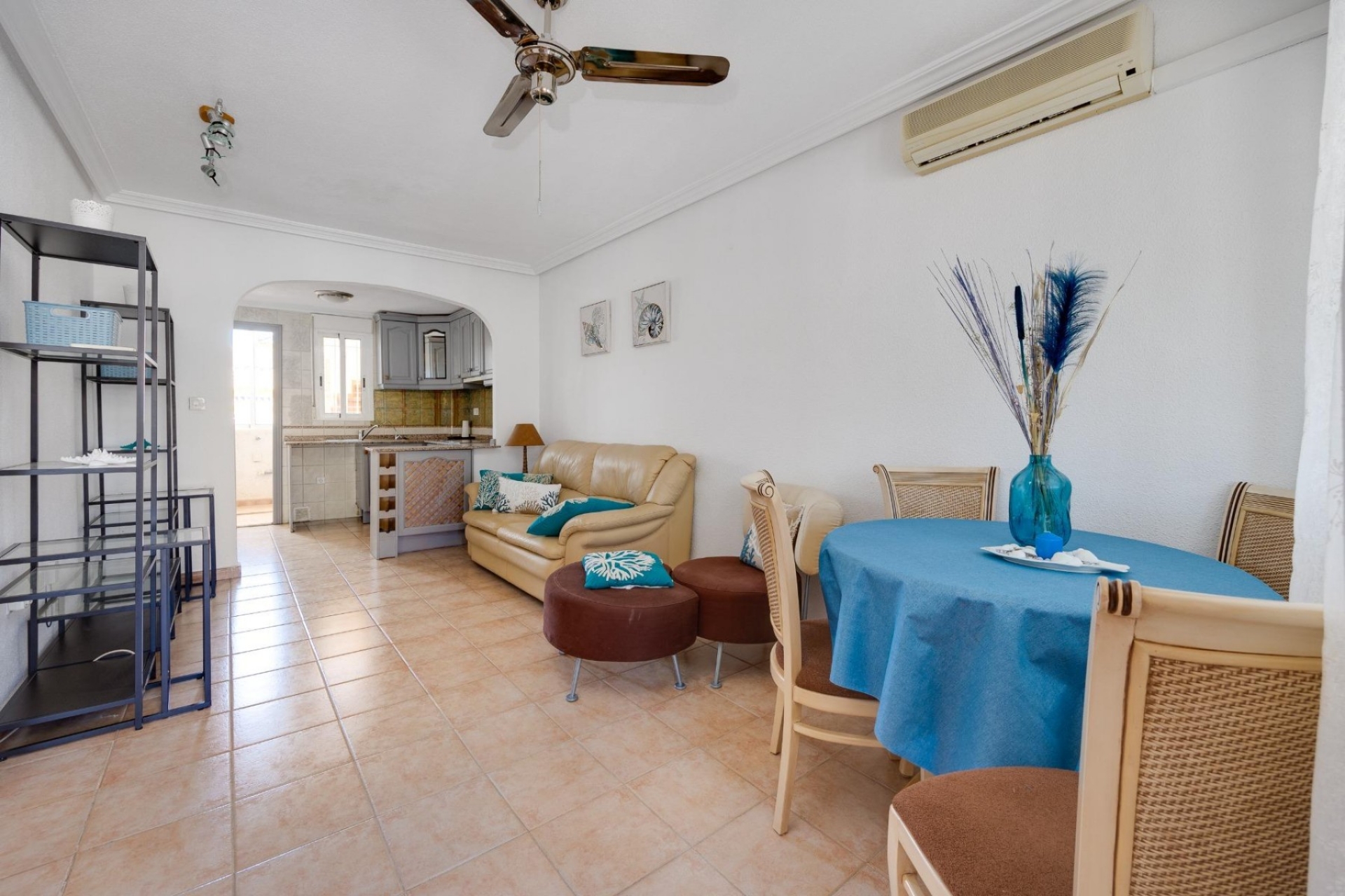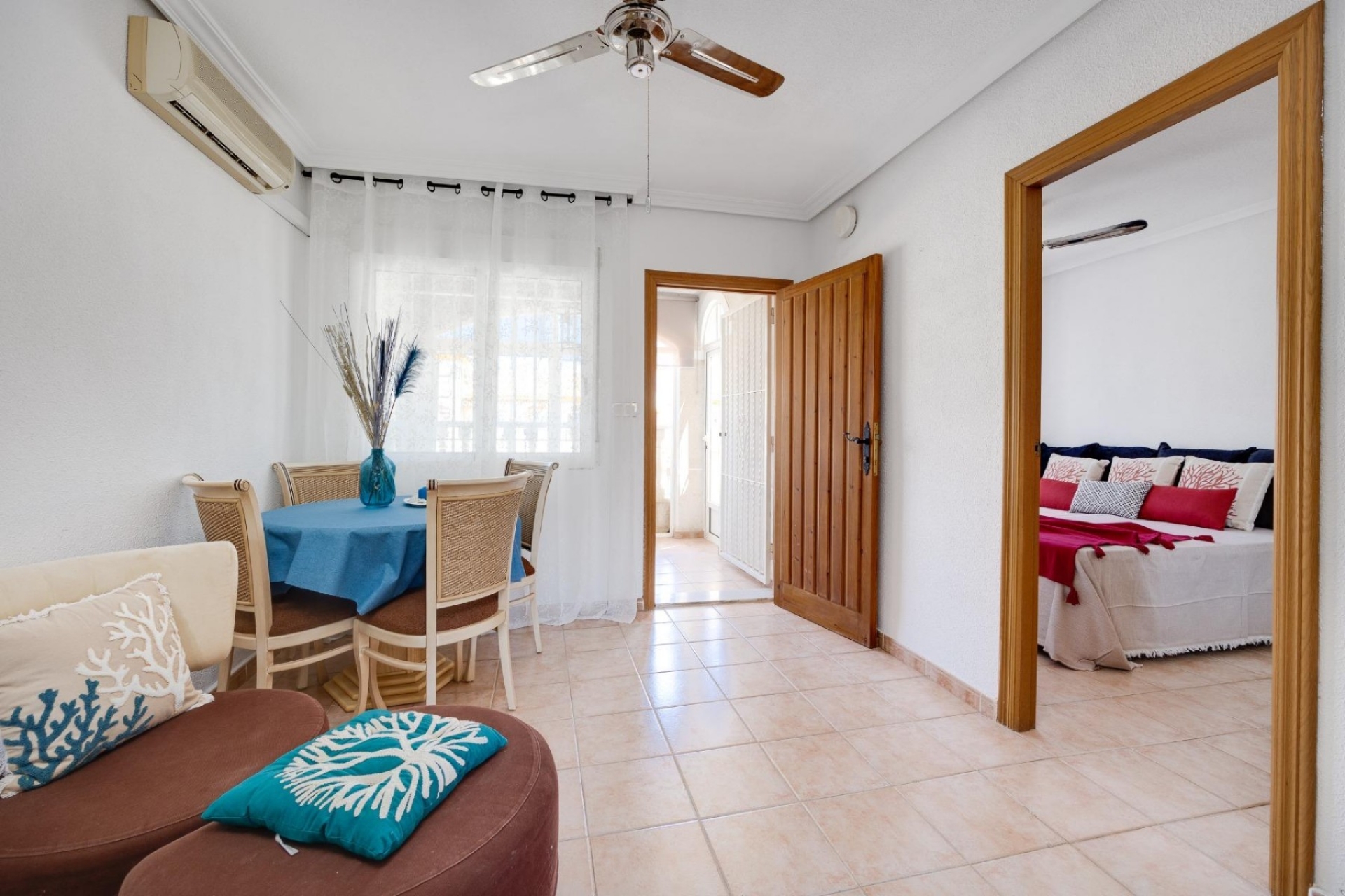 The bungalow has 1 bedroom, 1 bathroom, a living room with a dining area and kitchenette, and a sunny terrace, perfect for enjoying the Mediterranean climate.