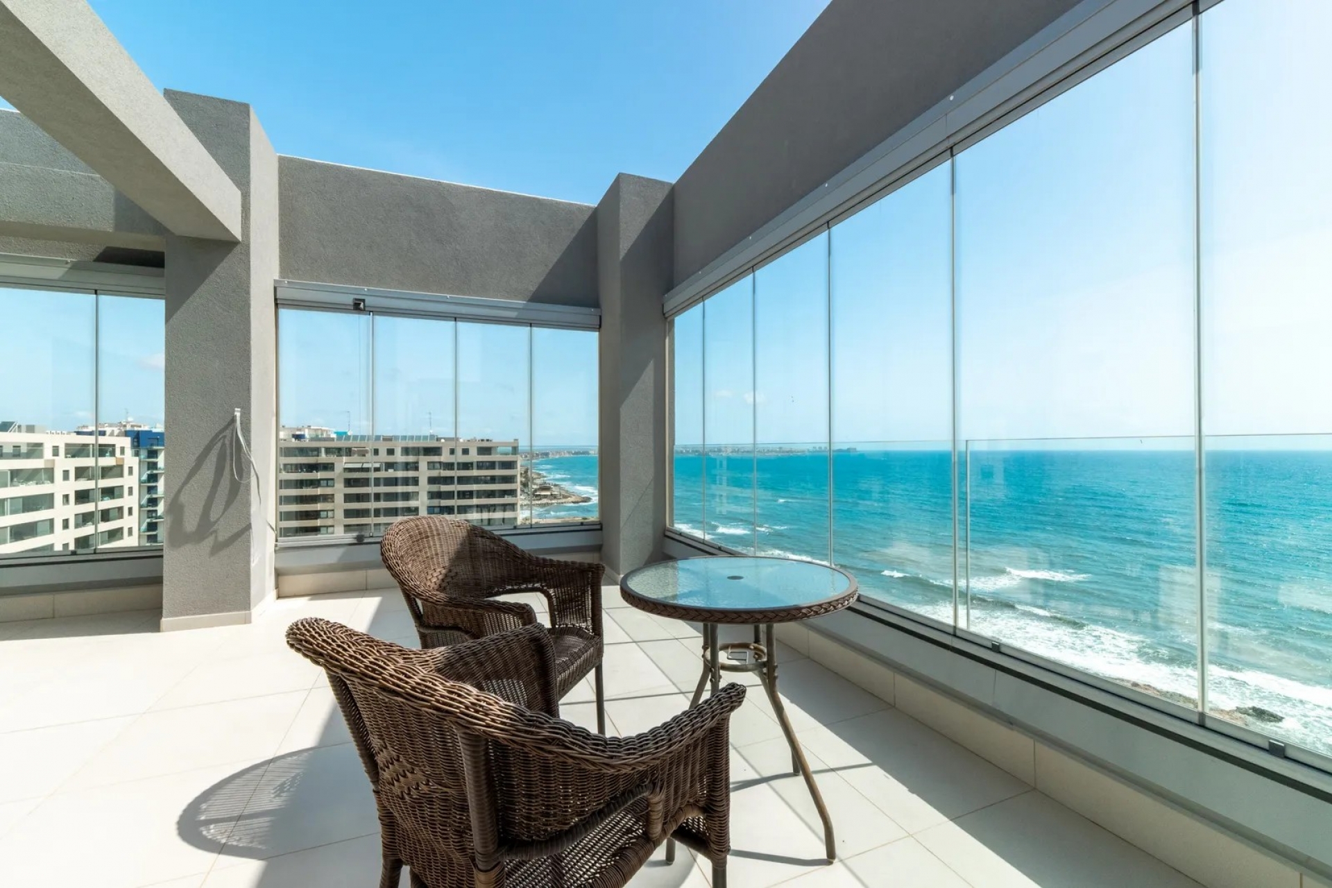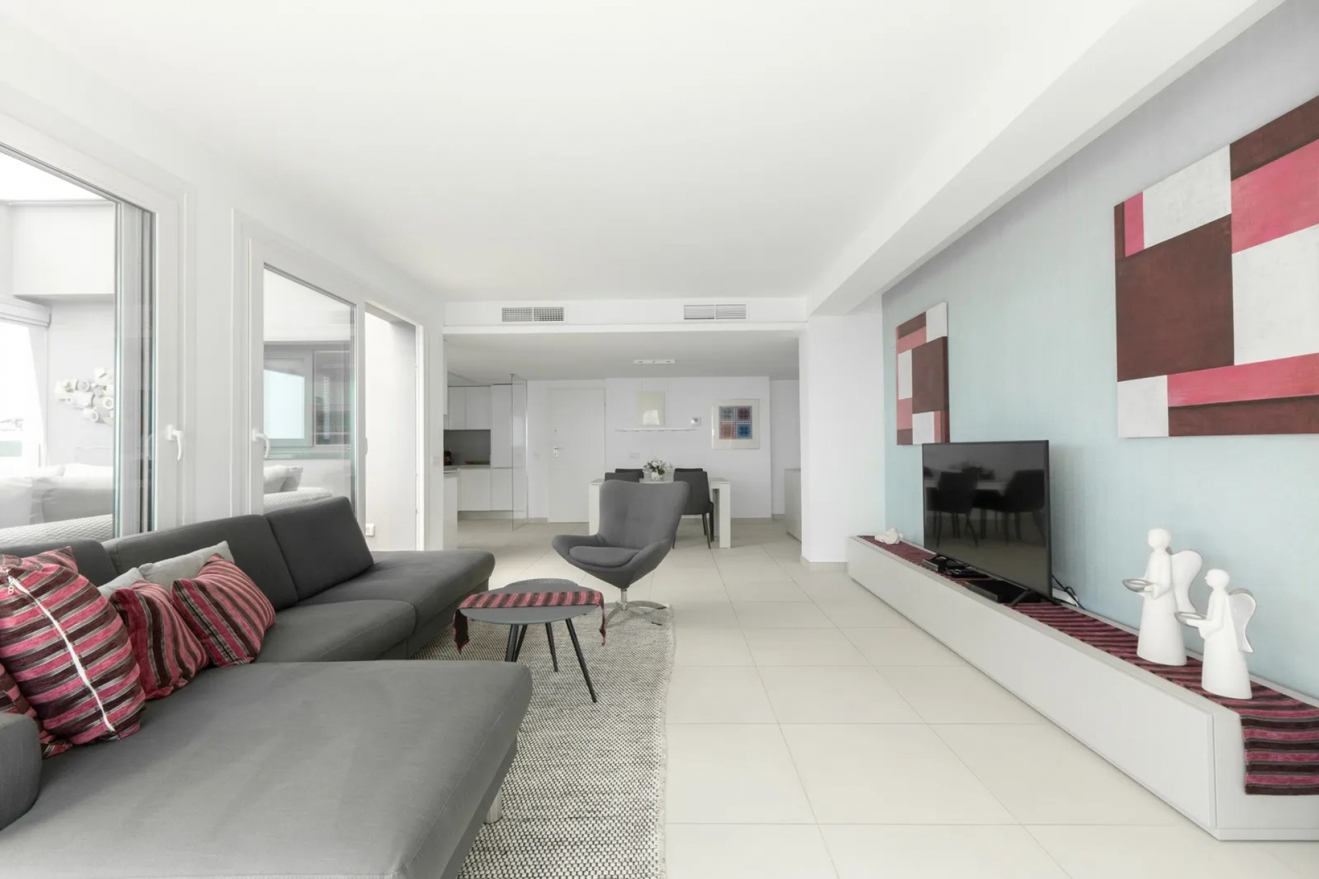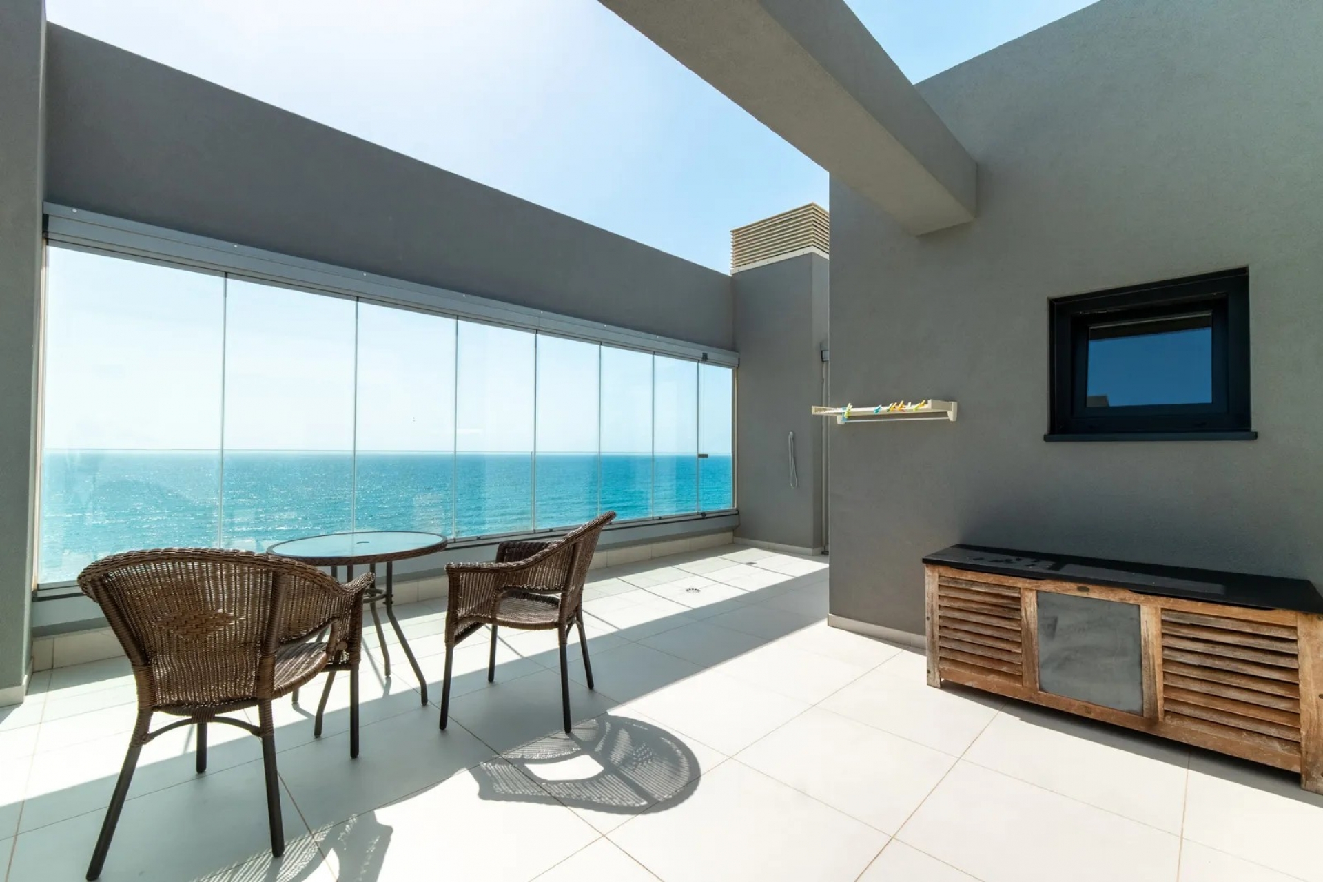 We are delighted to present this luxurious penthouse on the first line of the sea in Punta Prima! This stunning penthouse is located on the ninth floor and offers three bedrooms, two bathrooms and magnificent panoramic views of the Mediterranean Sea! With sea views from every room, the horizon extends into the entire home, where light flows freely through the large panoramic windows. The open plan layout connects the kitchen, living room and dining area into a harmonious whole – tailor-made for both relaxation and family dinners. The generous terrace, with both glazed and open areas, extends the living room and creates an ideal place for social events at sunset.