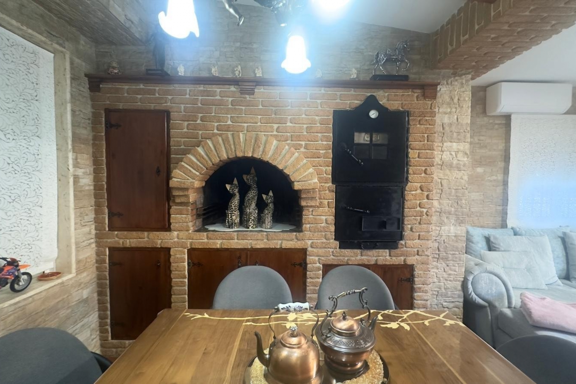 The interior of the house offers a spacious and bright living room, dominated by a functional fireplace, providing warmth in the winter months and enhancing the cozy atmosphere of the house. On the same floor, you'll find a guest toilet, a guest bedroom, ideal for family or guests, and a fully equipped, independent kitchen with an additional dining area and a bathroom with a...