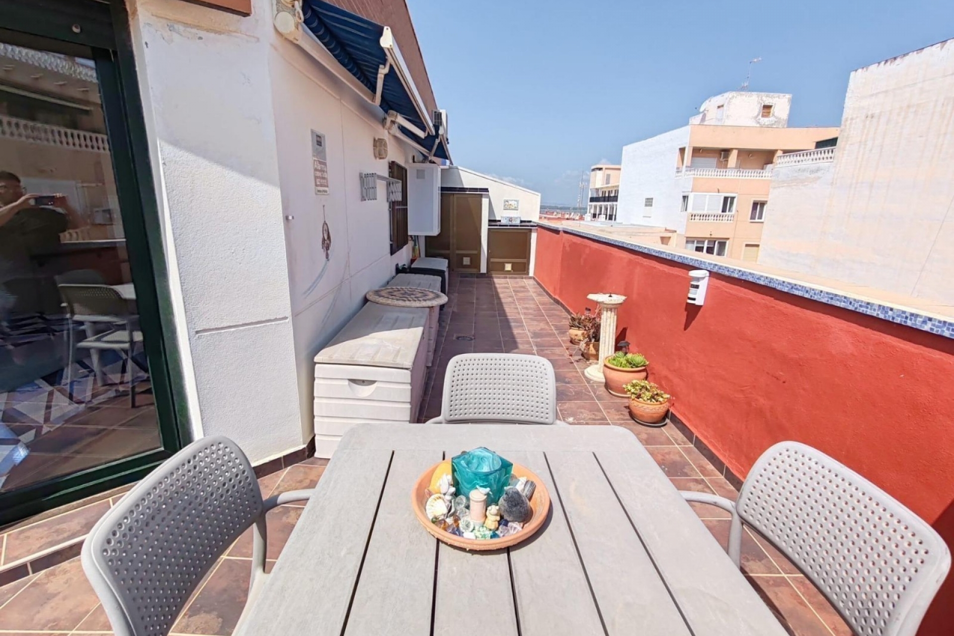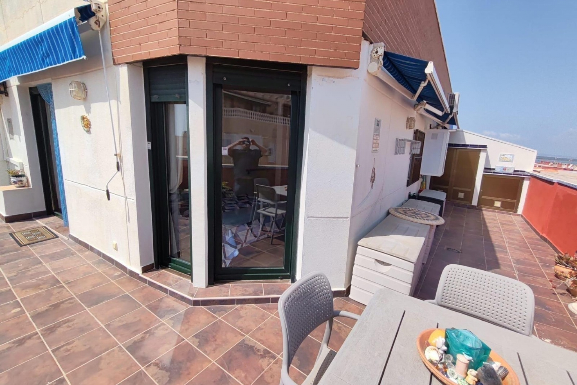 This terrace is also equipped with brand-new awnings and aluminum wardrobes that serve as storage.