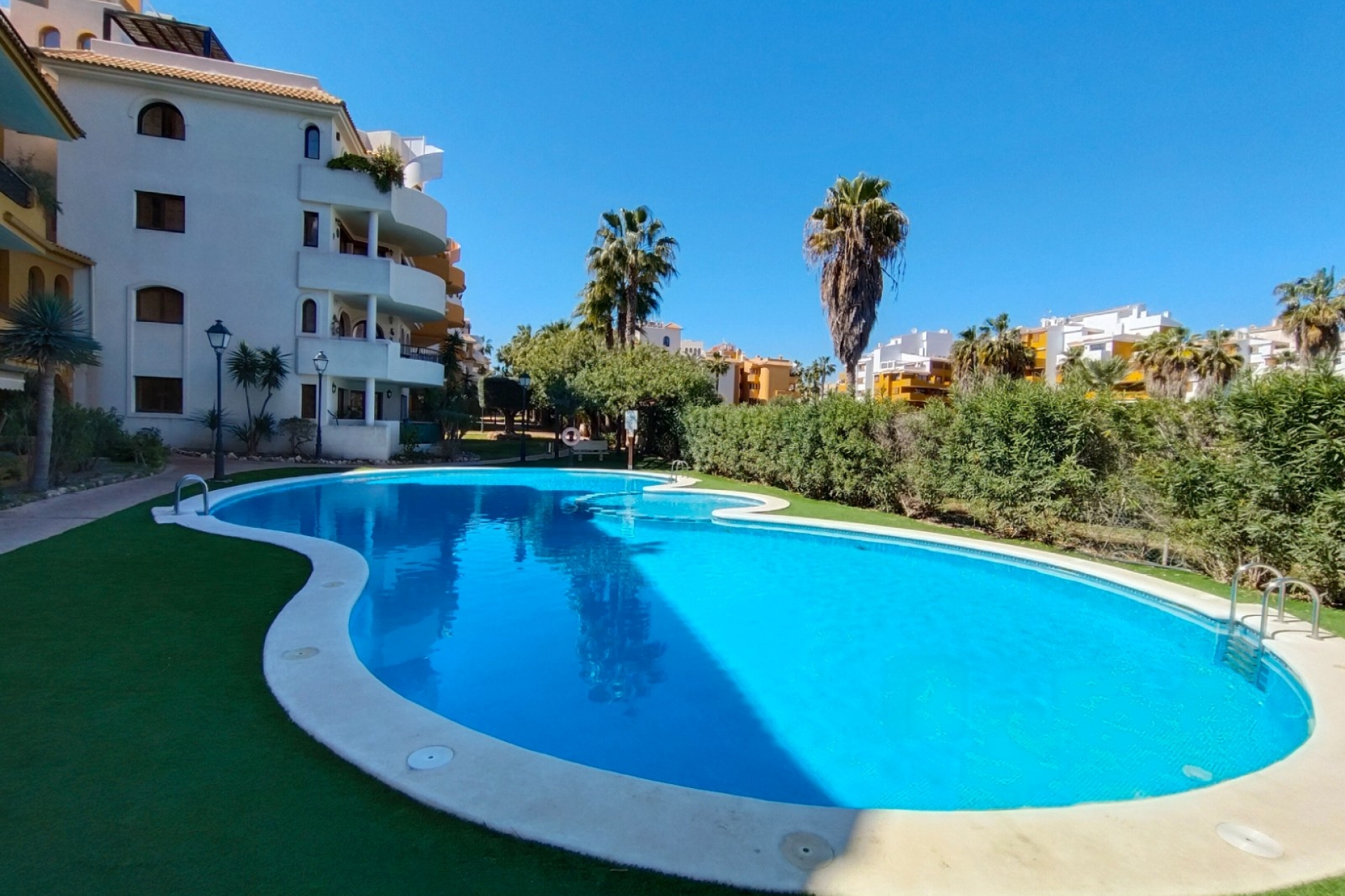 This Mediterranean-style apartment features two bedrooms, one bathroom, and a spacious terrace overlooking the pool and adjacent golf course.