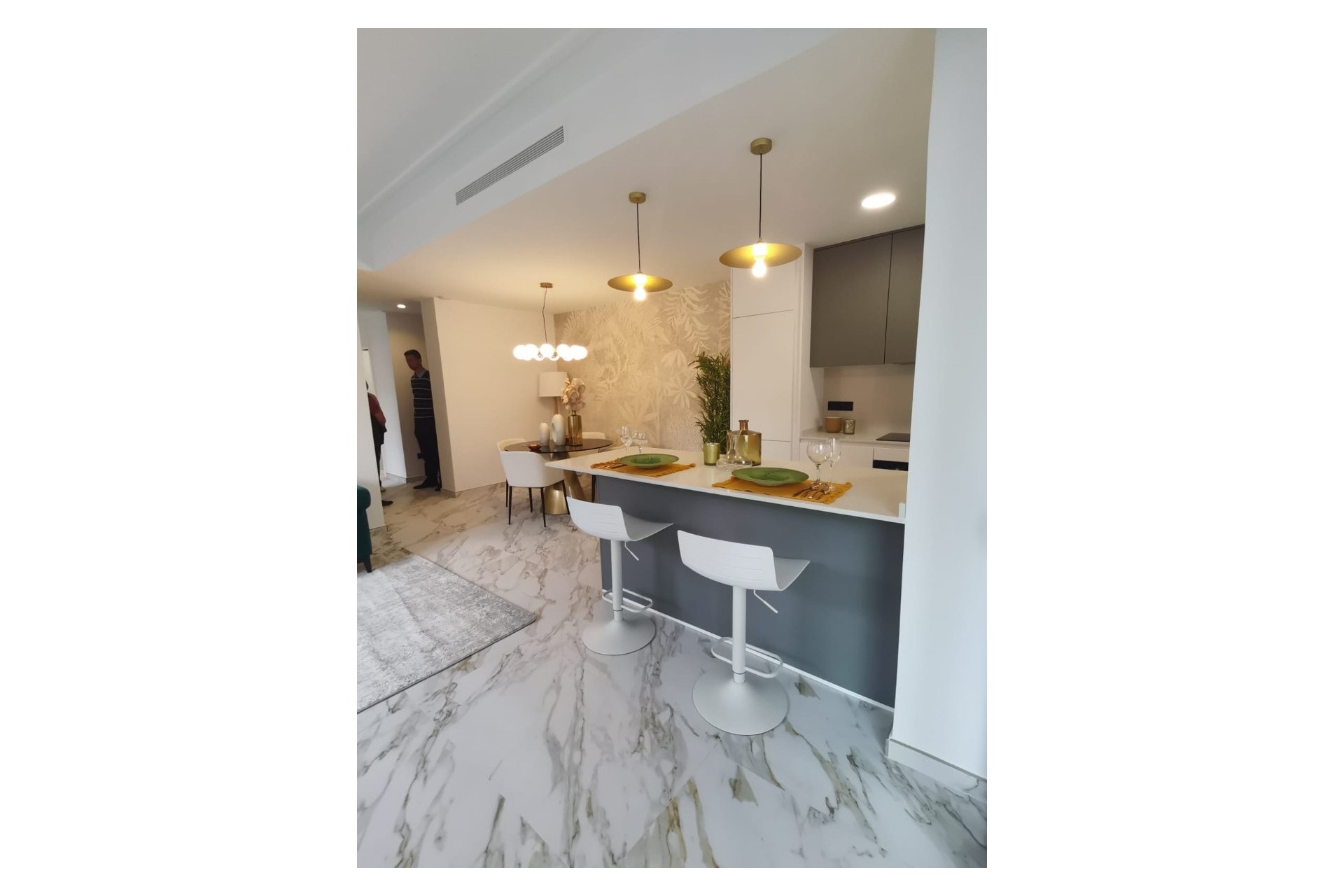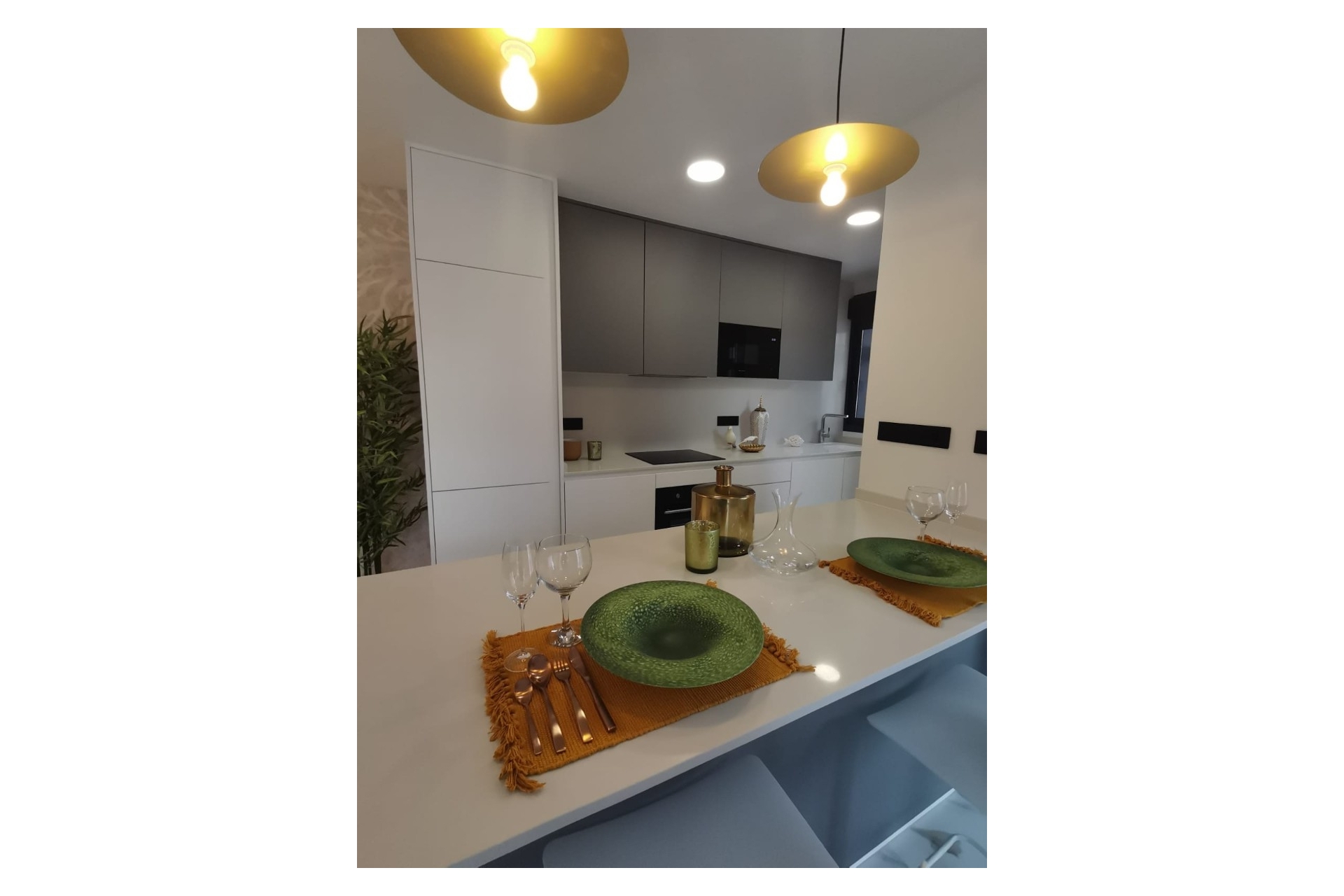 Of course, the deluxe kitchen is also included, which is equipped with a breakfast bar and adjoins the spacious dining room/living room, which in turn connects to the terrace. Of course there is a lift in the complex that goes from the ground floor to the solarium. Construction ends in April 2023, so you will be able to enjoy your apartment very soon. We also have a show apartment, visit us without obligation or send us an email to obtain more information about this unique opportunity in the center of Guardamar.