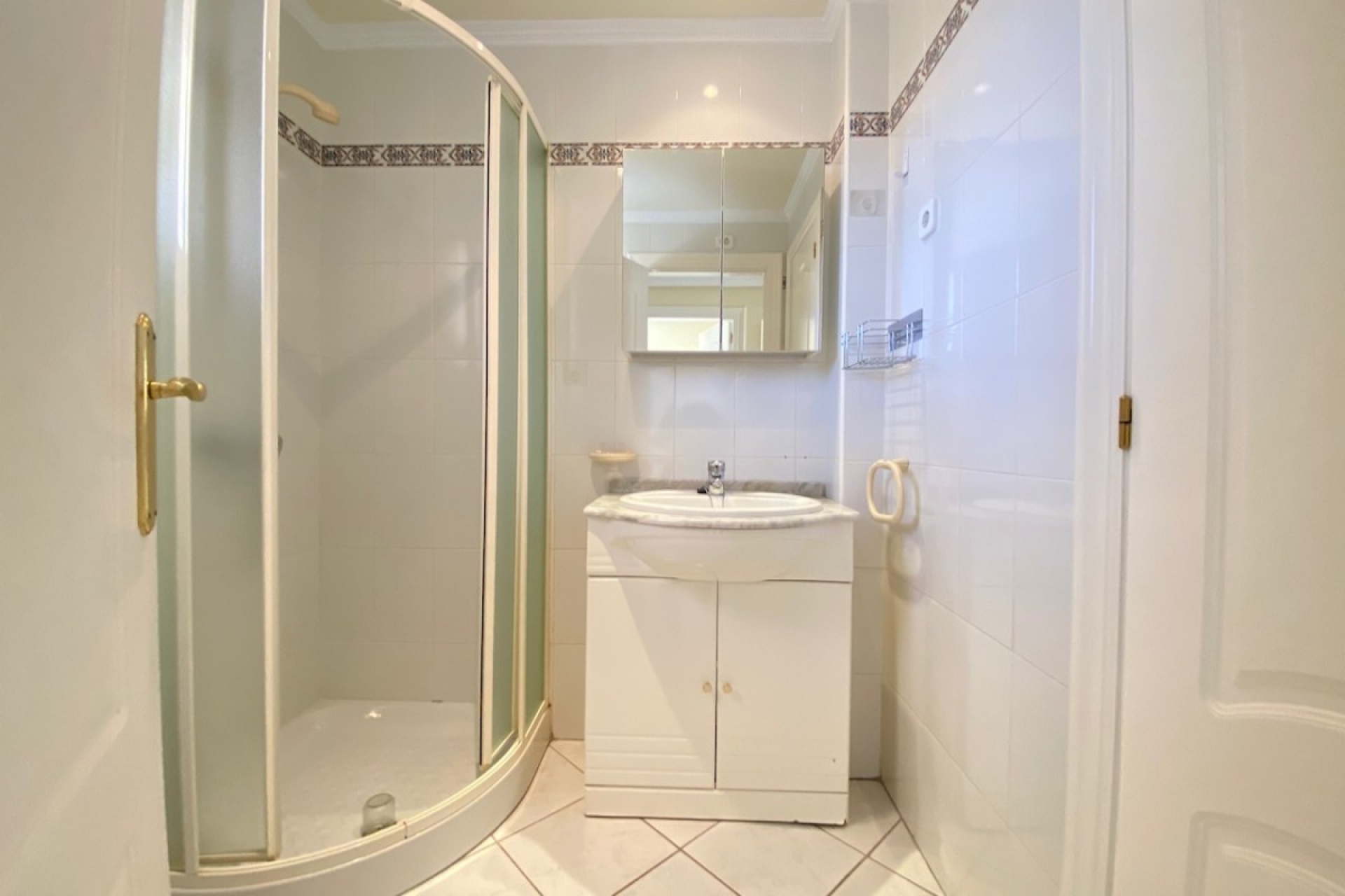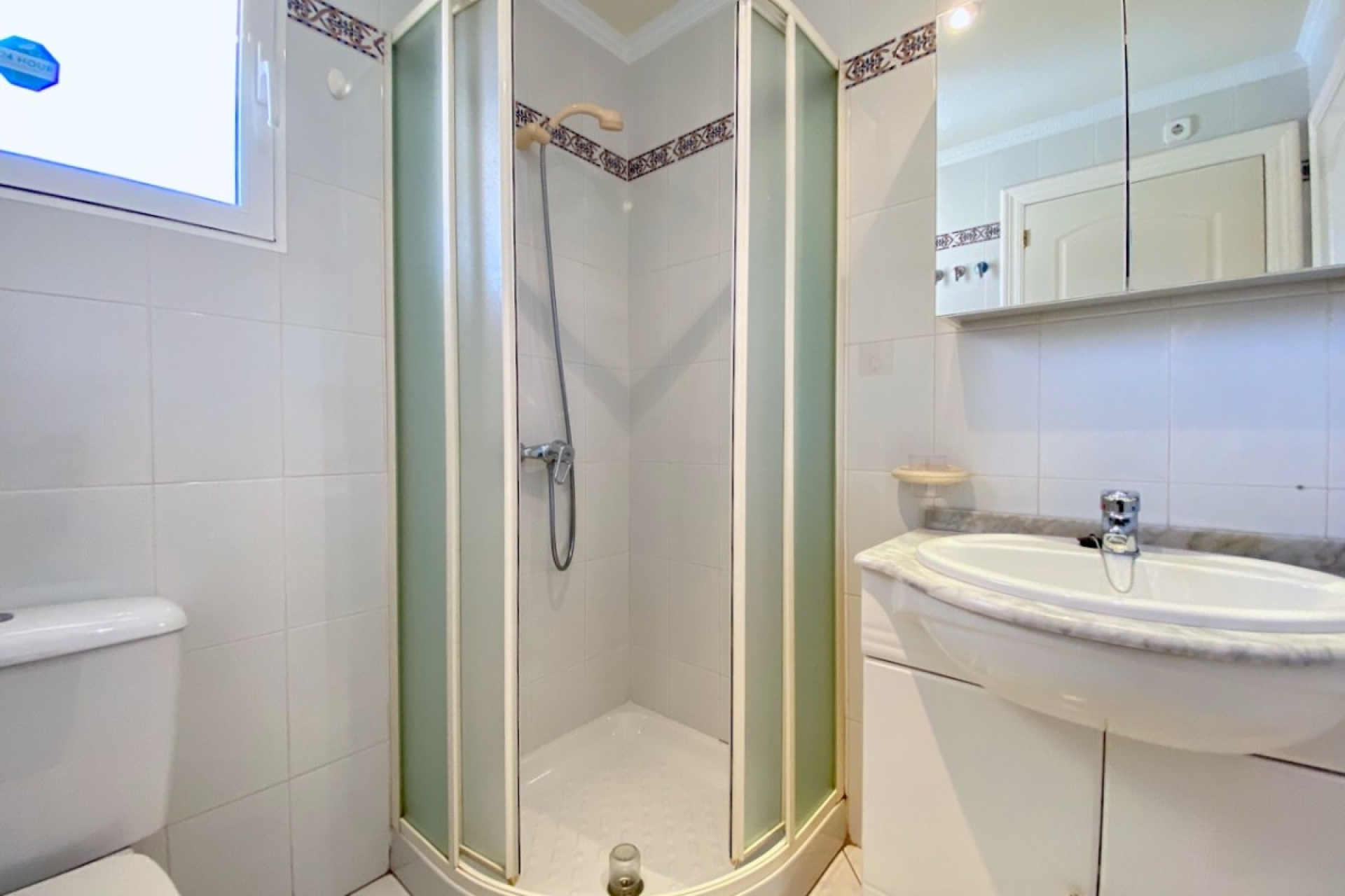 On this main floor, we also find a double bedroom, with a built-in wardrobe and window and a bathroom with a shower and window.