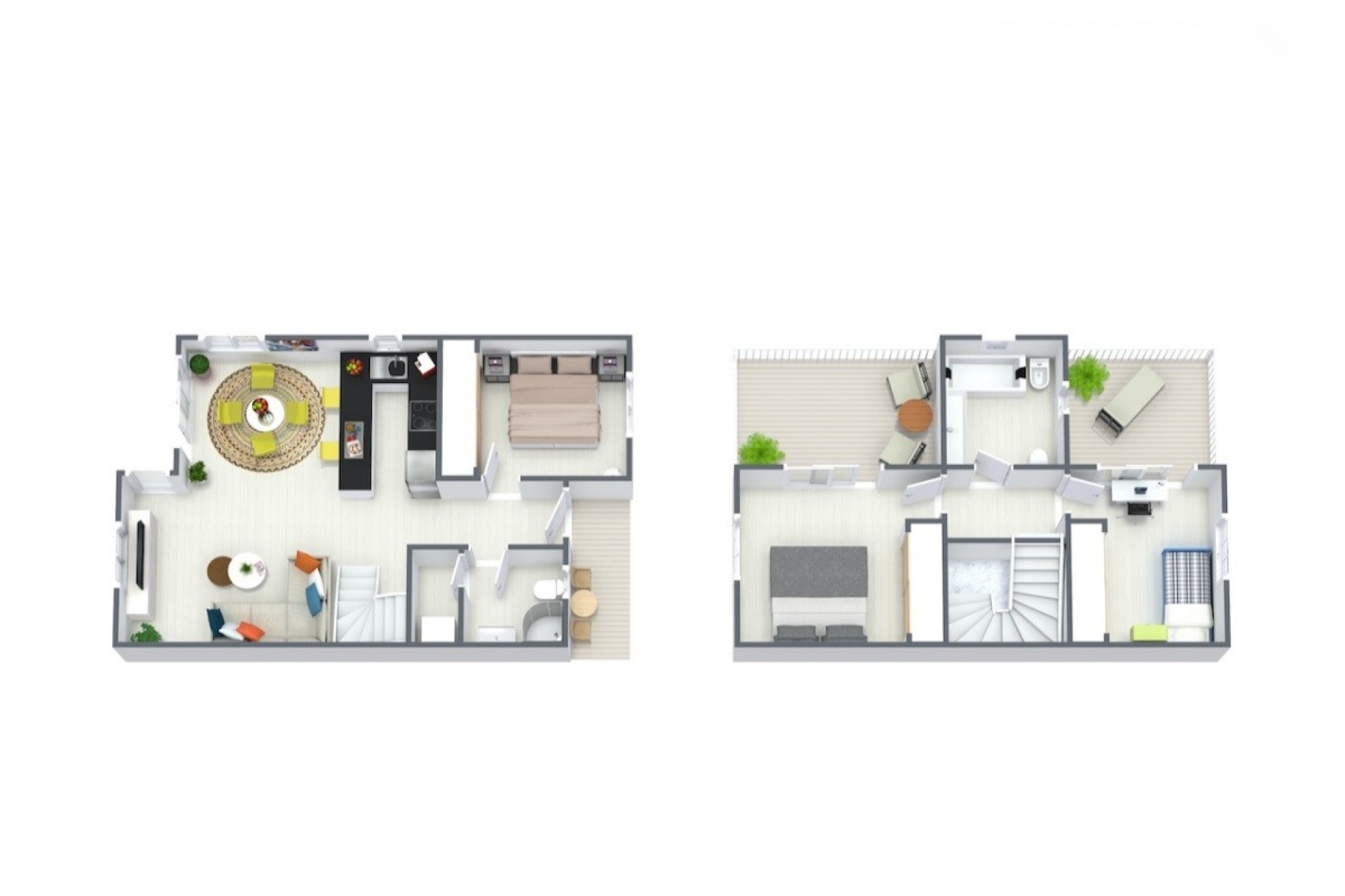 We access the upper floor and find 2 large double bedrooms, both with built-in wardrobes and glazed terraces. From the master bedroom we can delight in the impressive views of the communal garden areas.