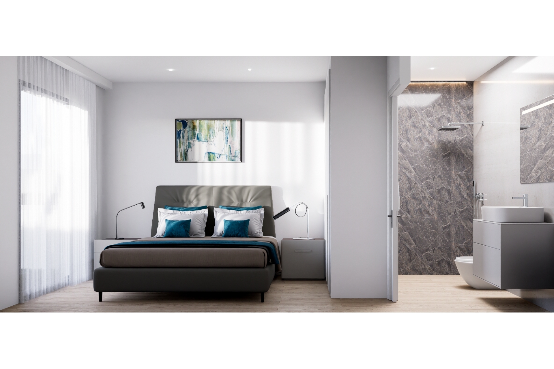 Among others, underfloor heating in the bathrooms, pre-installation of air conditioning, videophone, built-in wardrobes in the bedrooms, built-in furniture in the kitchen.