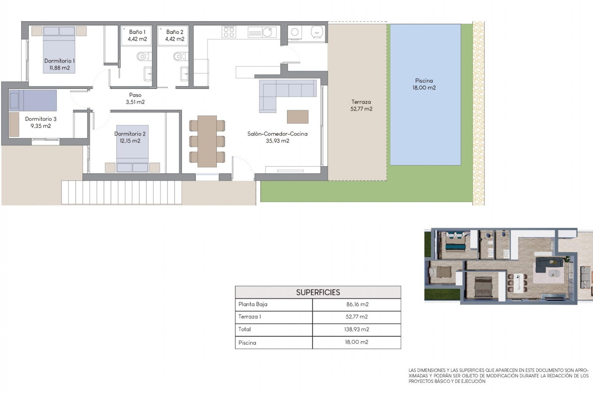 The property presented consists of a living room with dining area, open plan kitchen with utility room, master bedroom with its own bathroom, two bedrooms and a bathroom accessible from the corridor.