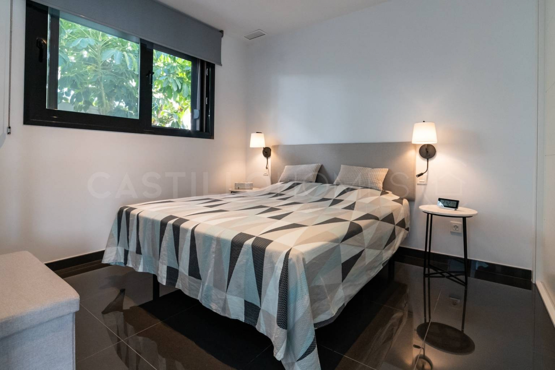 Upstairs, you are greeted by two additional bedrooms, including the master bedroom, which is highlighted by a private dressing room and luxurious bathroom. Both upstairs bedrooms have access to individual balconies which offer stunning views of the property, thus creating a tranquil setting in which to enjoy the sunrise or the beauty of the villa at night, illuminated by atmospheric lights highlighting the exotic plants on the plot.