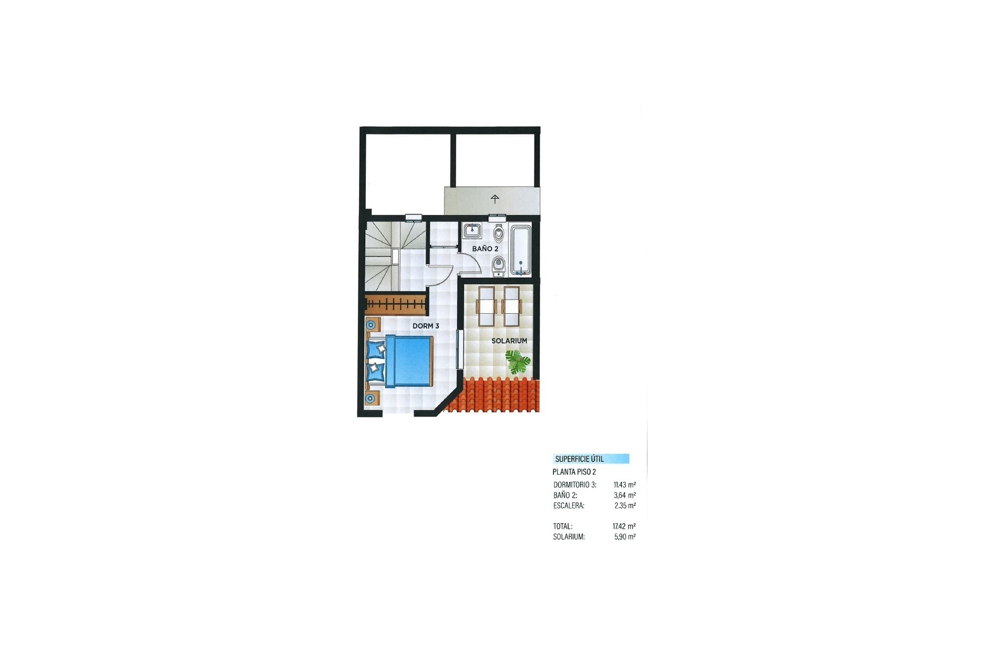 On the top floor, one large bedroom, a bathroom and a solarium.