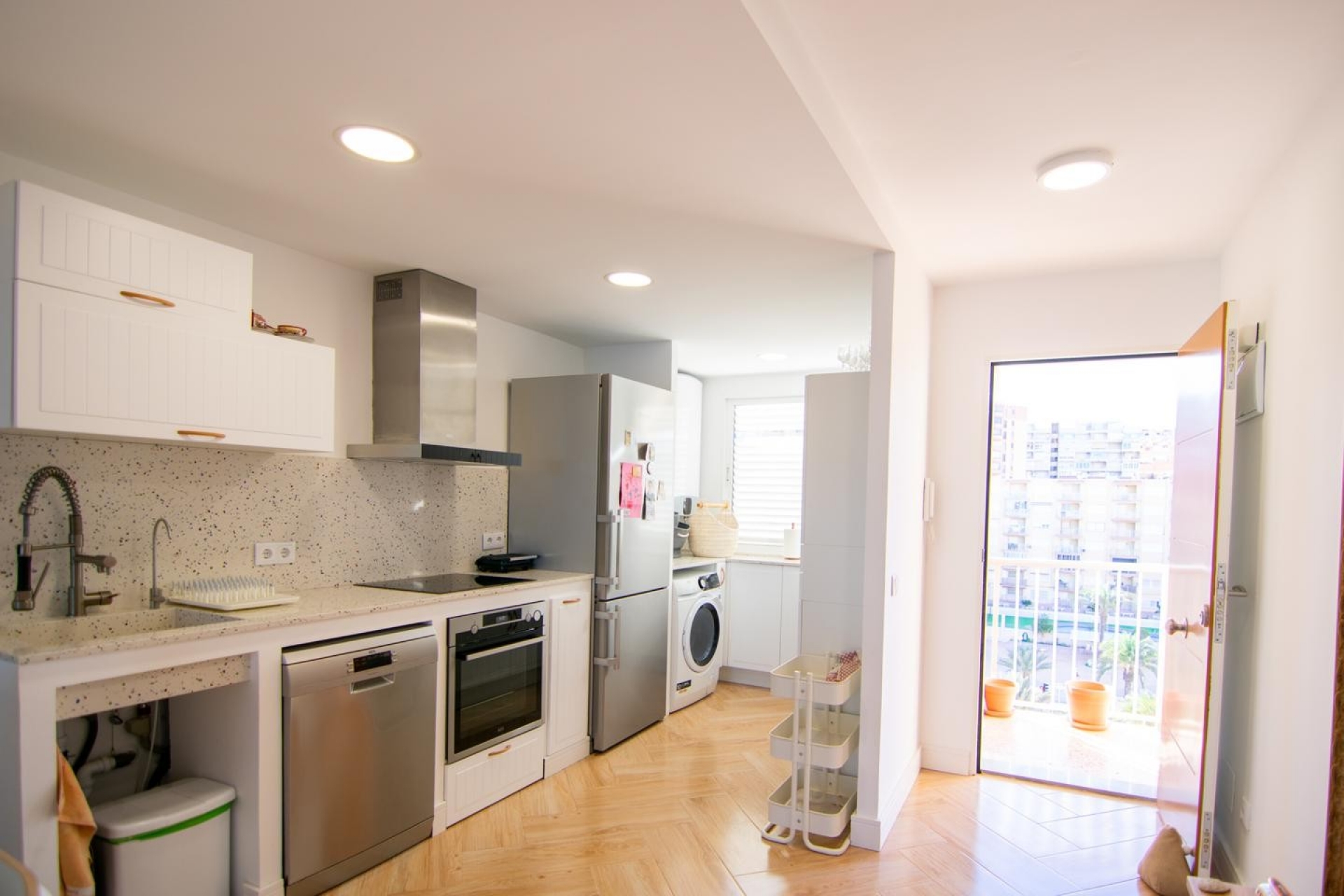 In the center of the apartment is the living room connected to the dining room, white finish combined with wooden floors give the apartment transparency, class and allow you to feel the Mediterranean touch.