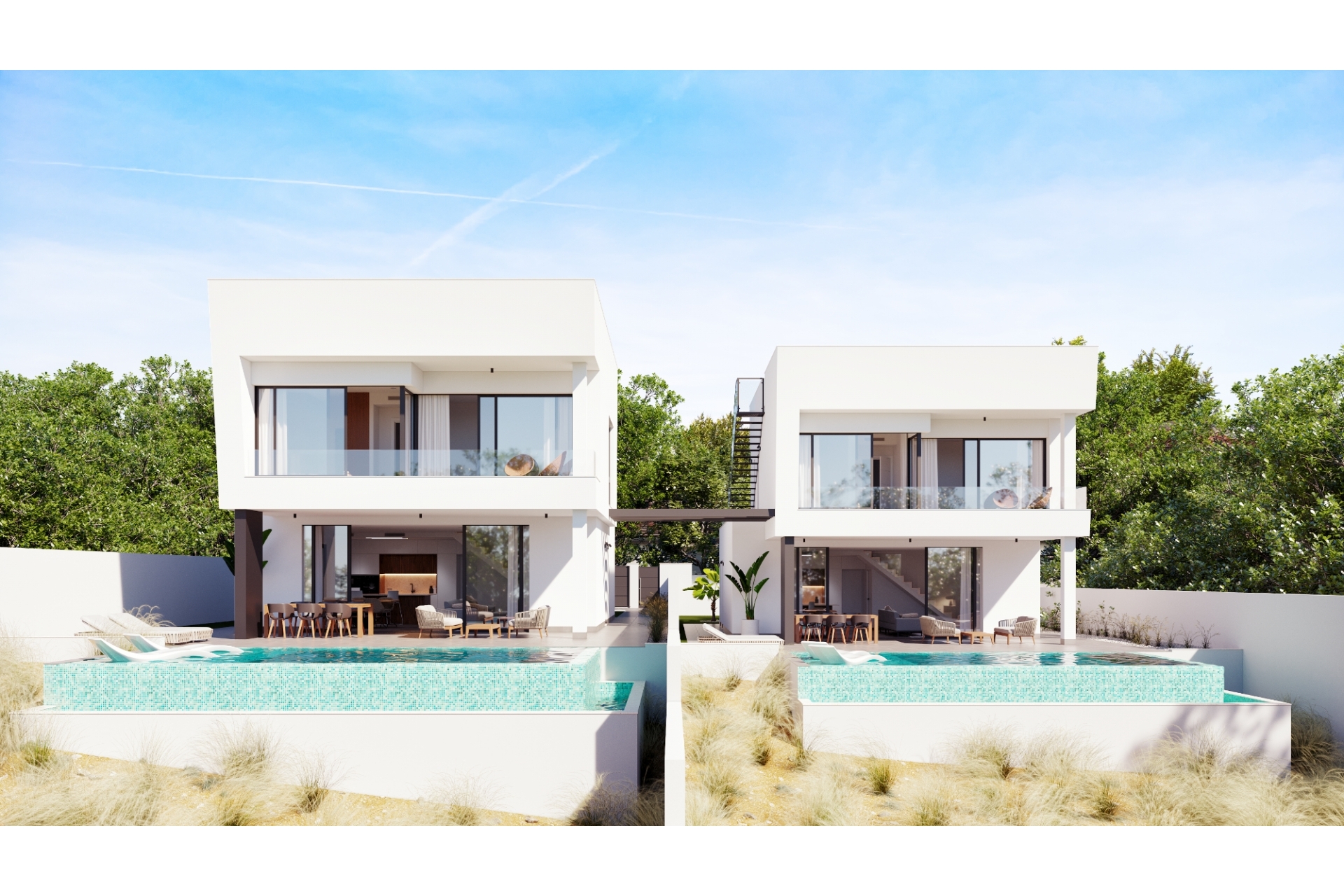These are luxury villas of 180 m2 with a 40 m2 edgeless pool and jacuzzi, a large plot of 700 m2 each, a terrace with sea views and a private garden that surrounds the properties, allowing you to enjoy all hours of sunshine, every day of the year.