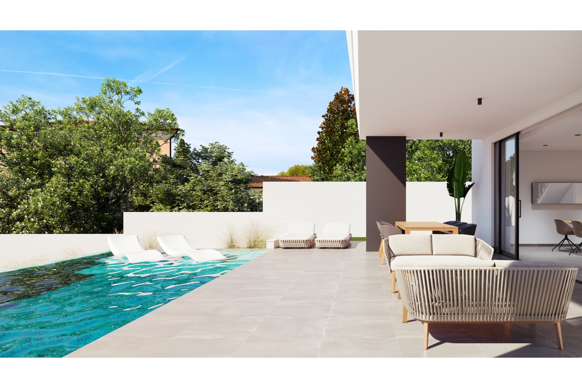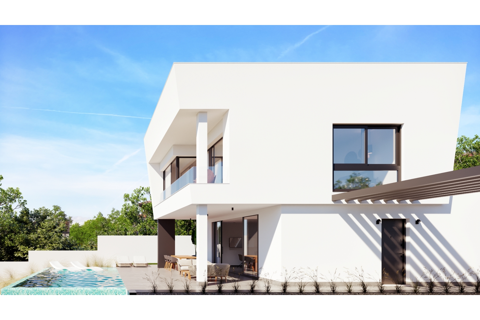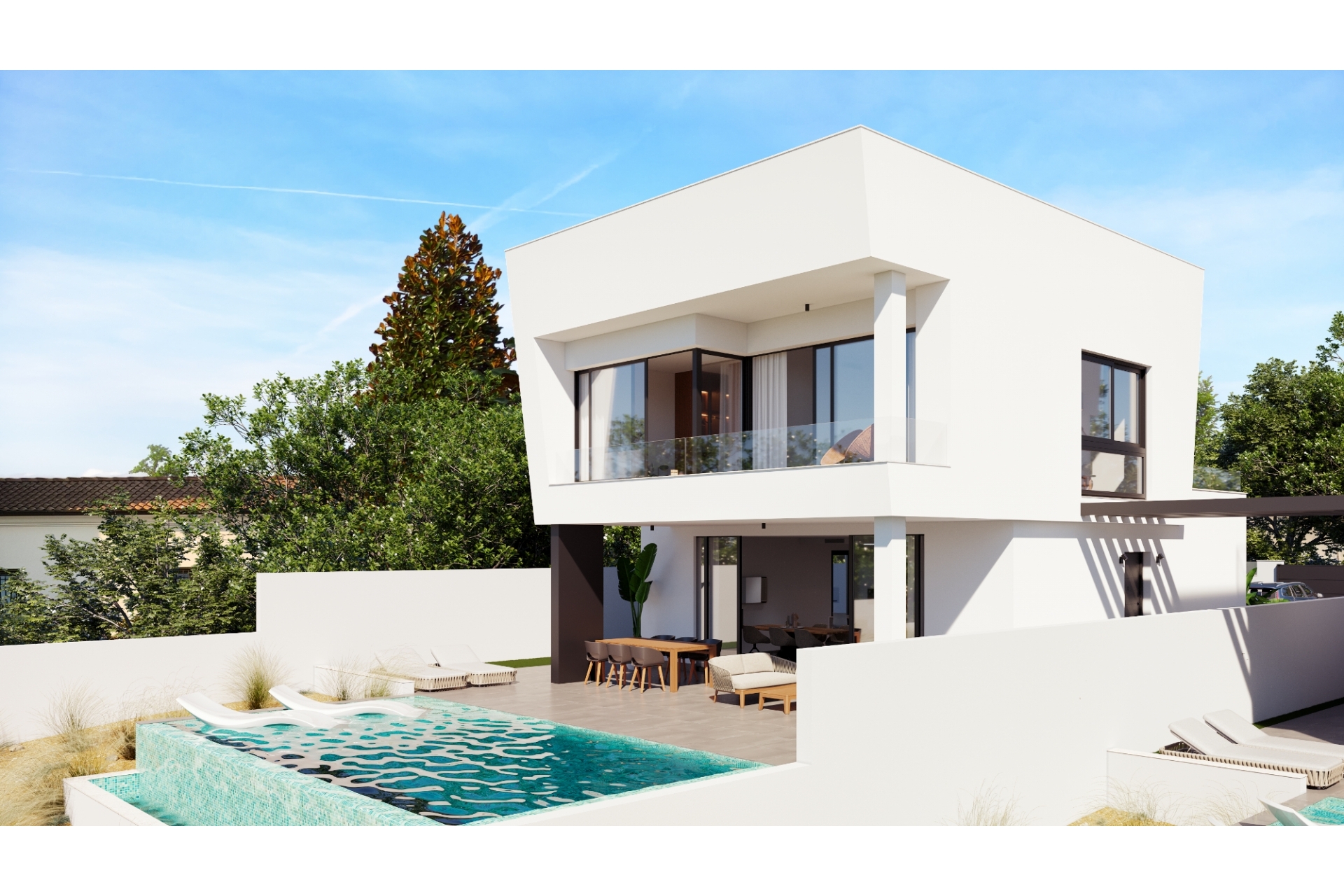 The villas are located in Pinar de Campoverde (Alicante), surrounded by services, sports facilities, close to several golf courses such as Las Colinas and Lo Romero Golf, and 10 minutes from the Mar Menor and Mediterranean beaches.