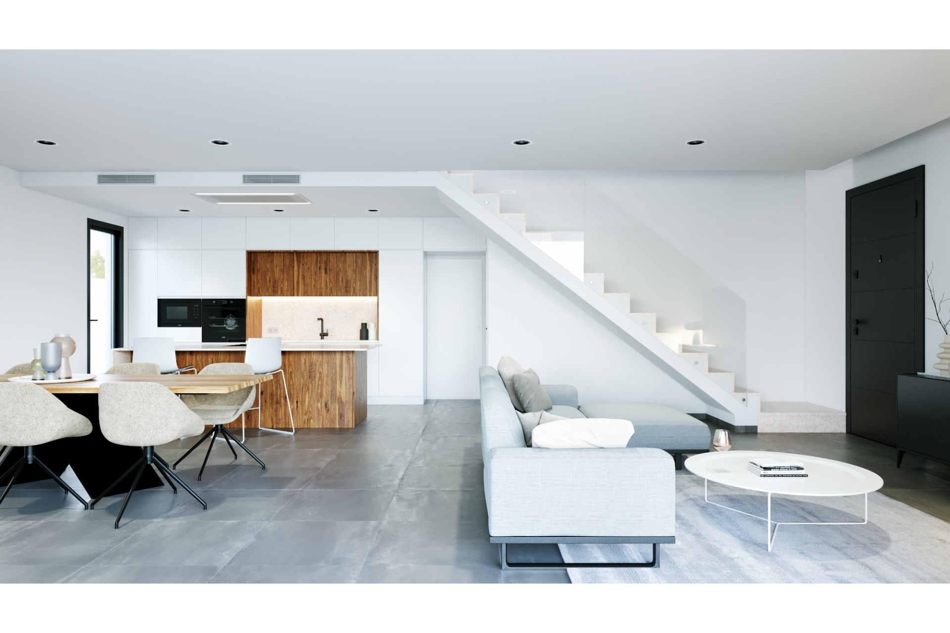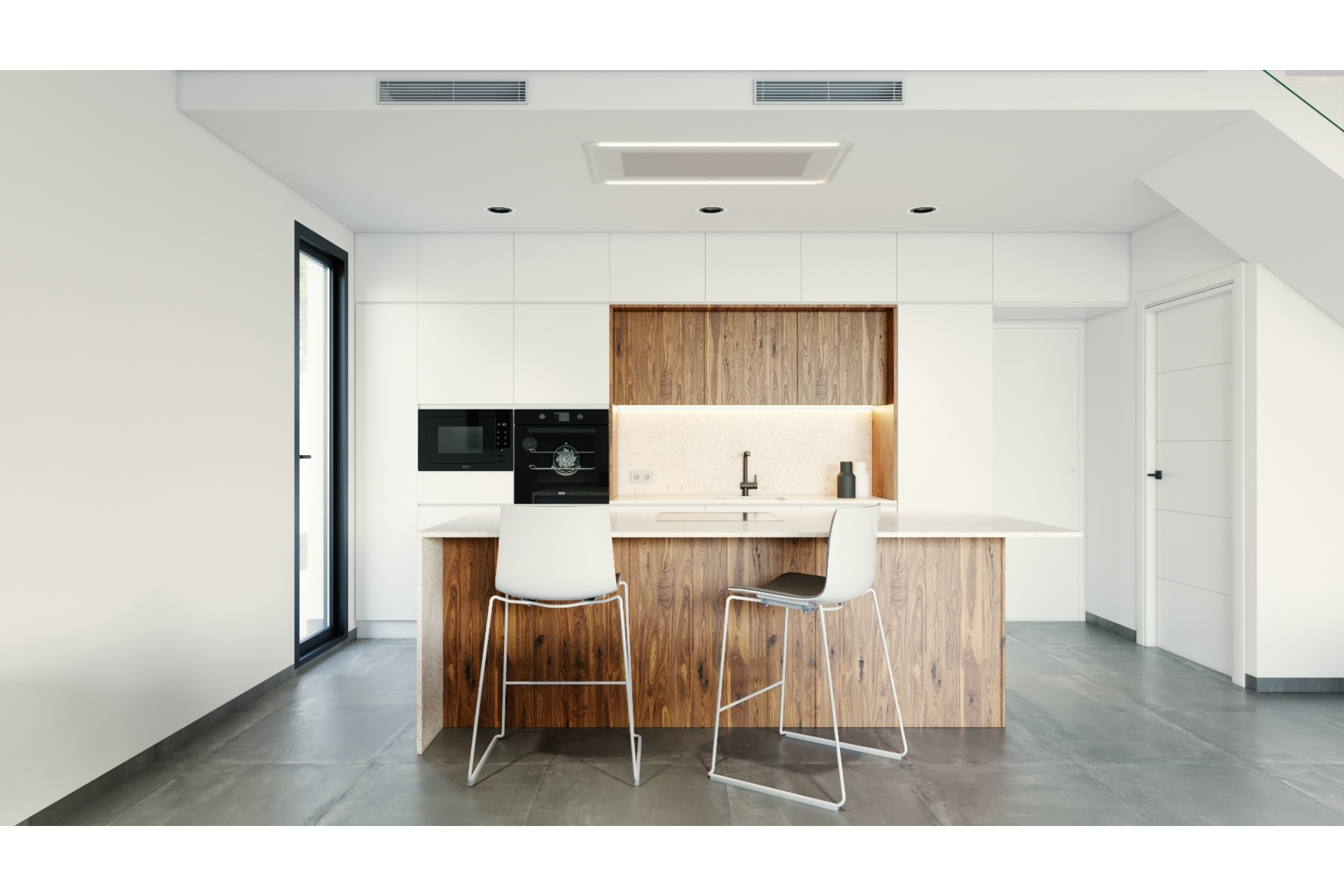 Fully equipped kitchen: Integrated refrigerator. Induction cooktop on the island, exhaust fan built into the ceiling. Raised oven and microwave. Integrated dishwasher.