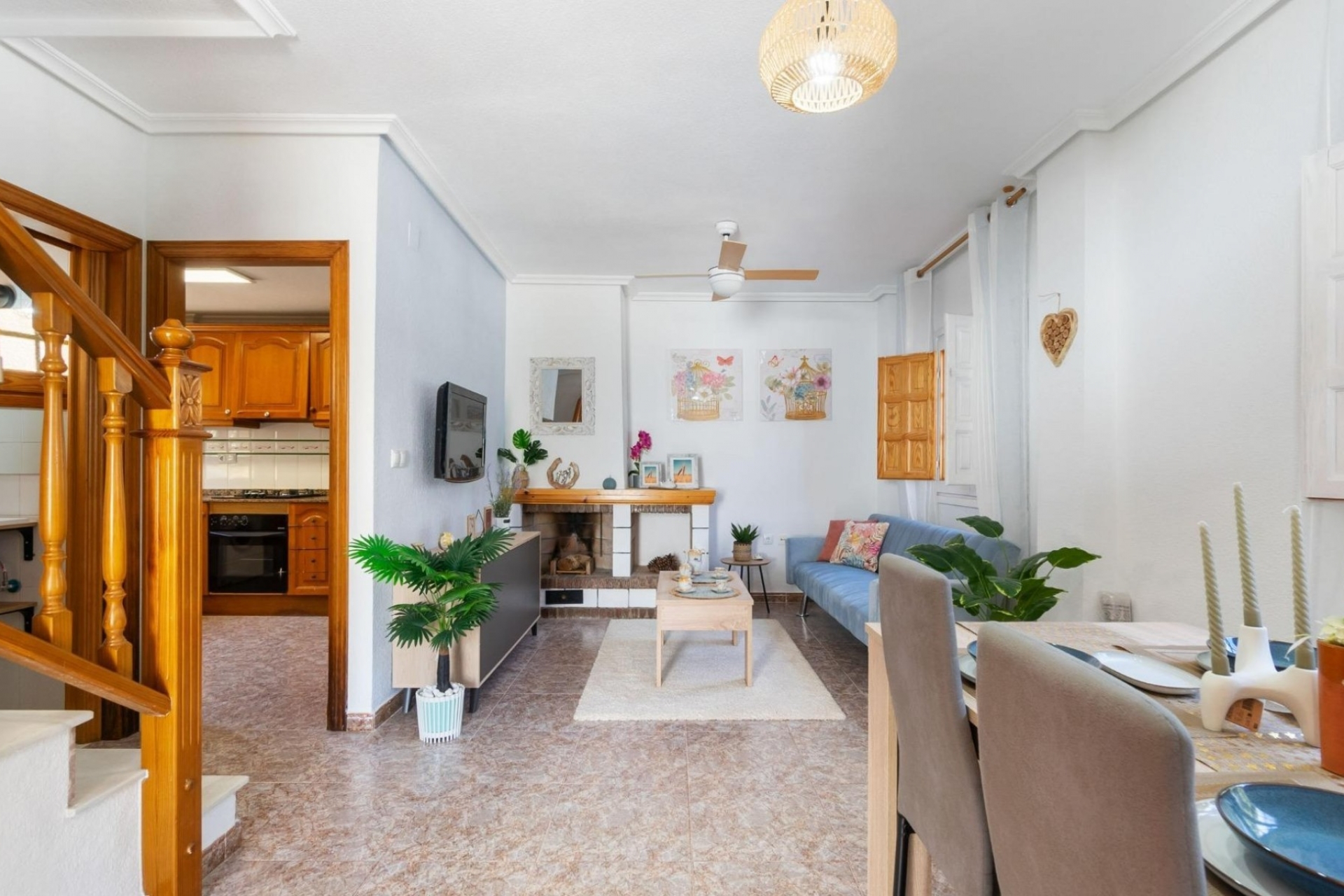 The living room with dining area is spacious and bright, with a cozy fireplace that will infuse a warm atmosphere.