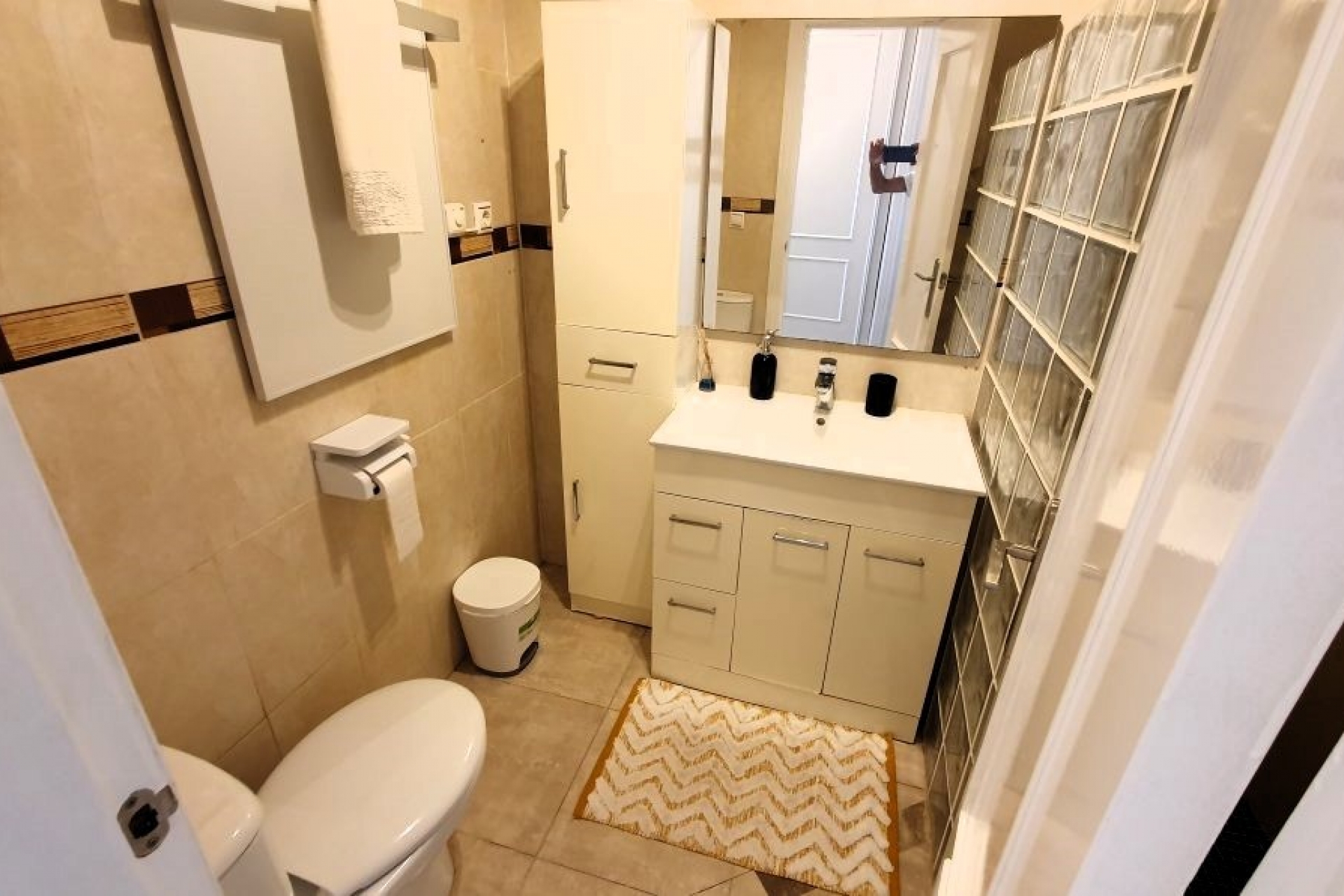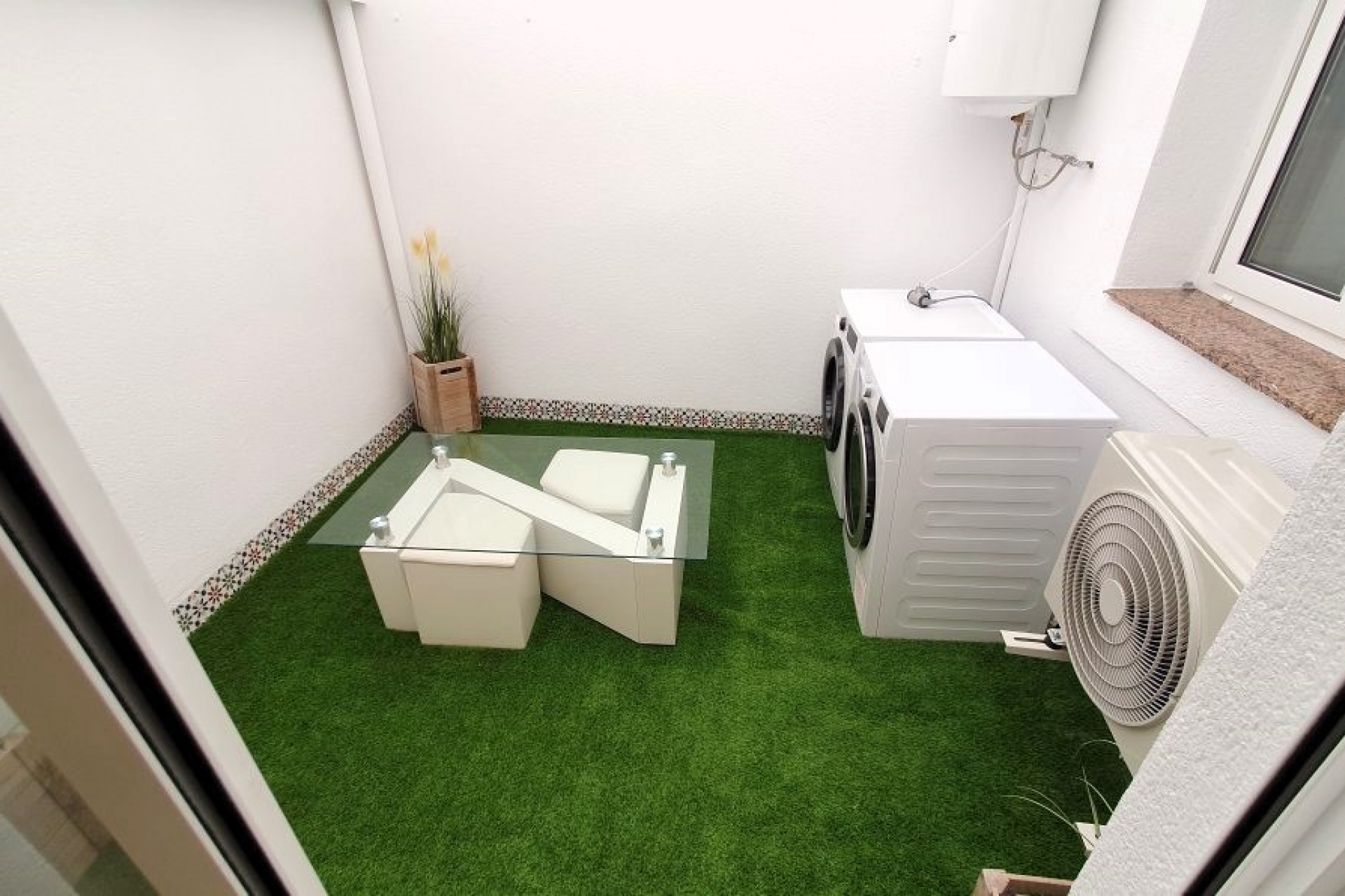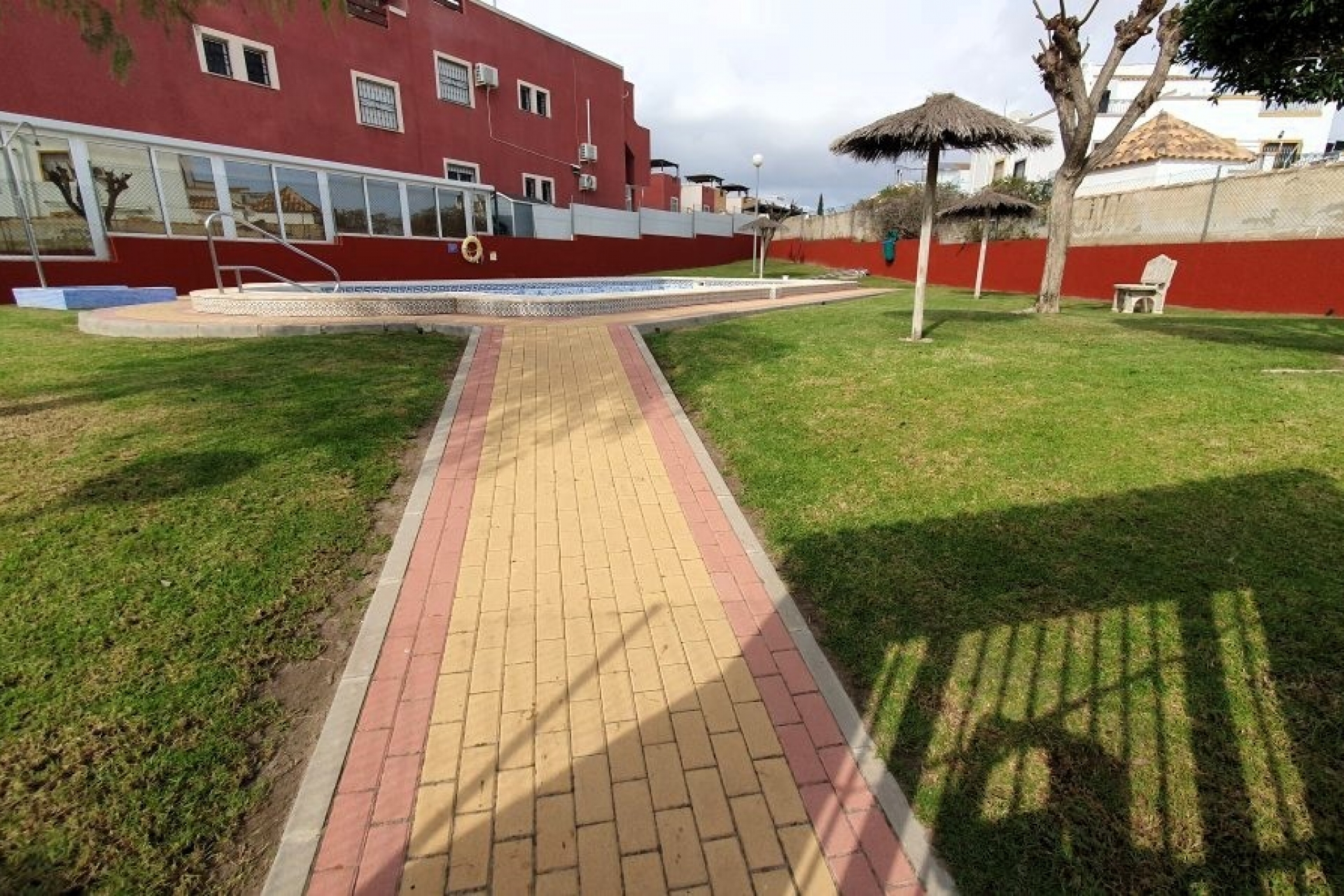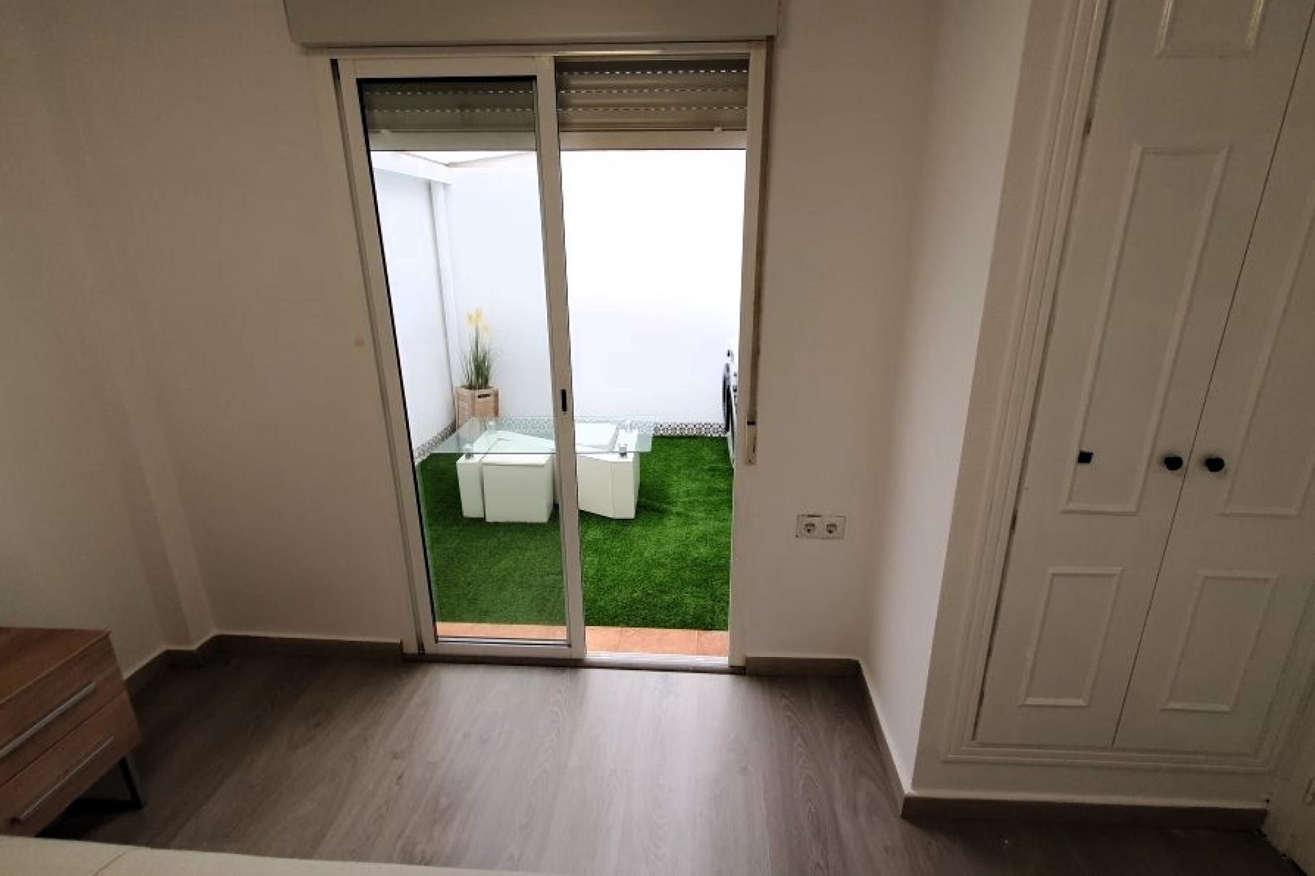 The property consists of a large front patio, a large entrance hall, a living/dining room, a large fully equipped open plan kitchen, 2 bedrooms with built-in closets, a complete bathroom, a hallway with various storage areas and an interior patio.