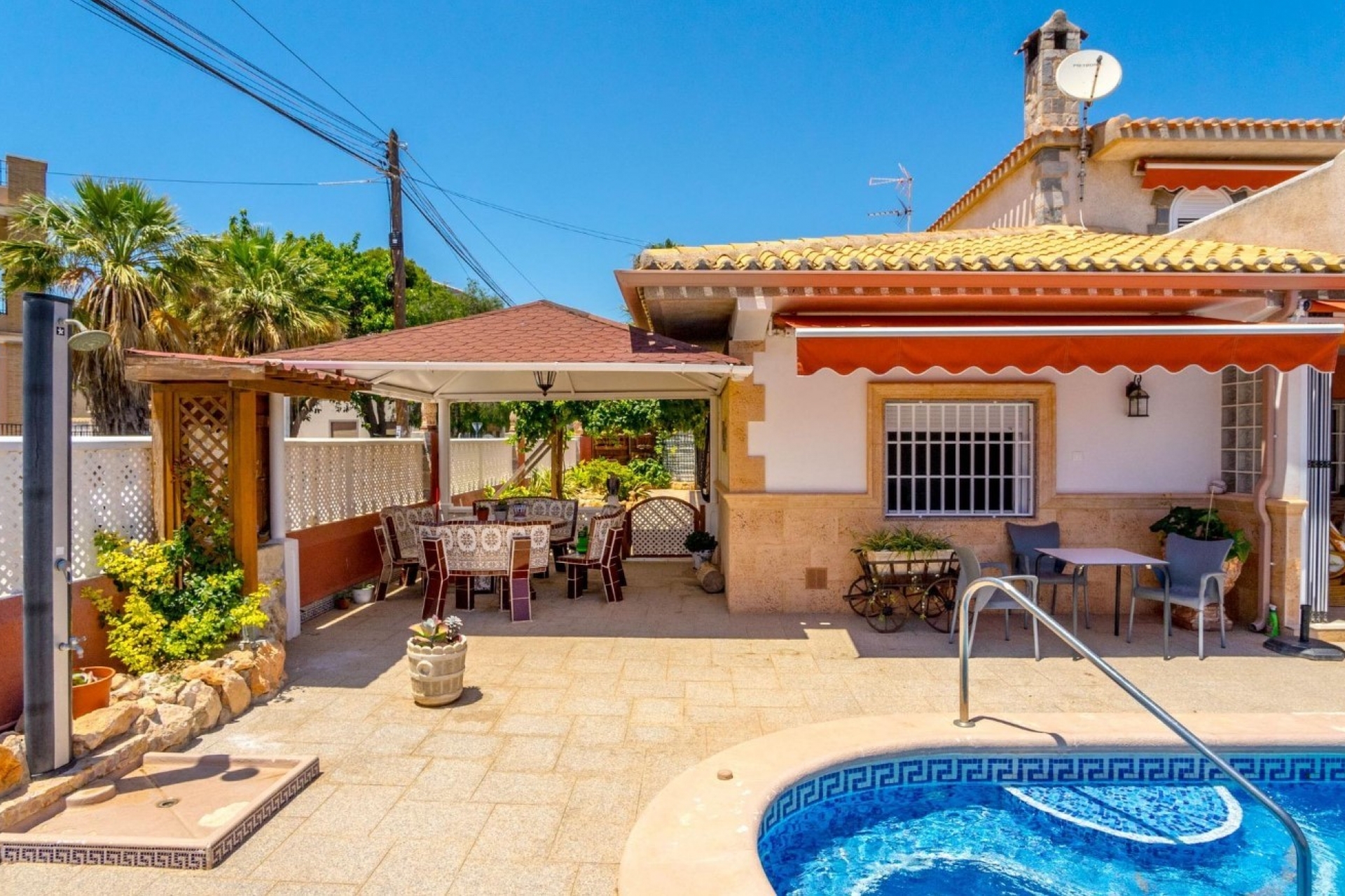 Junto a la gran piscina privada un lugar para relajarse.