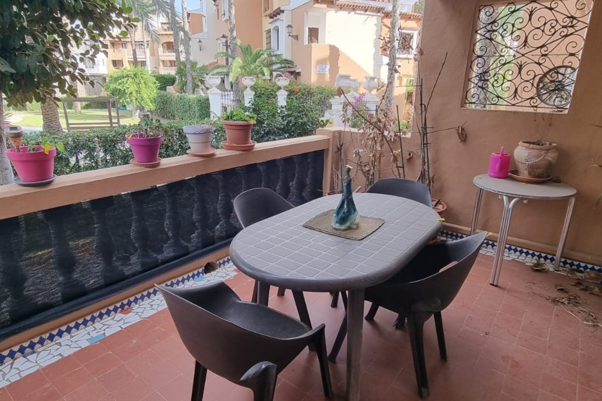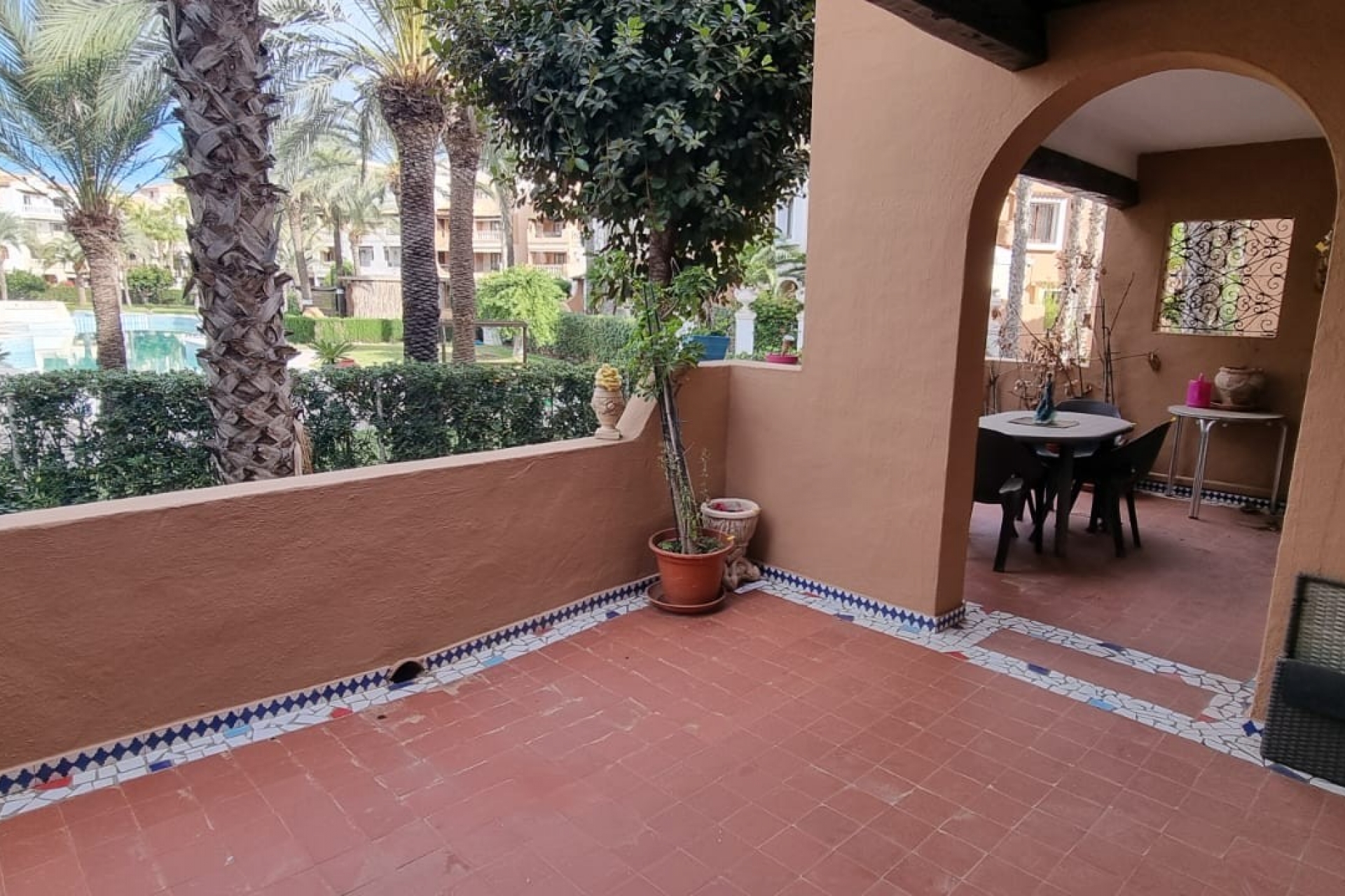 Una magnífica urbanización con exuberantes jardines y piscina. De estilo completamente español.