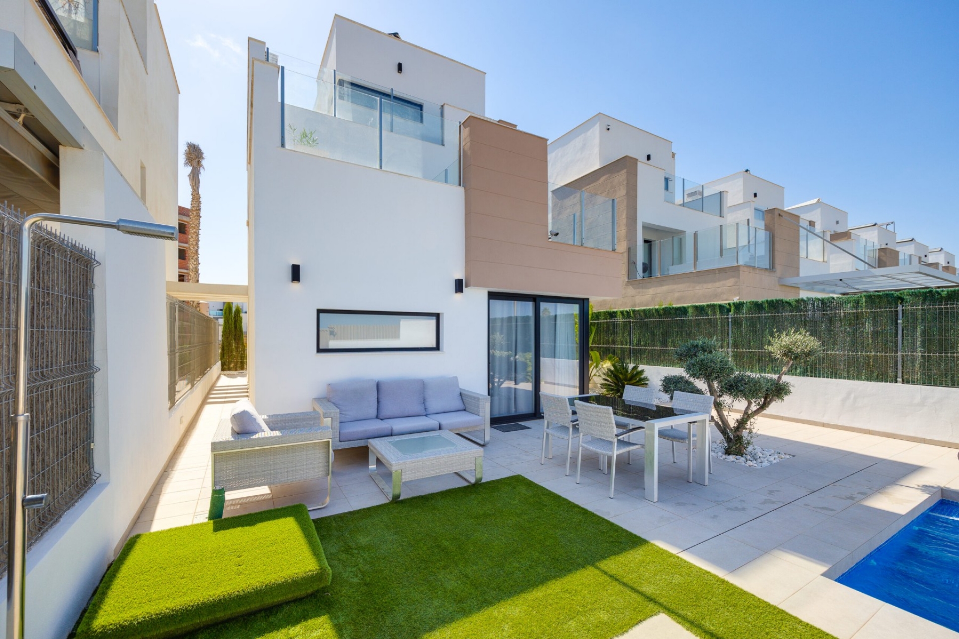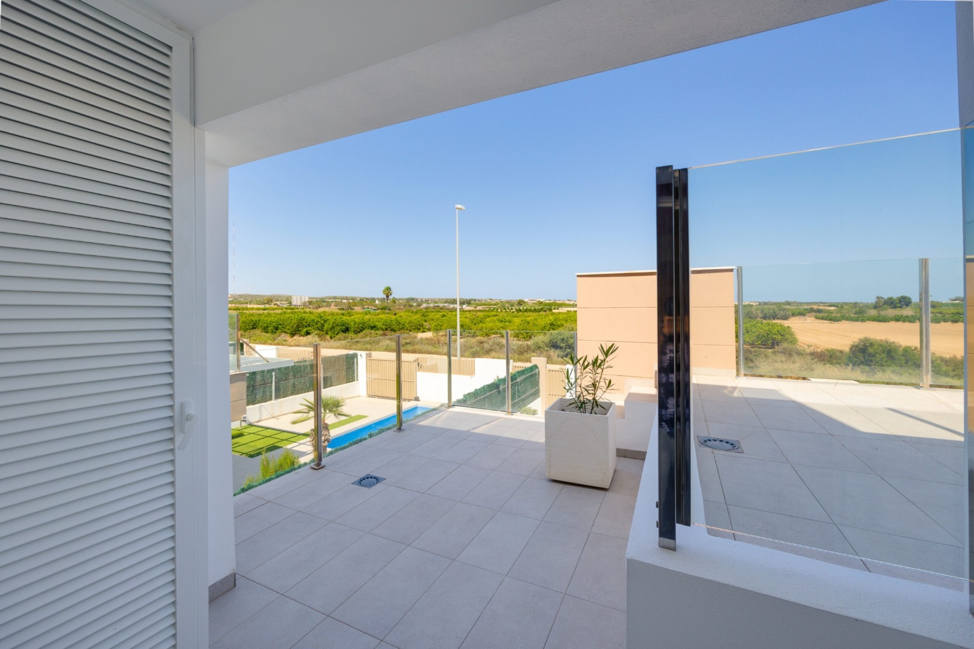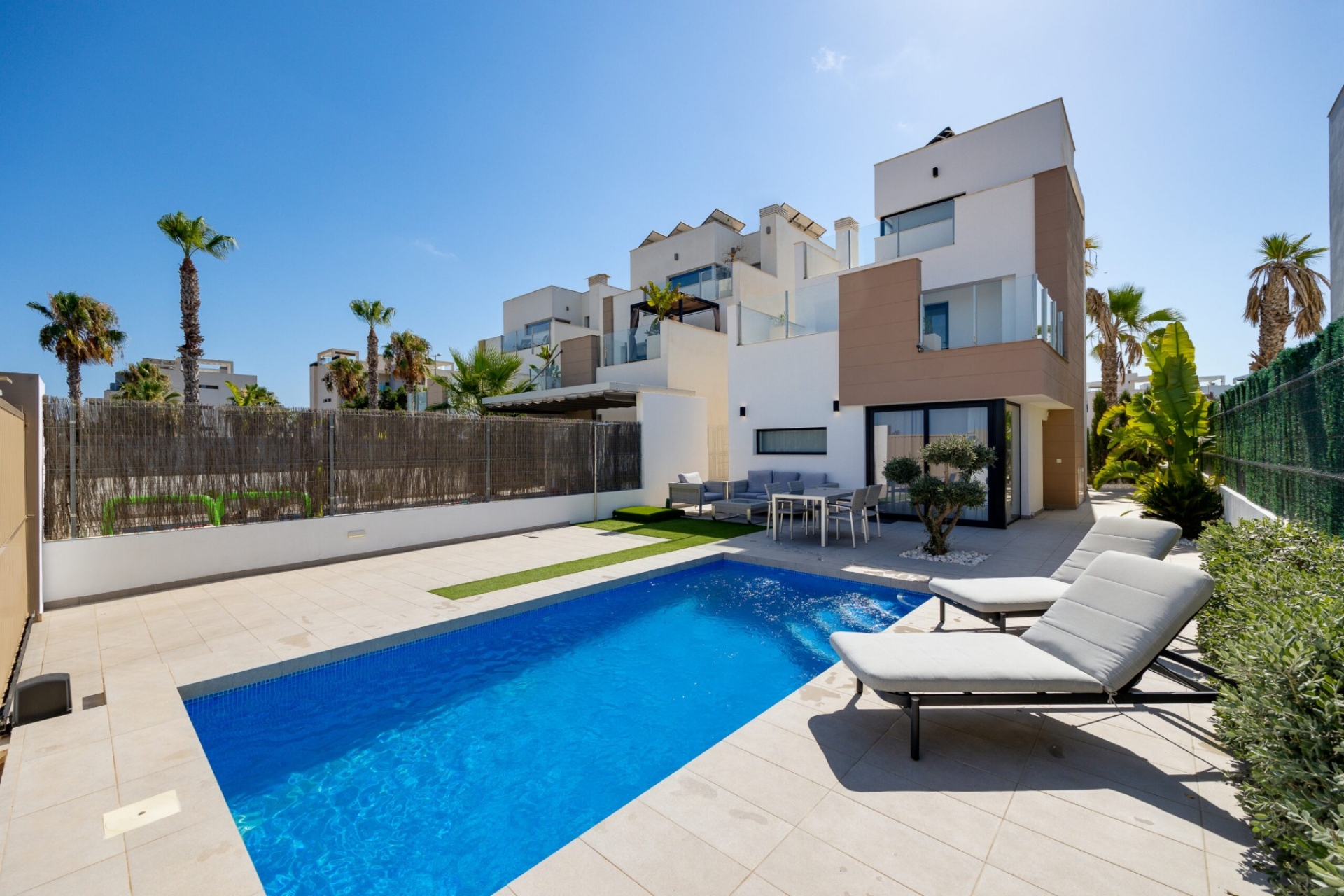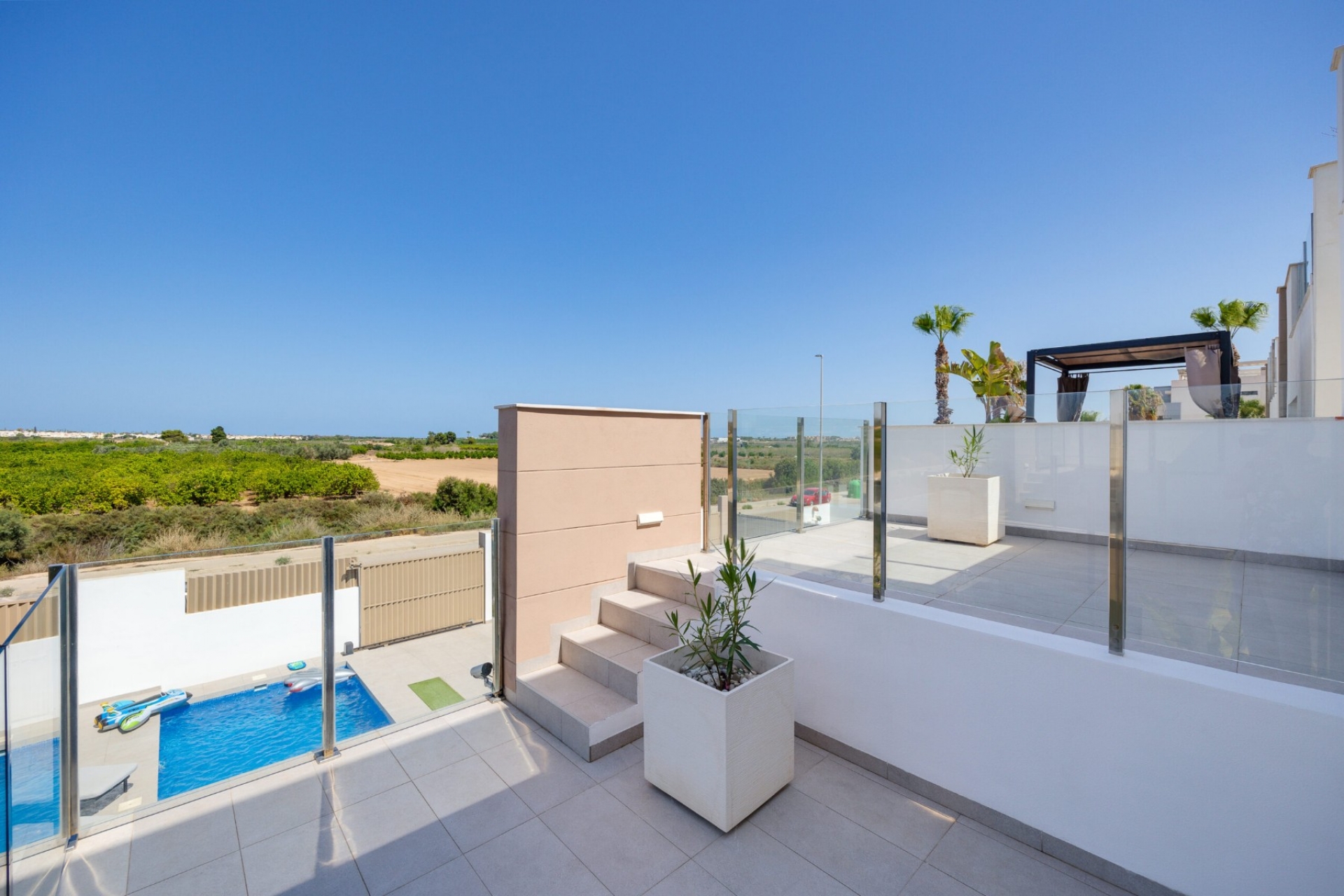 Impresionante villa moderna ubicada en Guardamar del Segura, que ofrece 178 m² de elegante espacio habitable. La propiedad cuenta con 3 amplios dormitorios, 3 baños, tres terrazas y un solárium privado en la azotea, ideal para relajarse o disfrutar con invitados mientras se contemplan vistas abiertas a la naturaleza.