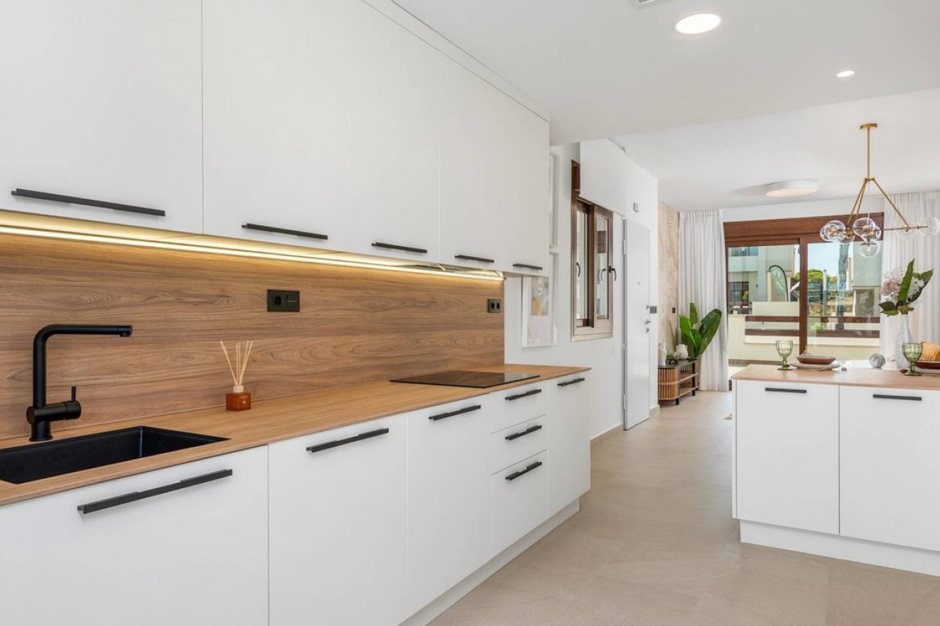 Los interiores de la vivienda se integran con la hermosa fachada gracias a las puertas acristaladas y a los grandes ventanales. Le sorprenderá la moderna cocina abierta con barra americana, un salón-comedor luminoso y multifuncional, 2 dormitorios llenos de confort y 2 baños con ducha de los más altos estándares.