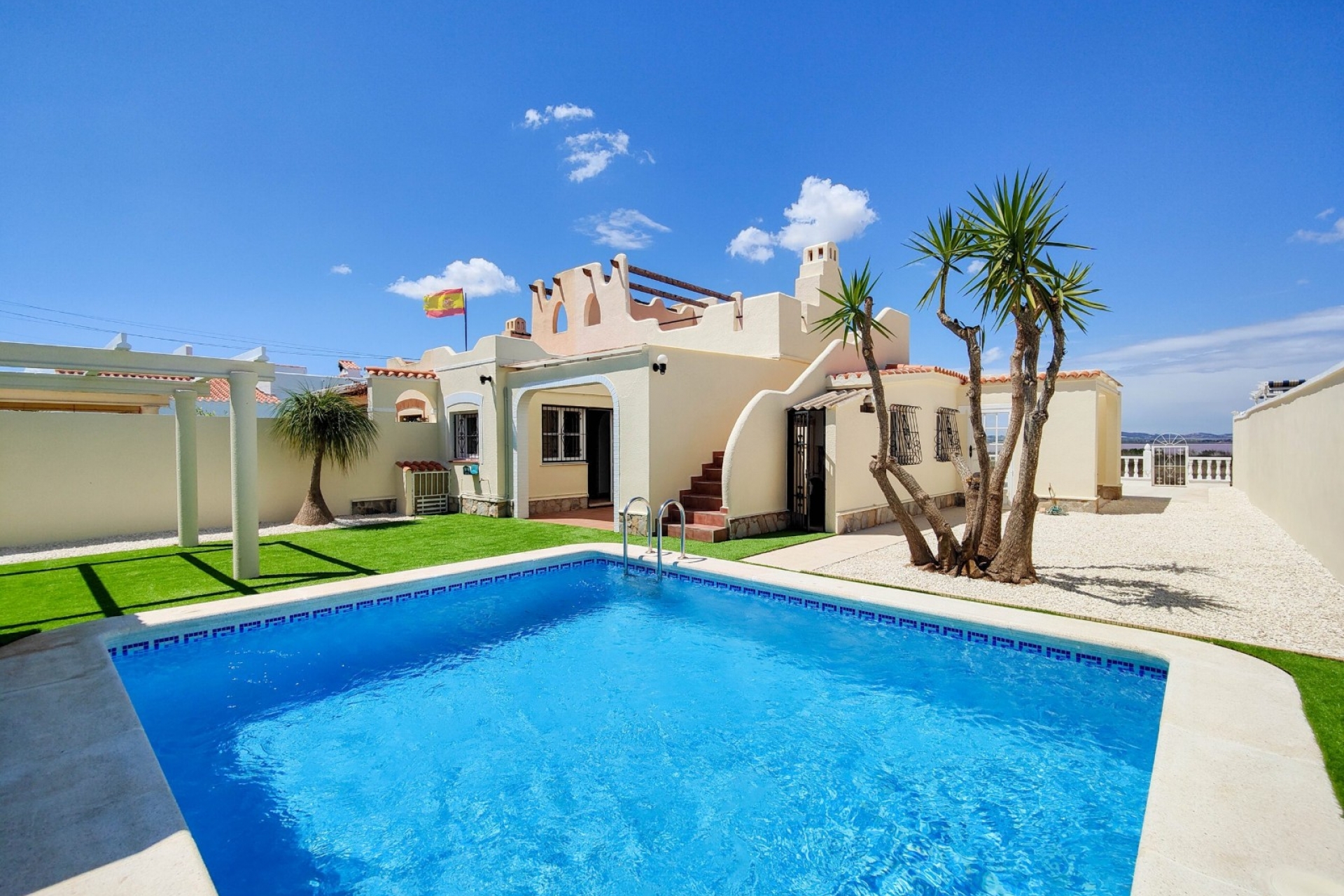 El espacio exterior de esta villa es simplemente increíble. En la parte delantera de la propiedad hay aparcamiento fuera de la carretera, una piscina recientemente renovada, un gran trastero y una terraza cubierta con vistas a la piscina. Al lado hay un trastero donde se encuentra la caldera de agua. En la parte trasera de la propiedad hay otra terraza cubierta y un jardín en forma de L con vistas a los lagos de sal. También hay un amplio solarium.